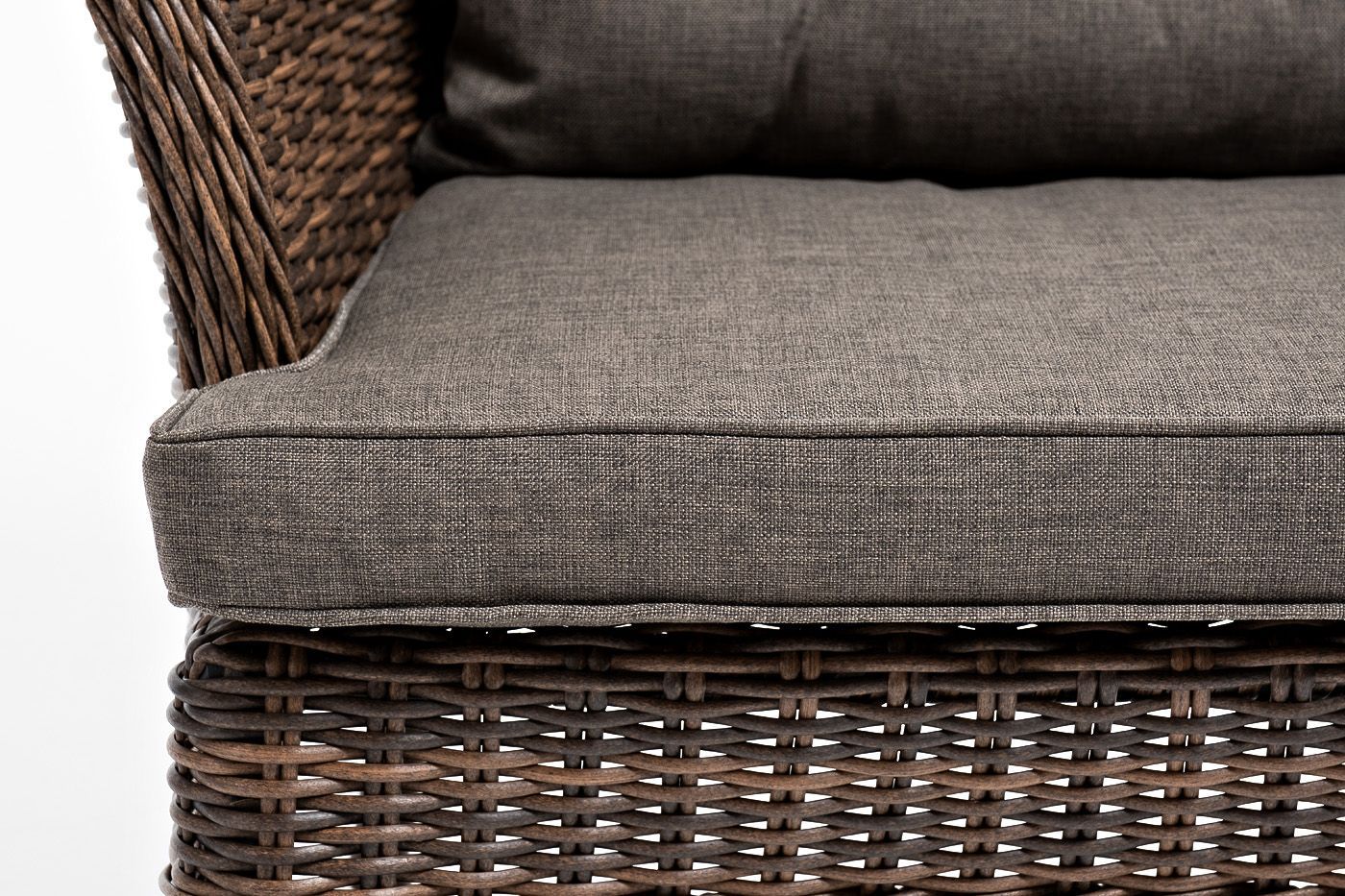 В садовое кресло укомплектовывается мягкими подушками. Они пошиты из износостойкого полиэстера серо-коричневого оттенка с плотностью 230гр/м2. Защитные свойства синтетического материала усиливаются благодаря влагоотталкивающей пропитке.
