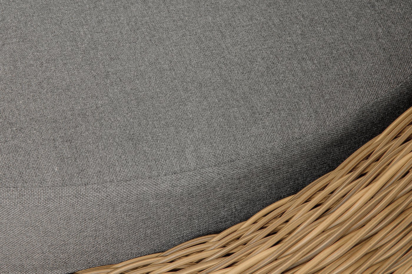В комплекте с уличным ротанговым креслом идут мягкие подушки со съёмными чехлами серо-коричневого оттенка. Они пошиты из полиэстера, который не боится повышенной влажности благодаря наличию влагоотталкивающей пропитки. Плотность ткани составляет 230гр/м2.