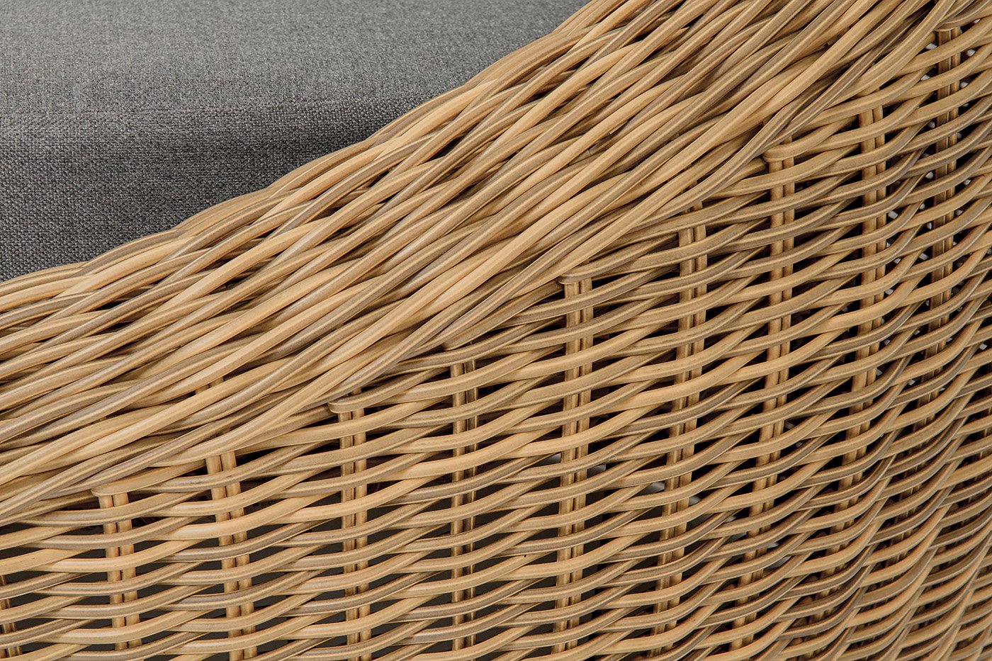 Надежность и износостойкость мебели гарантирует каркас, который сделан из качественного алюминия. Ее дополняет ручное плетение, при изготовлении которого используется искусственный ротанг. Представлена модель в соломенном цвете.