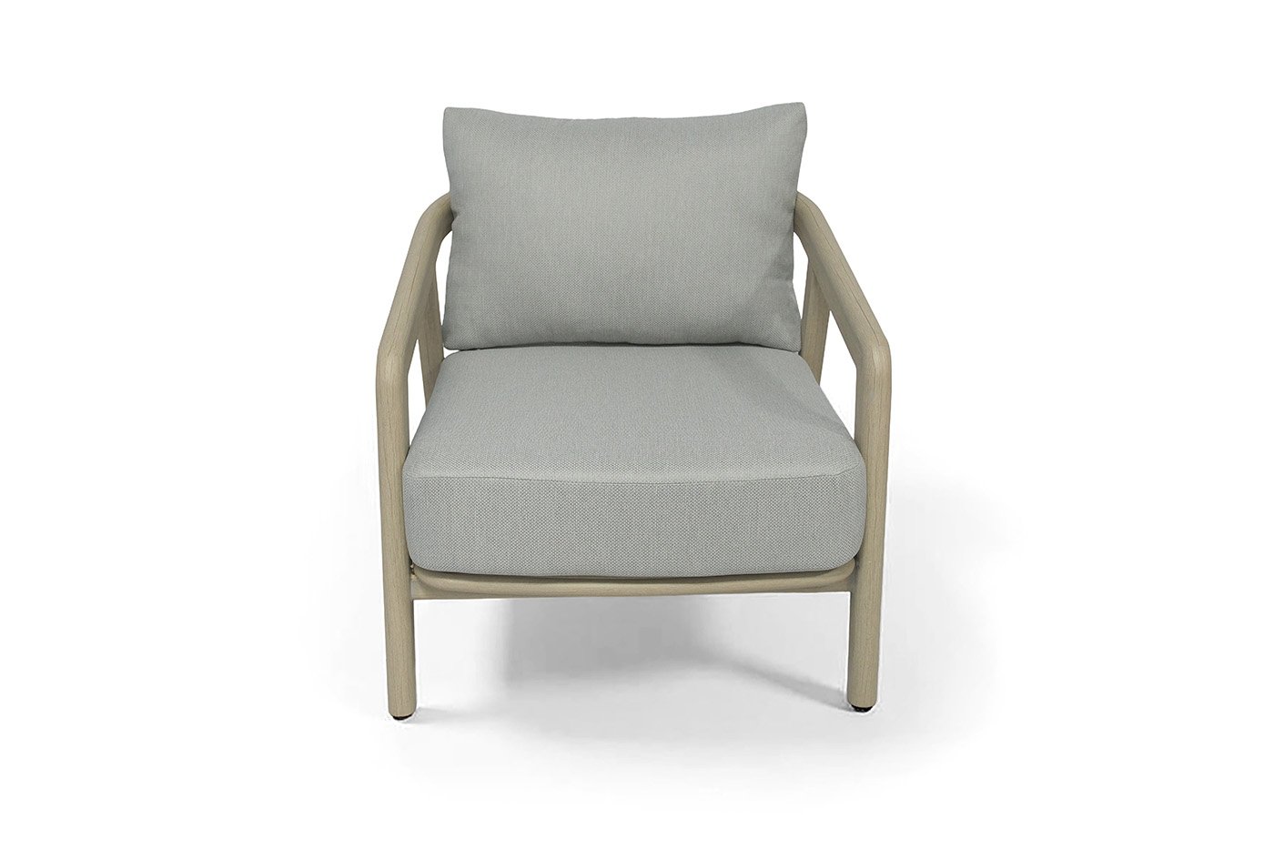 Прочный, но легкий алюминиевый каркас, стилизованный под холодное бежевое дерево - гарантирует долгий срок службы и надежность. Изящная оплетка из круглого искусственного ротанга серого цвета, напоминающая натуральное плетение, дарит неповторимую текстуру и приятные тактильные ощущения, создавая атмосферу мягкости и тепла.