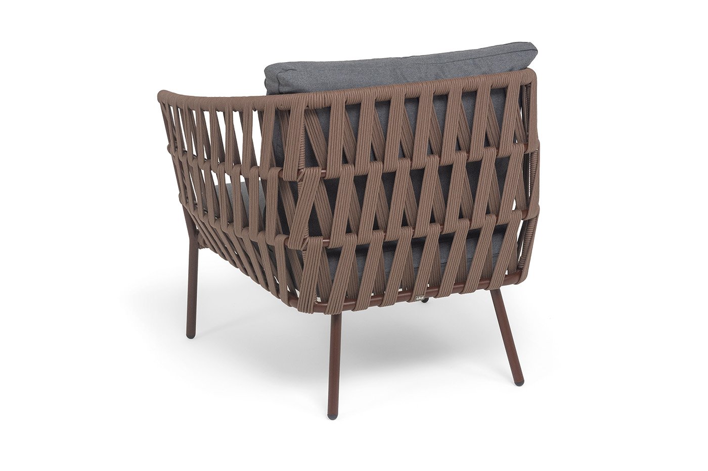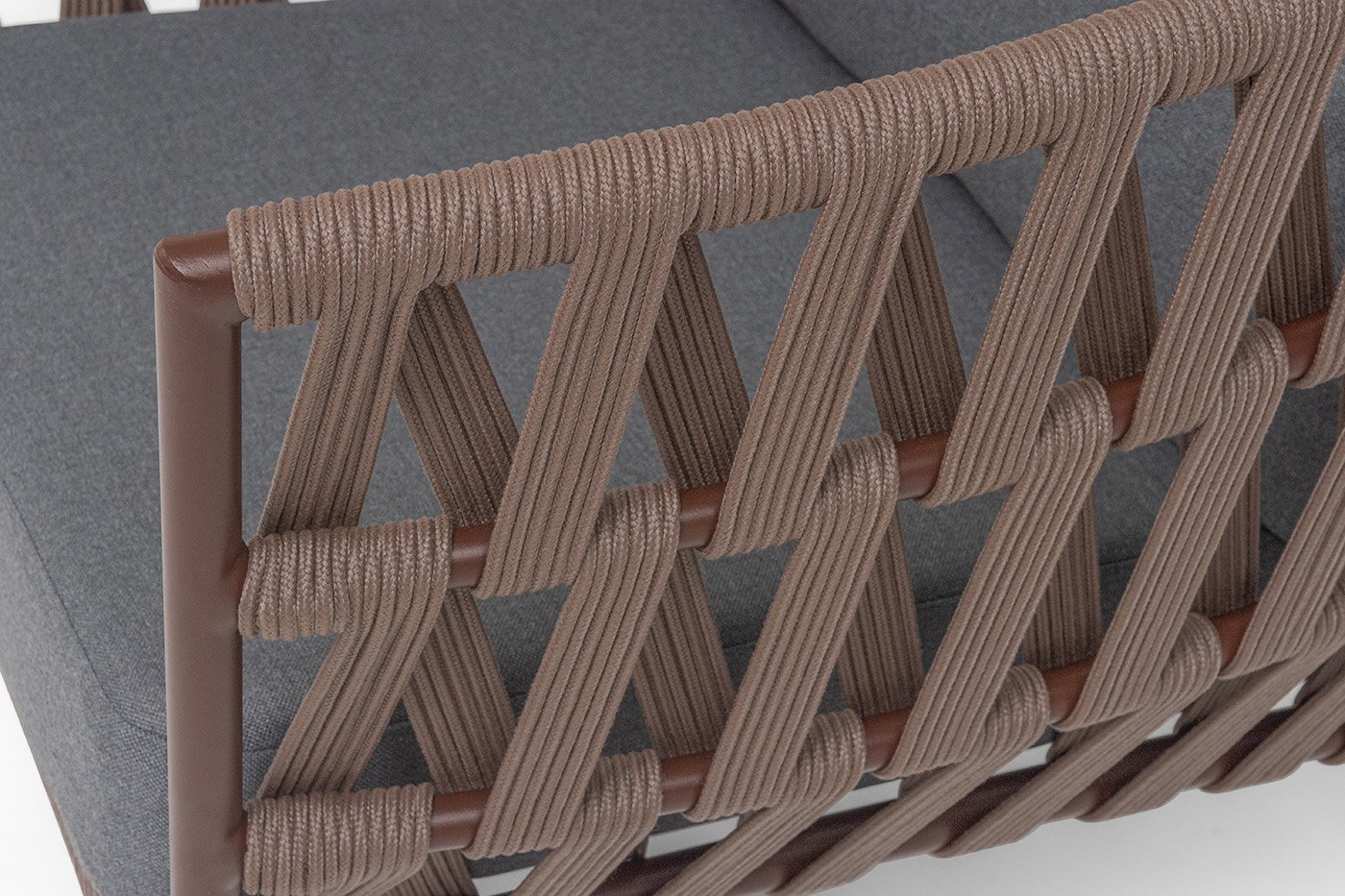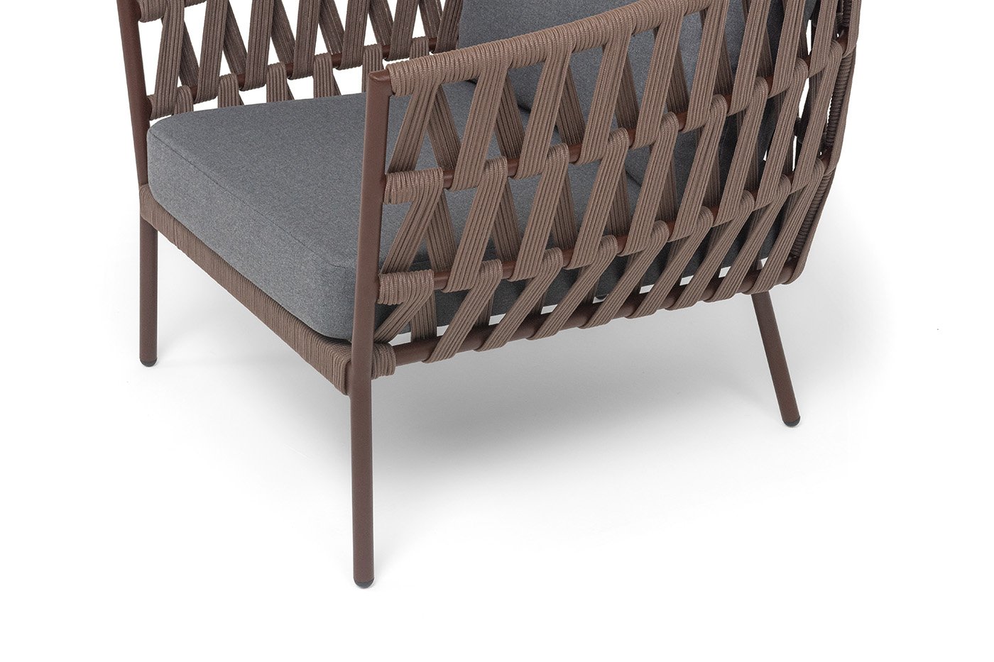 Кресло имеет алюминиевый каркас, окрашенный порошковой краской в коричневый (RAL8016) цвет. Боковины каркаса вручную оплетены роупом - эластичными синтетическими лентами, изготовленными из высокопрочных полиэфирных волокон. Цвет оплетки - коричневый.