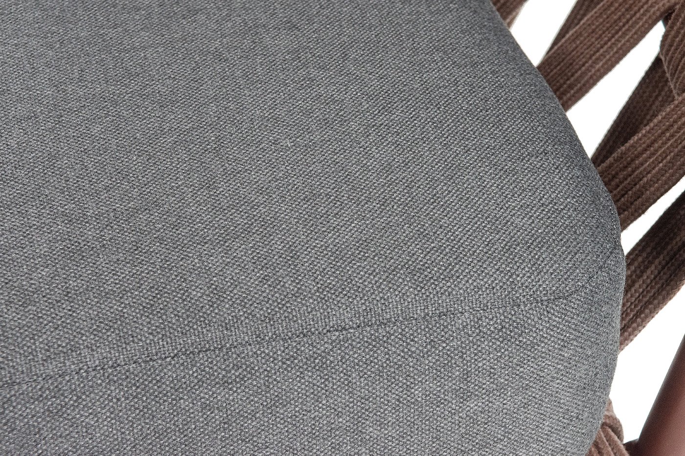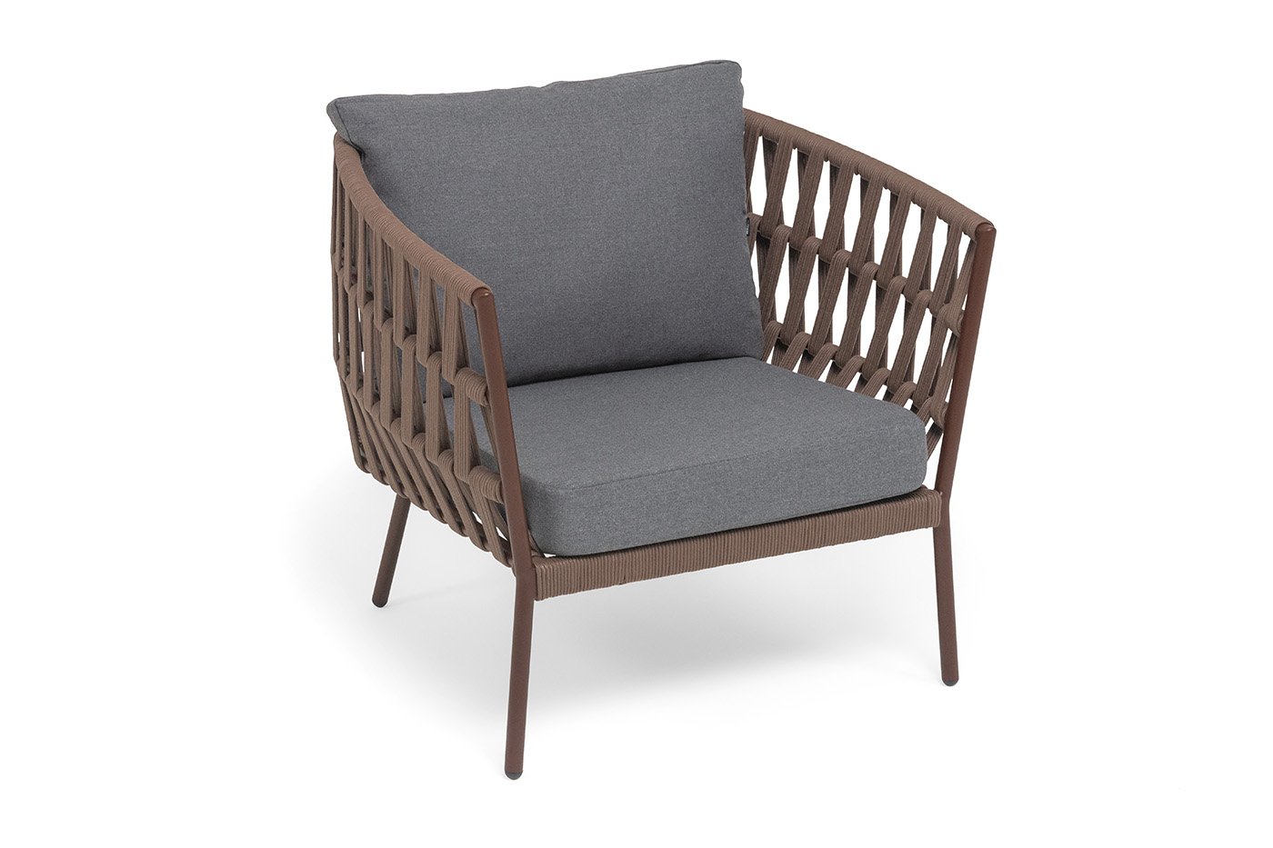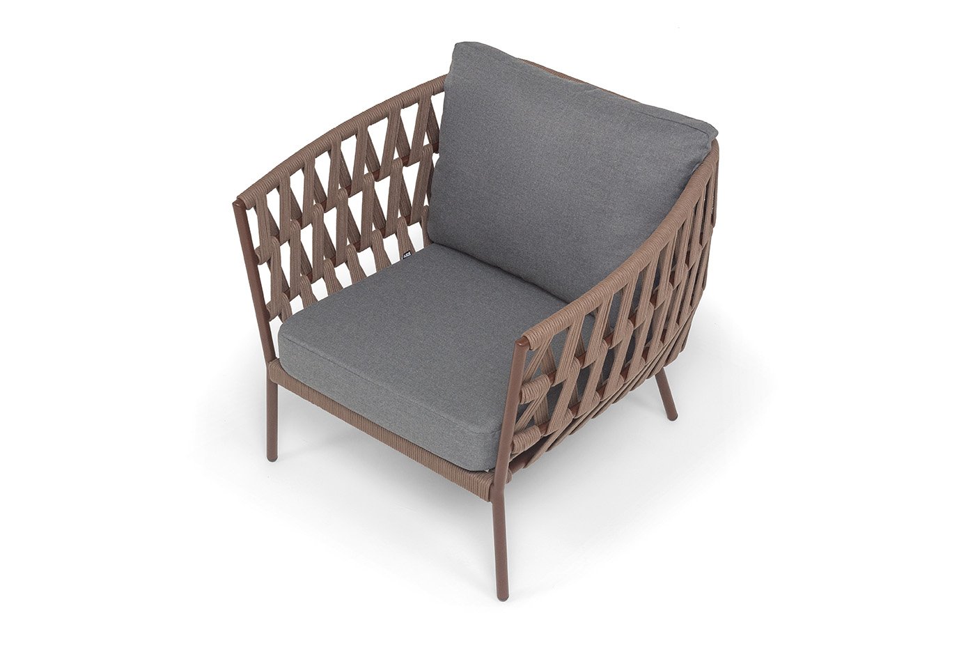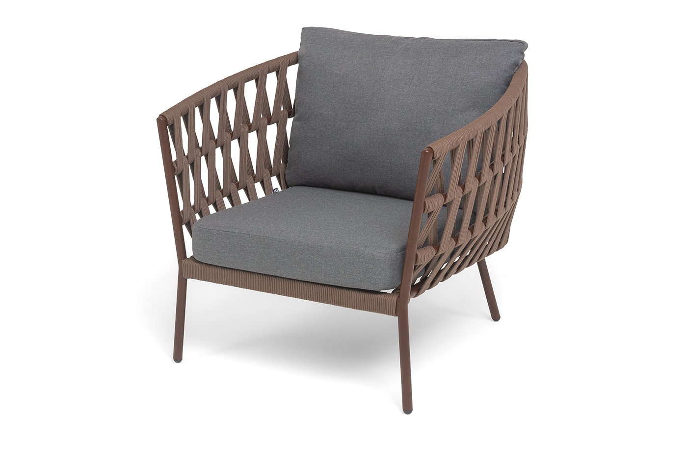 Кресло имеет алюминиевый каркас, окрашенный порошковой краской в коричневый (RAL8016) цвет. Боковины каркаса вручную оплетены роупом - эластичными синтетическими лентами, изготовленными из высокопрочных полиэфирных волокон. Цвет оплетки - коричневый.