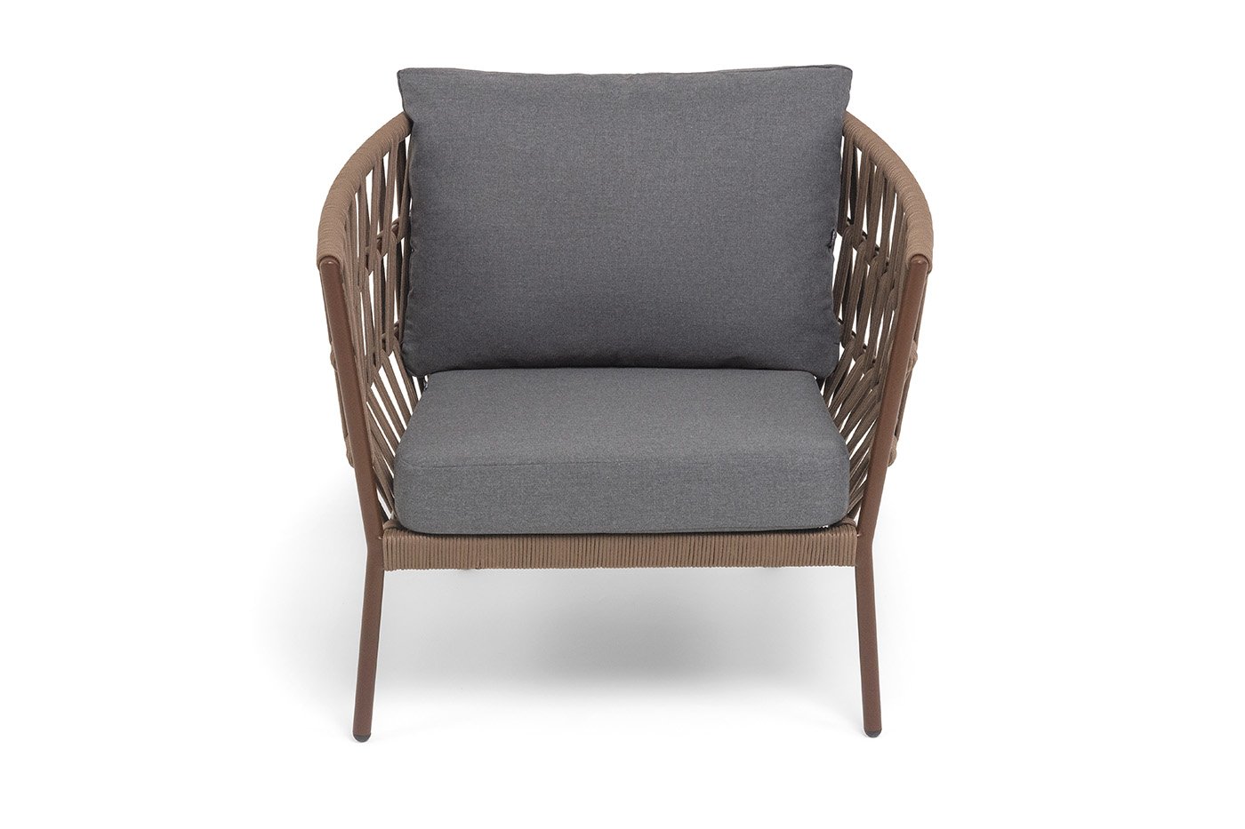 Кресло имеет алюминиевый каркас, окрашенный порошковой краской в коричневый (RAL8016) цвет. Боковины каркаса вручную оплетены роупом - эластичными синтетическими лентами, изготовленными из высокопрочных полиэфирных волокон. Цвет оплетки - коричневый.