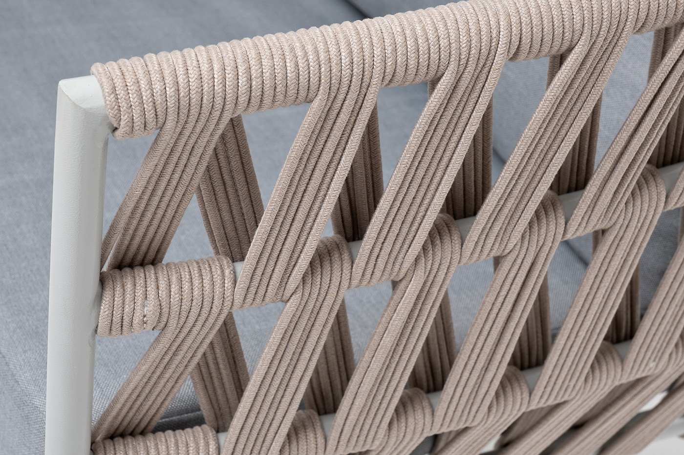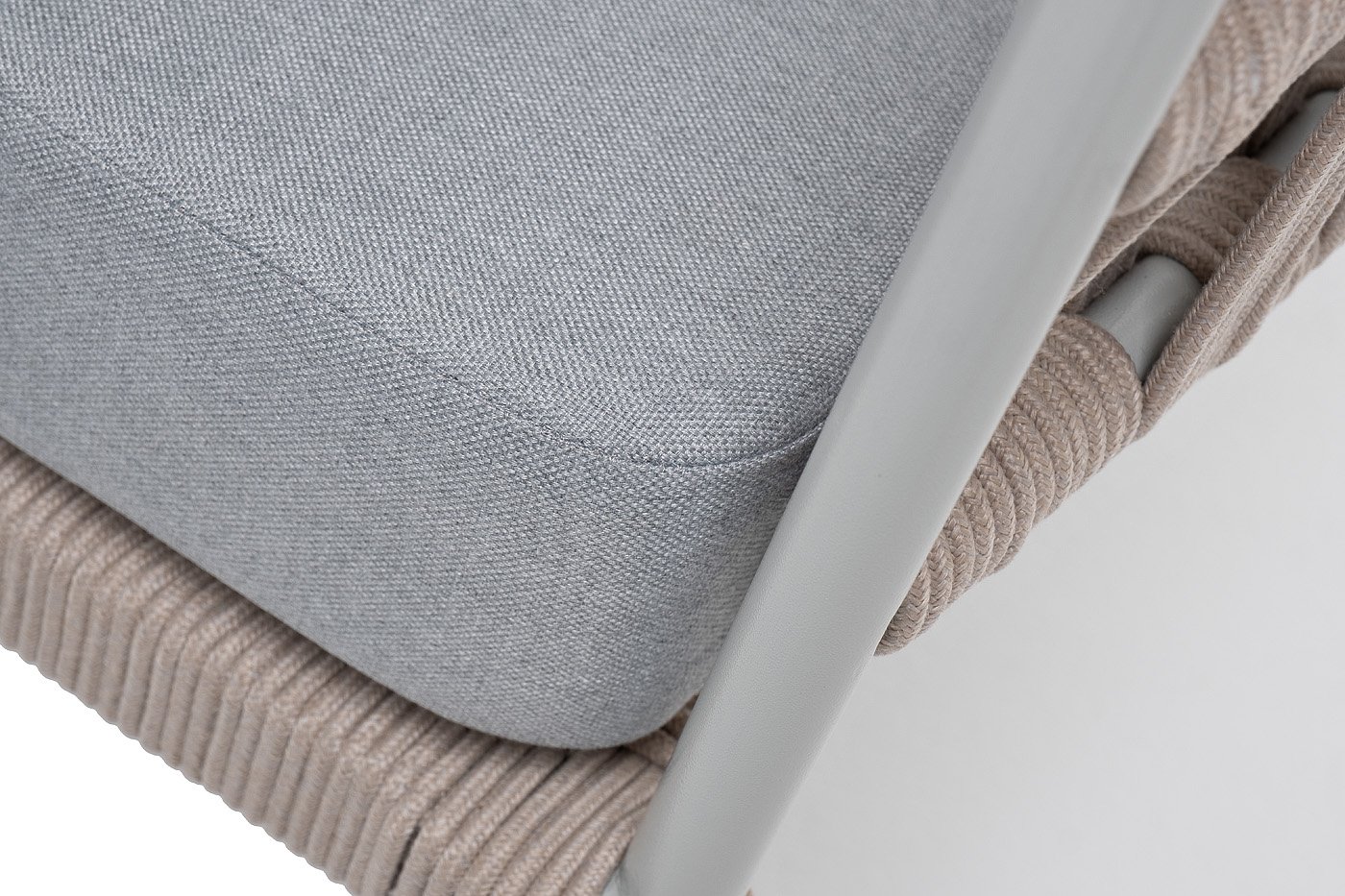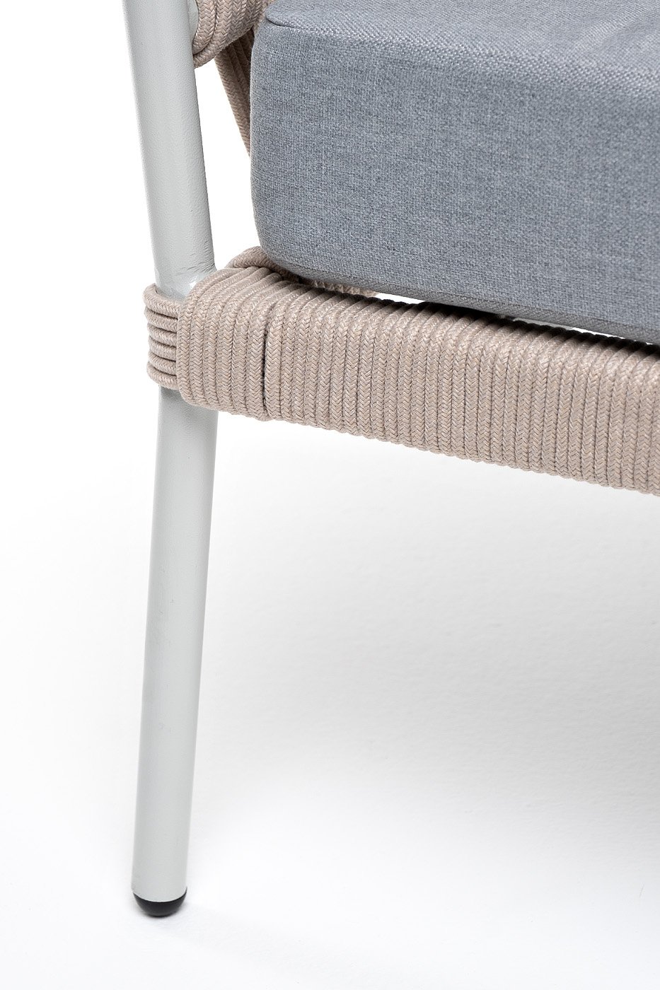Кресло имеет алюминиевый каркас, окрашенный порошковой краской в светло-серый (RAL7035) цвет. Боковины каркаса вручную оплетены роупом - эластичными синтетическими лентами, изготовленными из высокопрочных полиэфирных волокон. Цвет оплетки - бежевый.