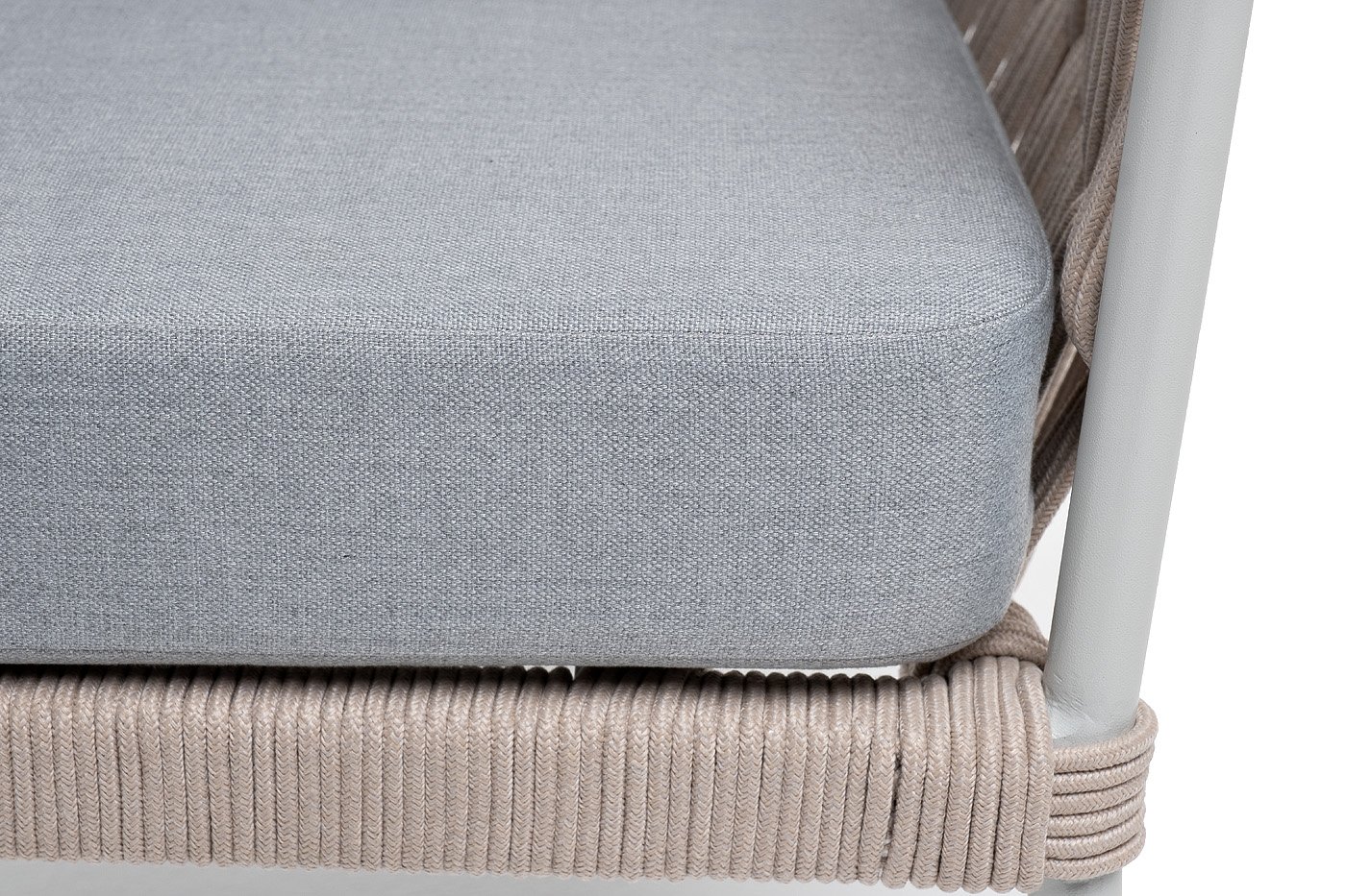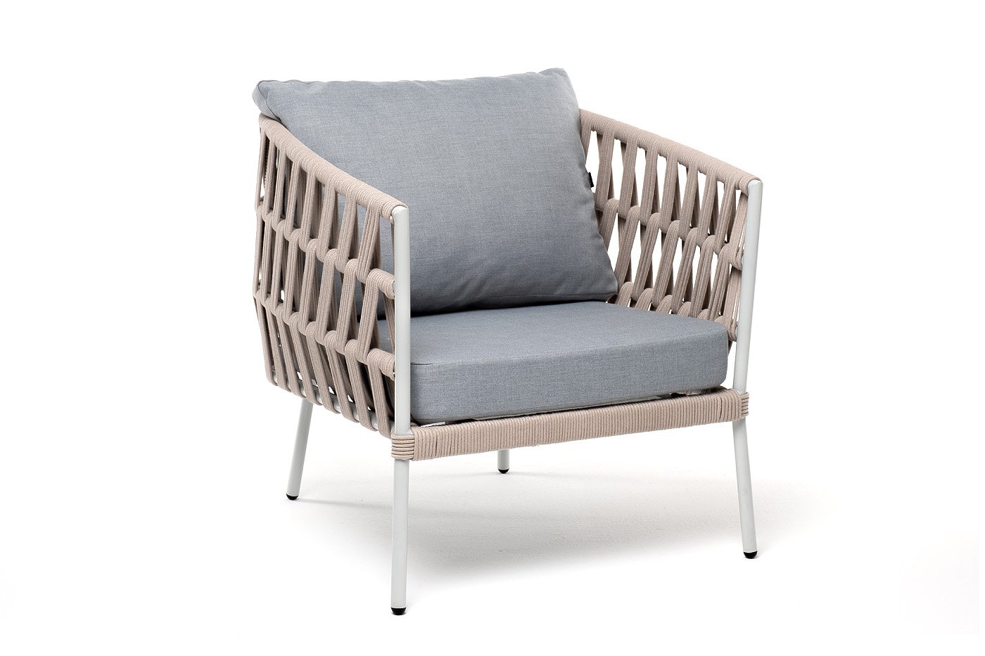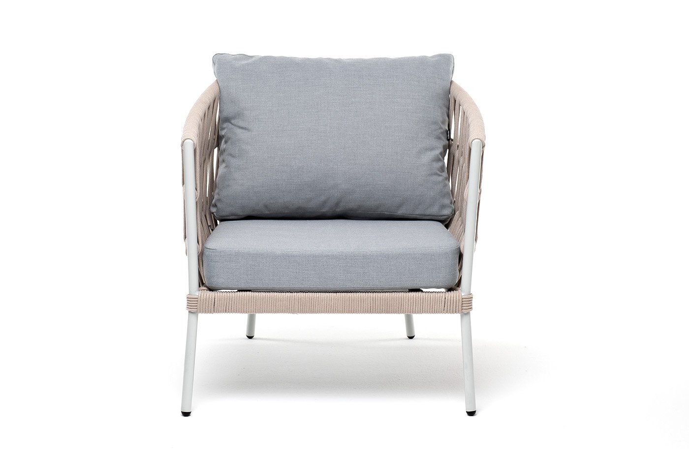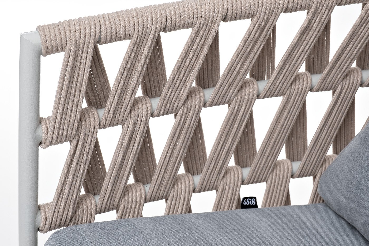 Кресло имеет алюминиевый каркас, окрашенный порошковой краской в светло-серый (RAL7035) цвет. Боковины каркаса вручную оплетены роупом - эластичными синтетическими лентами, изготовленными из высокопрочных полиэфирных волокон. Цвет оплетки - бежевый.