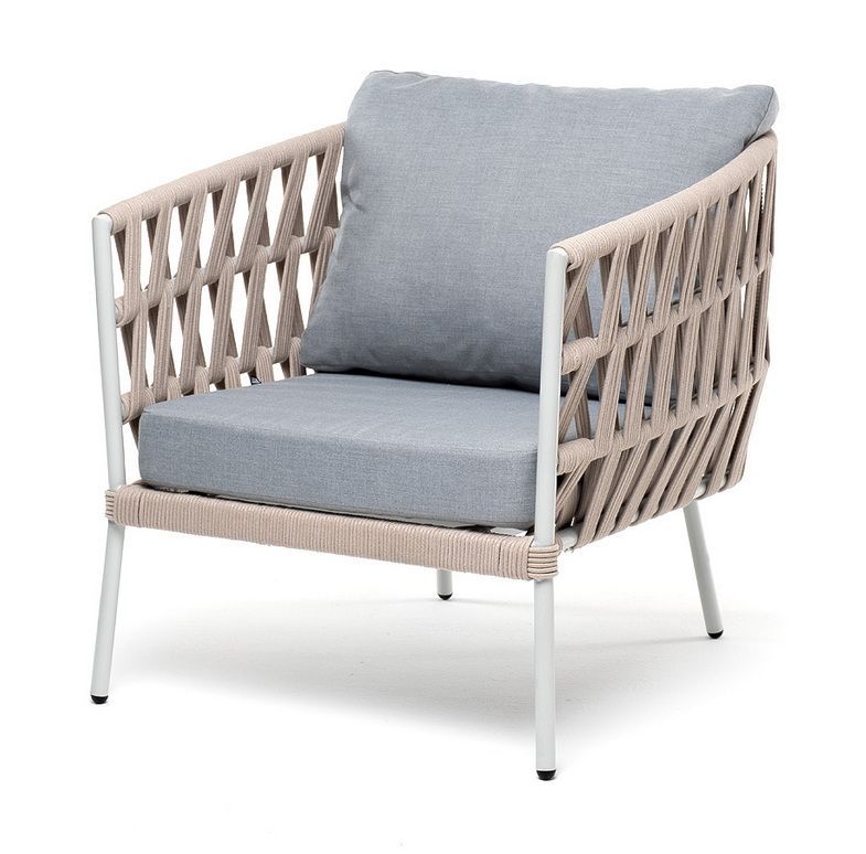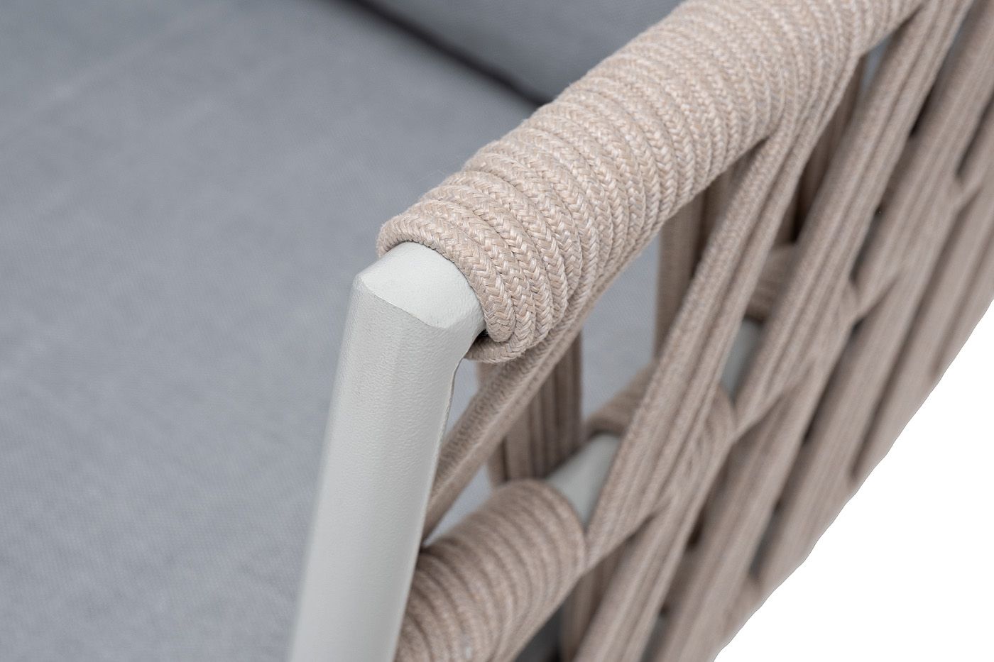 Кресло имеет алюминиевый каркас, окрашенный порошковой краской в светло-серый (RAL7035) цвет. Боковины каркаса вручную оплетены роупом - эластичными синтетическими лентами, изготовленными из высокопрочных полиэфирных волокон. Цвет оплетки - бежевый.