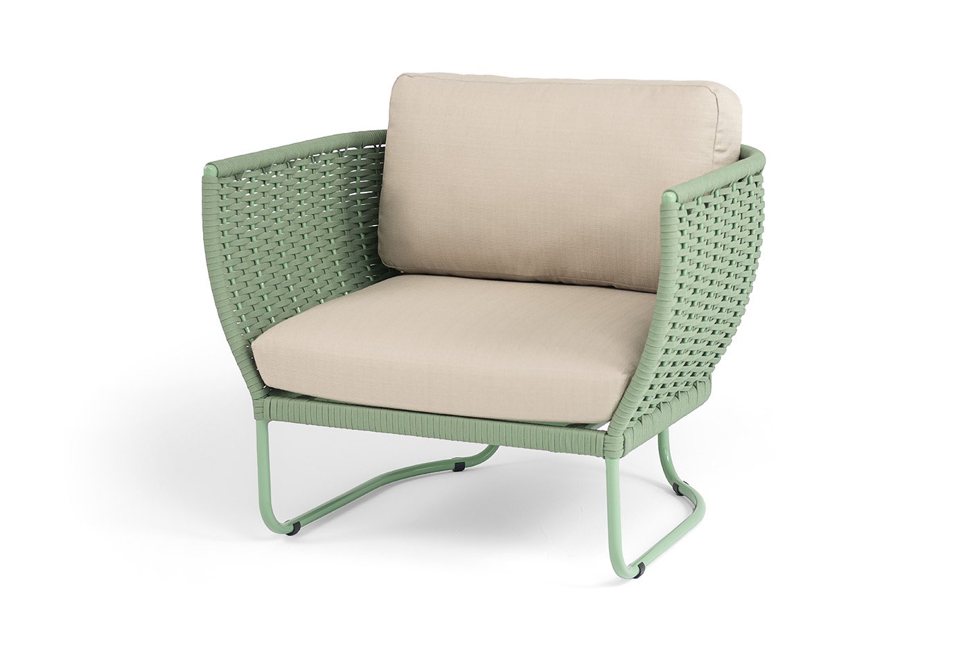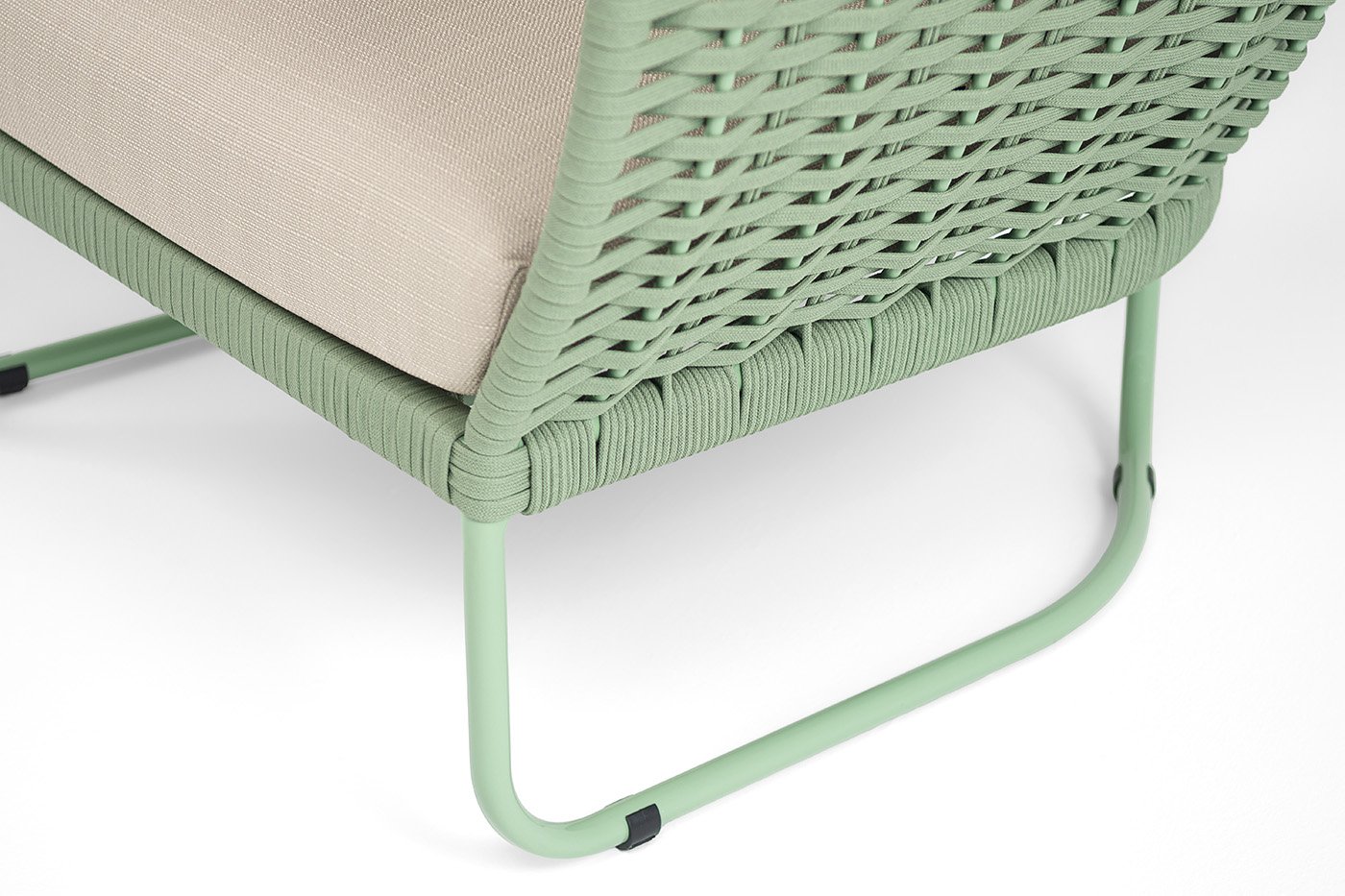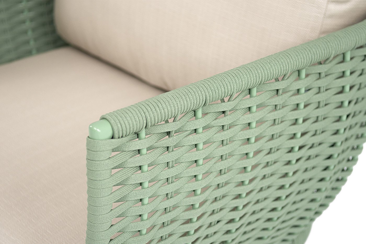 Плетение боковины каркаса вручную оплетены роупом — эластичными синтетическими лентами из высокопрочных полиэфирных волокон. Оплетка - зеленый круглый и плоский tex, что придает креслу изысканный и оригинальный внешний вид.