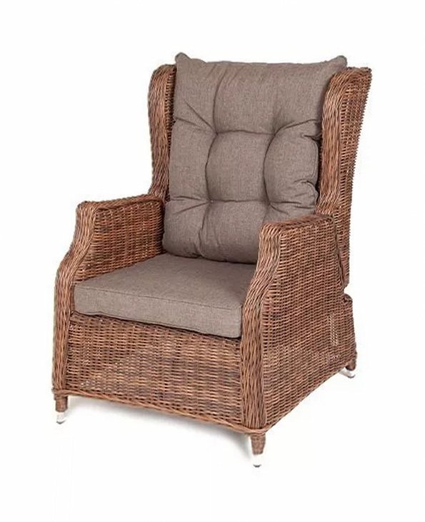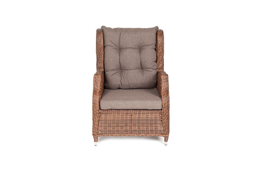 Модель обладает мягкими подушками из полиэстера серо-коричневого оттенка, устойчивого к намоканию благодаря влагоотталкивающей пропитке. Физические параметры: 730×830×1015 мм.