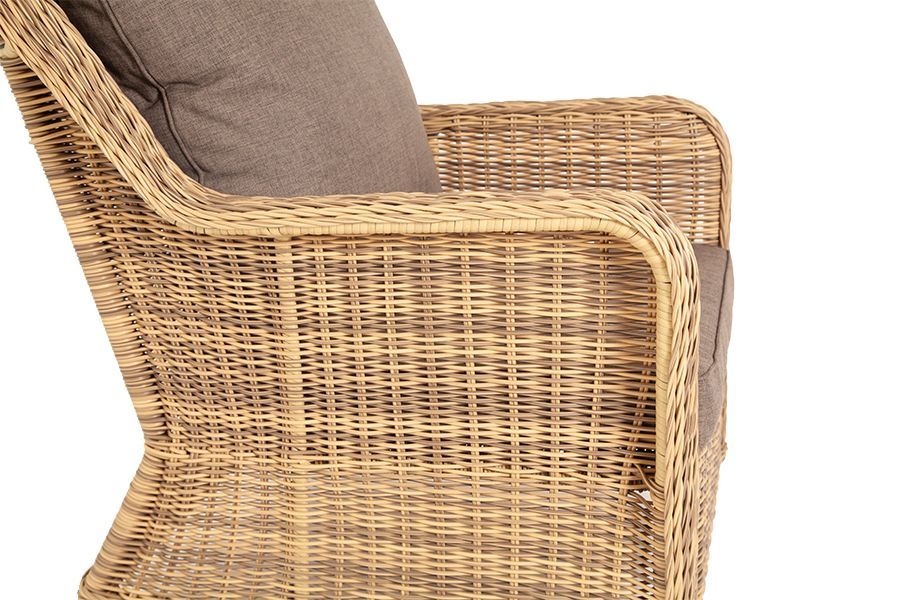 Садовое кресло укомплектовано удобными серо-коричневыми подушками. Полиэстер используется при пошиве тканевых изделий, плотность которого - 230гр/м2. Материал имеет обязательную влагоотталкивающую пропитку для усиления его защитных свойств.