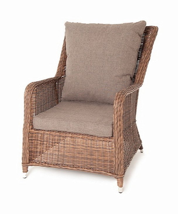 Кресло оснащено каркасом из прочного алюминия, а его оплетка выполнена из круглого искусственного ротанга ручного плетения коричневого цвета.