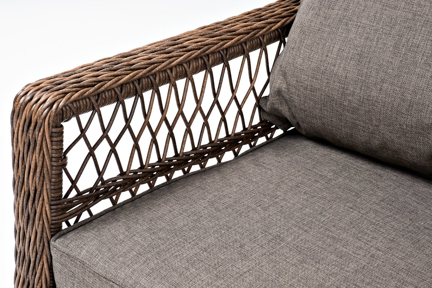 Кресло изготовлена из устойчивого алюминиевого каркаса. Искусственный ротанг украшает мебель в качестве круглого ручного плетения. Оно представлено в коричневом цвете.