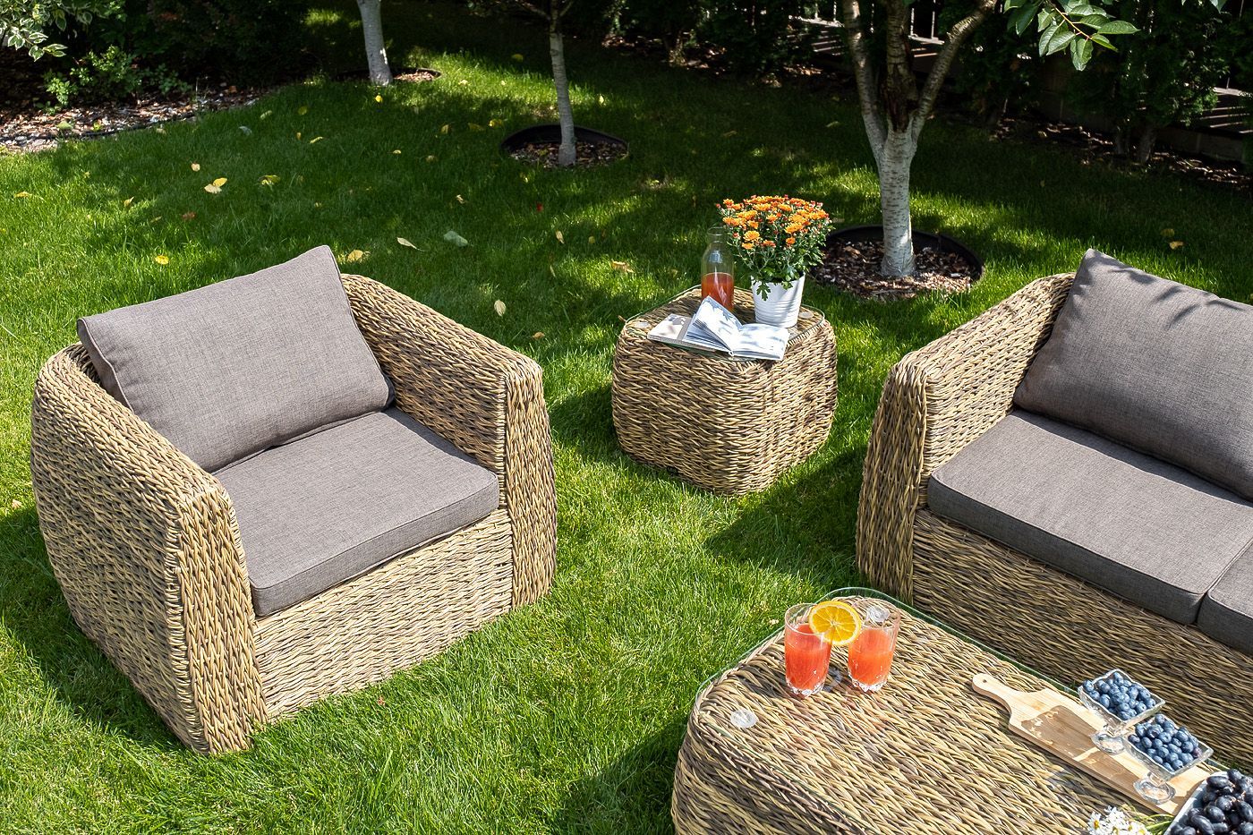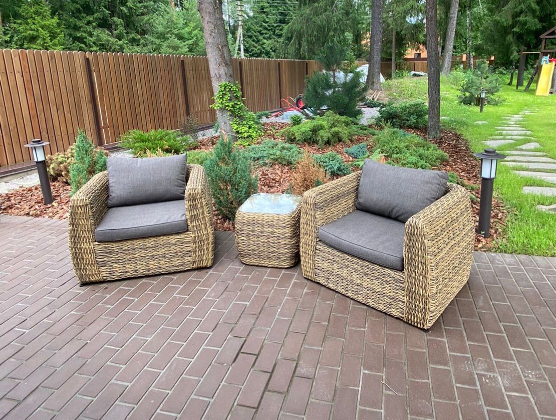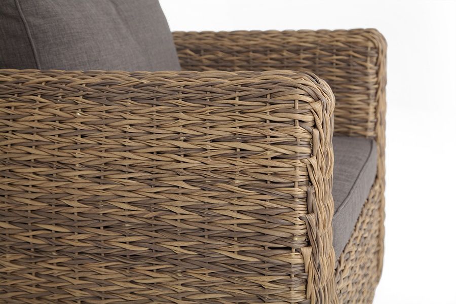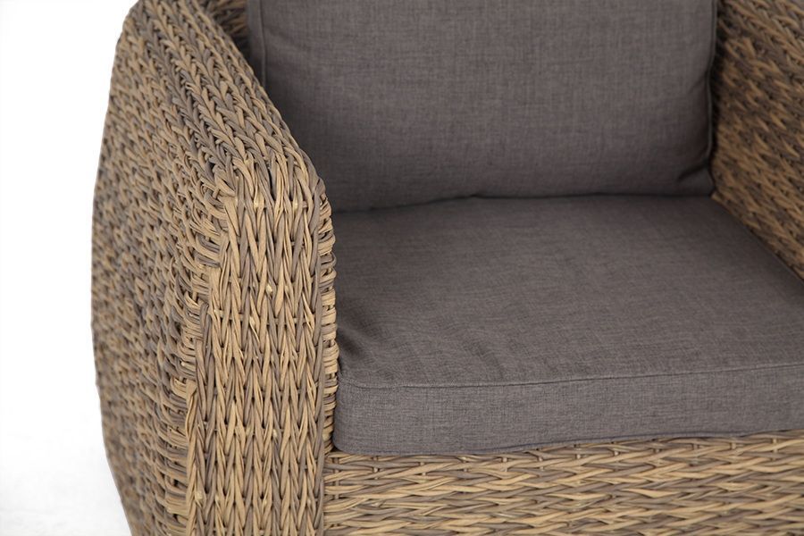 В комплектацию входят мягкие подушки для комфортного расположения. Чехлы съёмные серо-коричневого цвета из высококлассного полиэстера с плотностью 230гр/м2. Габариты модели составляют 980×880×680 мм, толщина подушки: 80 мм, вес: 18 кг.