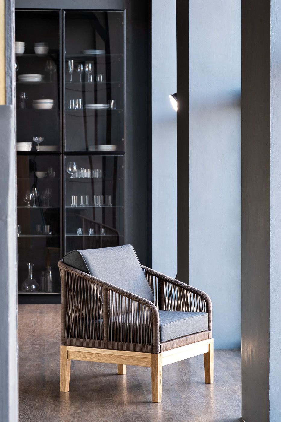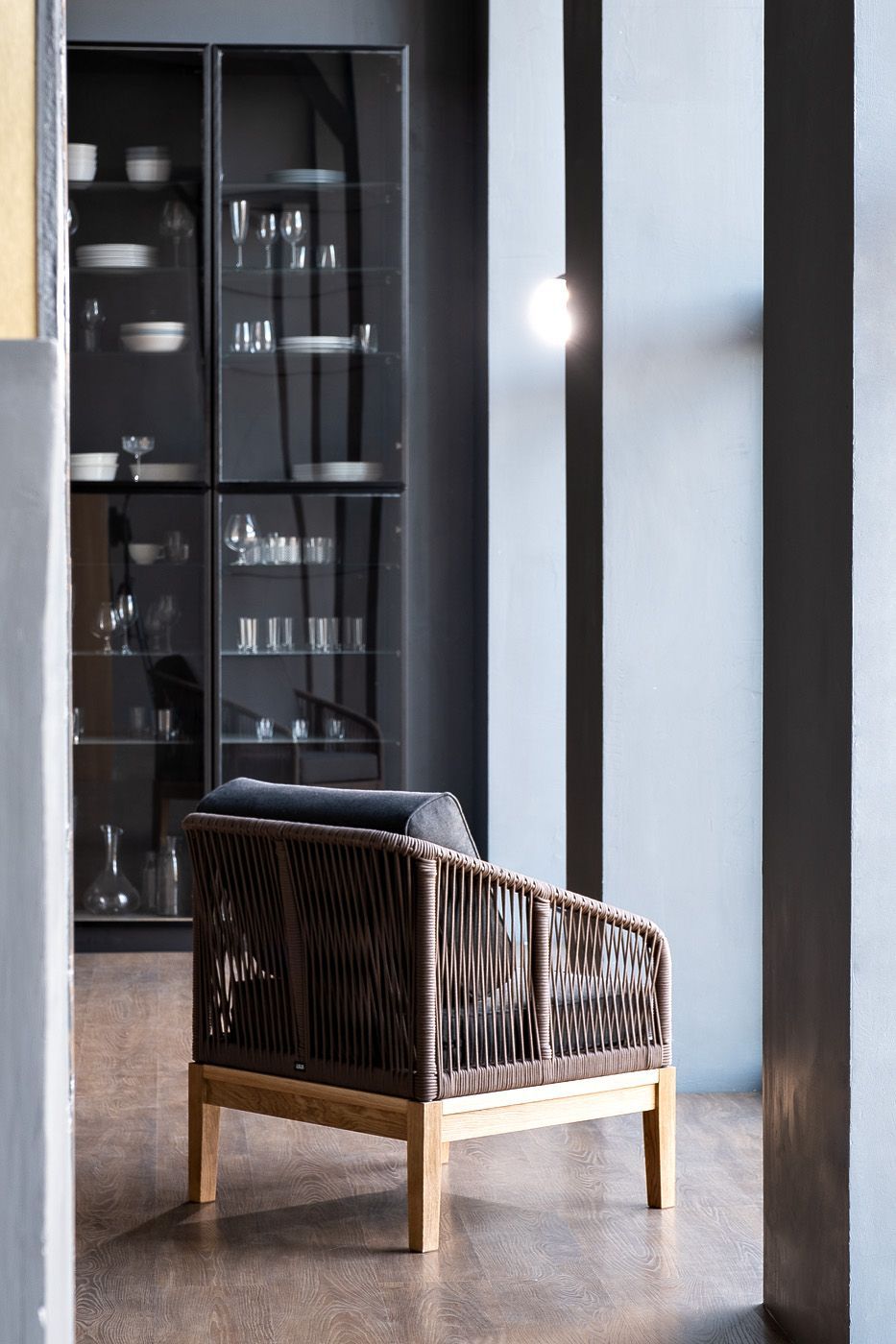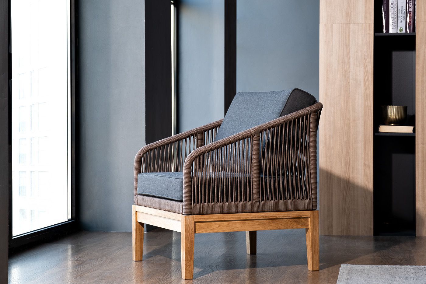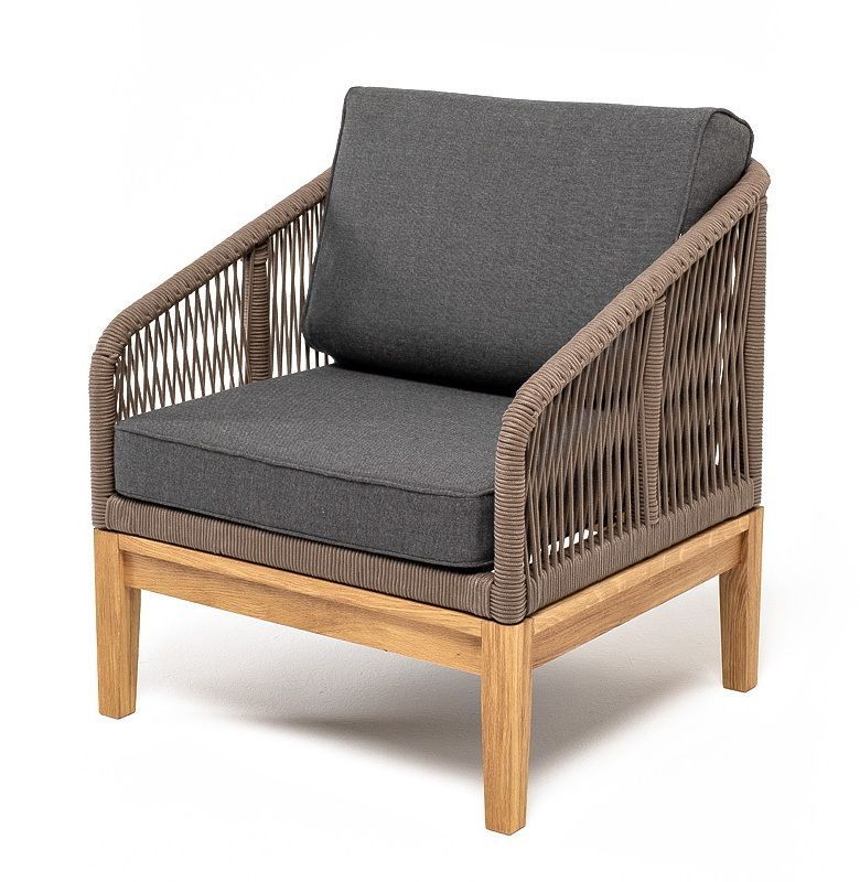 На боковинах - оплетка из синтетических лент, выполненных из полиэфирных волокон высокой прочности. Цвет плетения - коричневый. Основание - дуб.