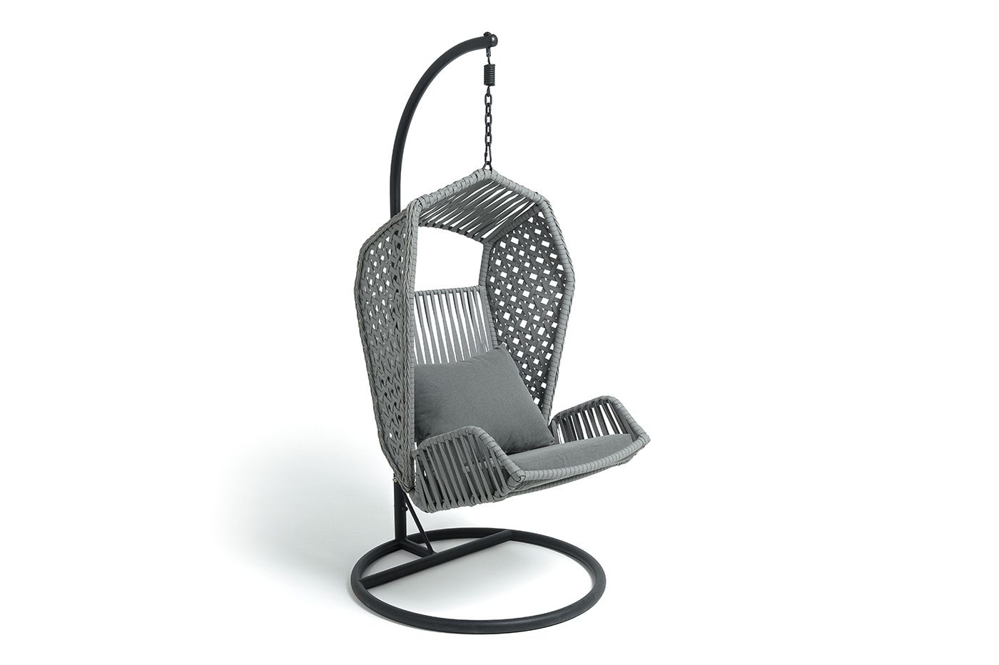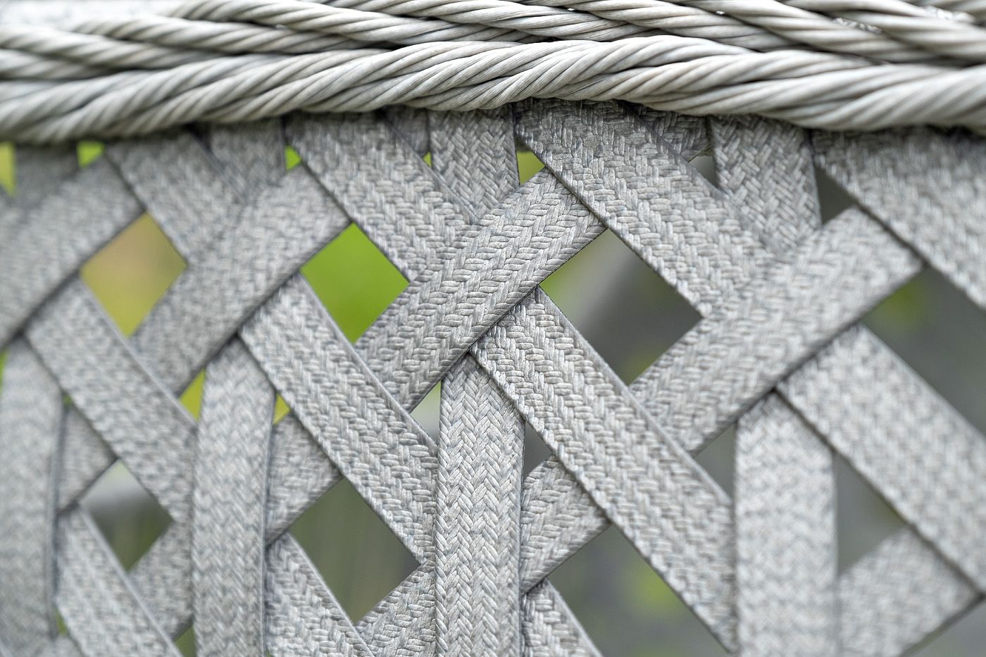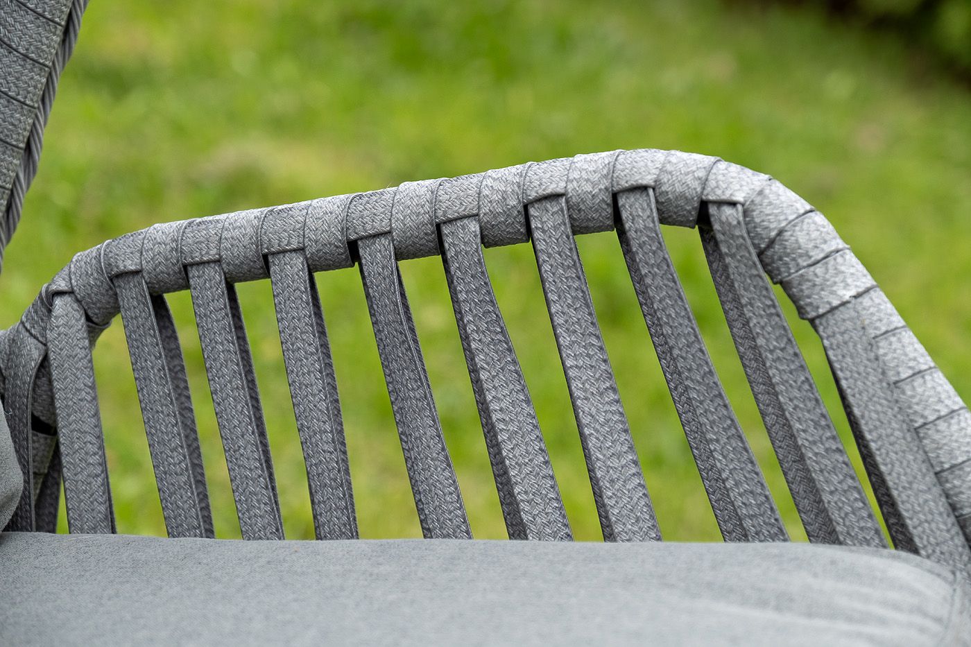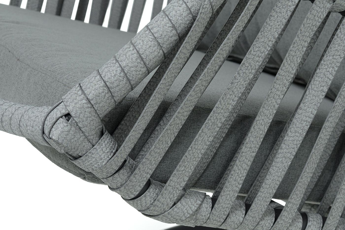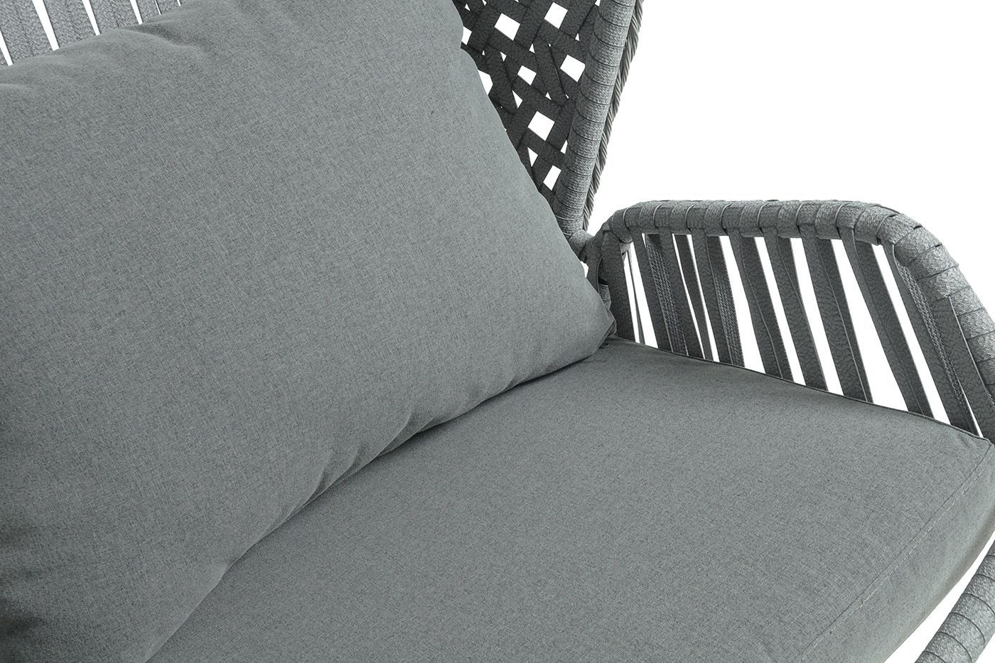 Каркас изготовлен из стали, окрашенного порошковой износостойкой краской черного цвета. Оплетка – плоский искусственный ротанг серого оттенка. Материал устойчив к перепадам погоды и подходит для использования на открытых пространствах.