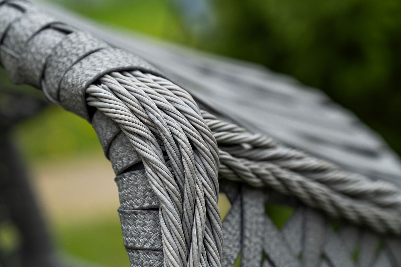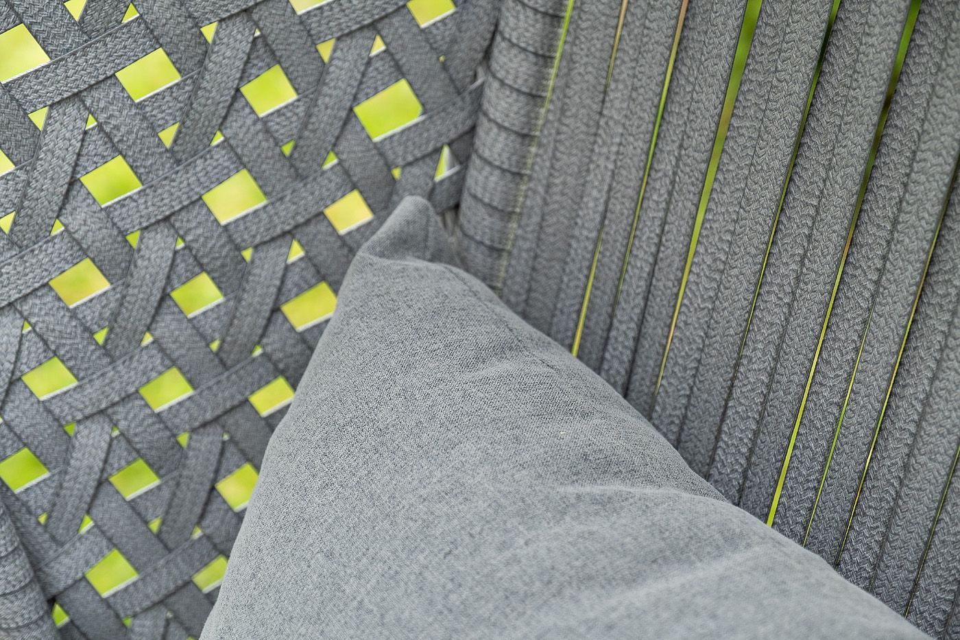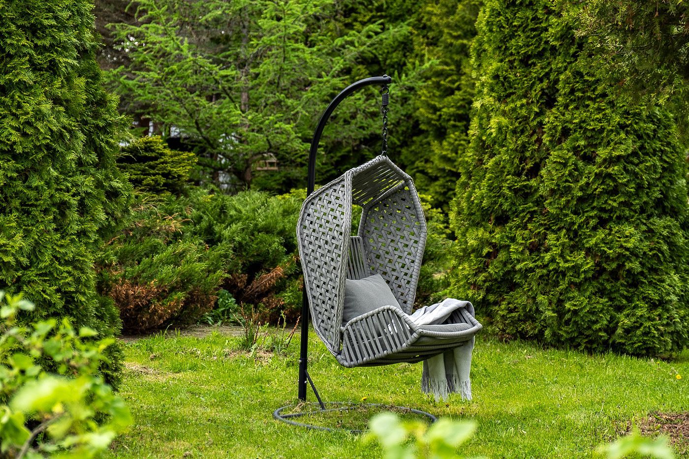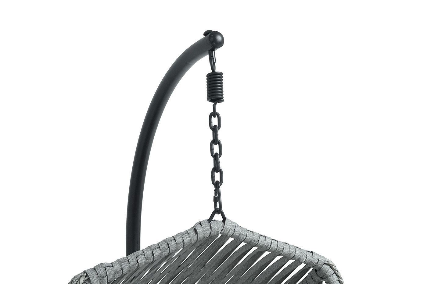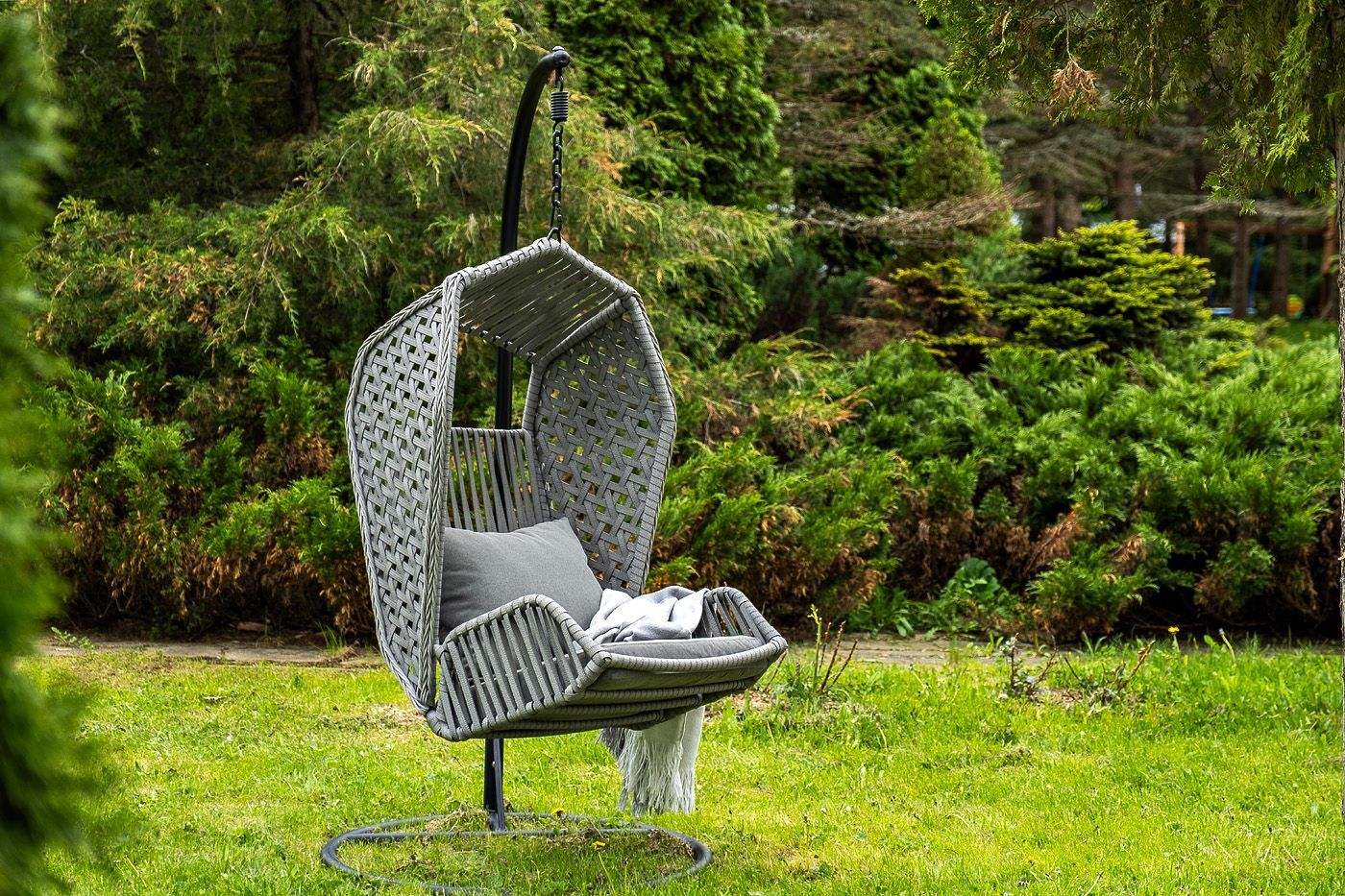 Каркас изготовлен из стали, окрашенного порошковой износостойкой краской черного цвета. Оплетка – плоский искусственный ротанг серого оттенка. Материал устойчив к перепадам погоды и подходит для использования на открытых пространствах.