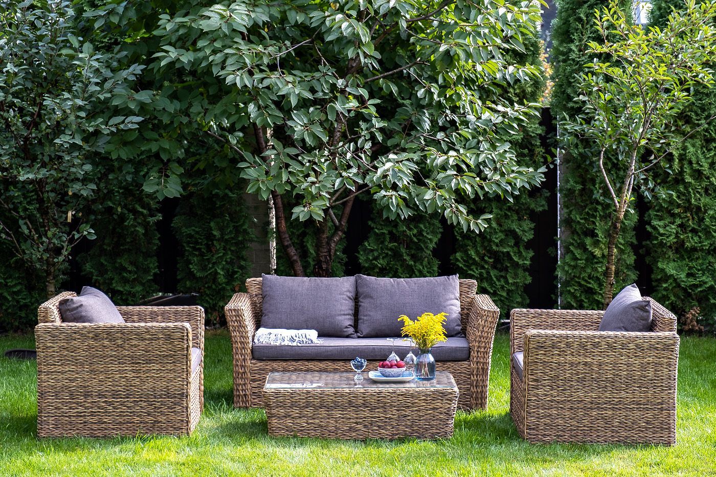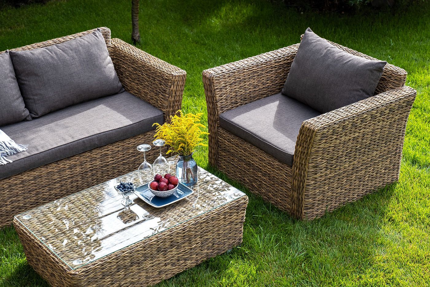 Каркас изготовлен из прочного алюминия, оплетенного вручную искусственным ротангом вида «гиацинт» соломенного оттенка.