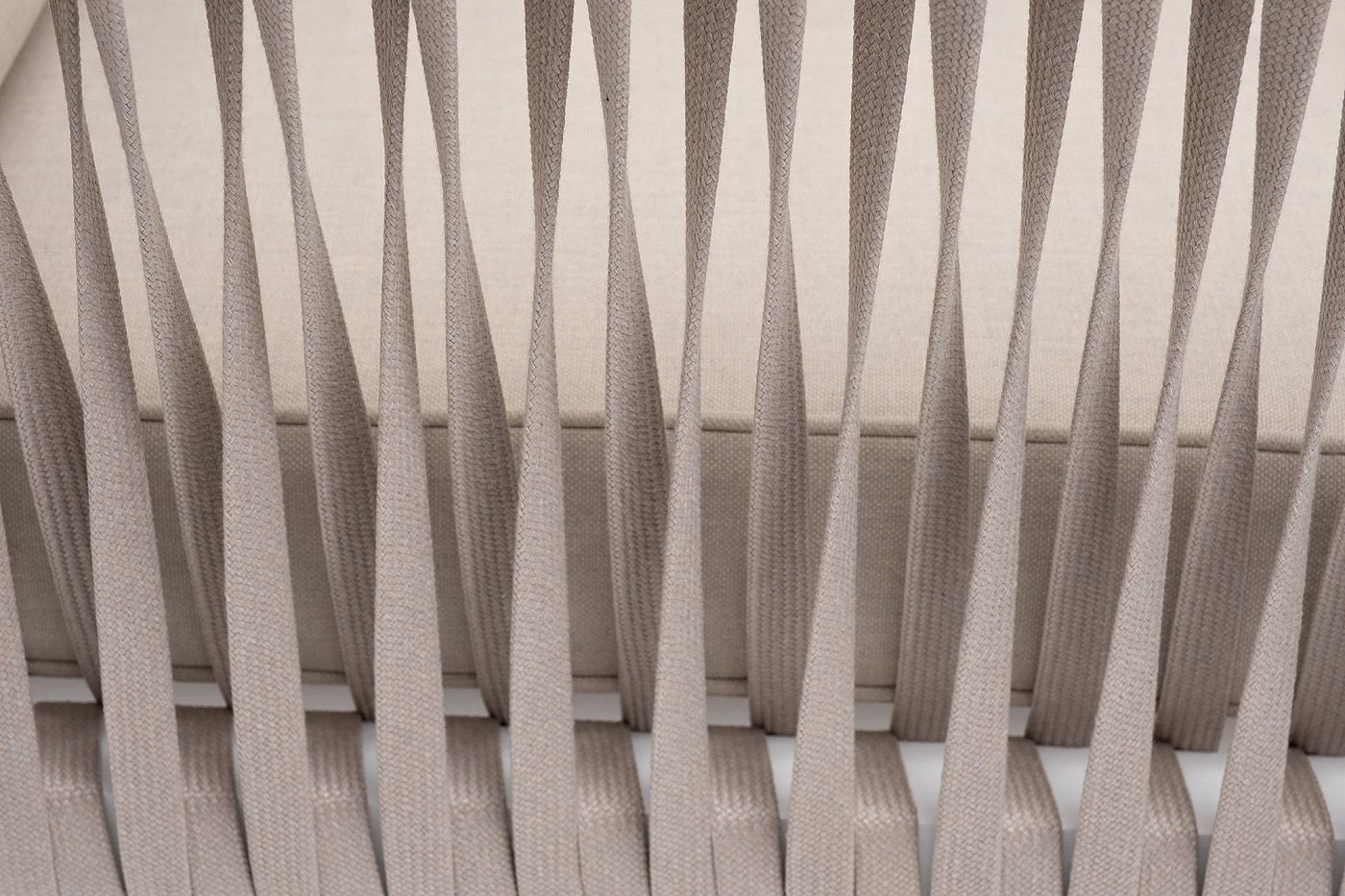 Кресло имеет алюминиевый каркас, окрашенный порошковой краской белового цвет. Боковины каркаса вручную оплетены роупом - эластичными синтетическими лентами, изготовленными из высокопрочных полиэфирных волокон. Цвет оплетки - бежевый.