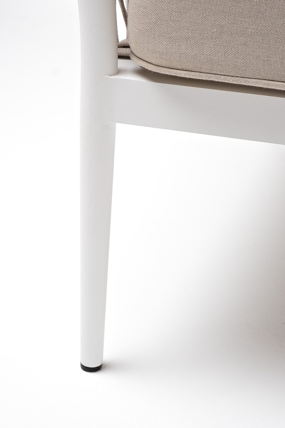 Кресло имеет алюминиевый каркас, окрашенный порошковой краской белового цвет. Боковины каркаса вручную оплетены роупом - эластичными синтетическими лентами, изготовленными из высокопрочных полиэфирных волокон. Цвет оплетки - бежевый.