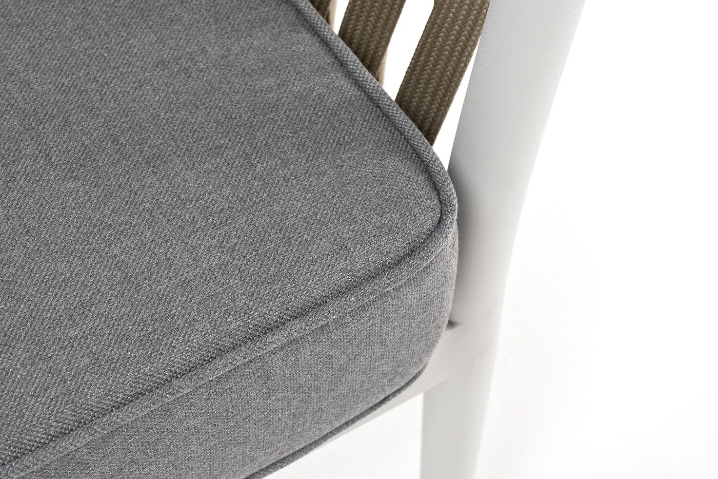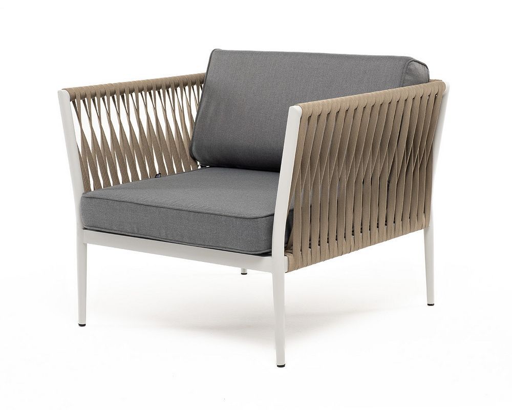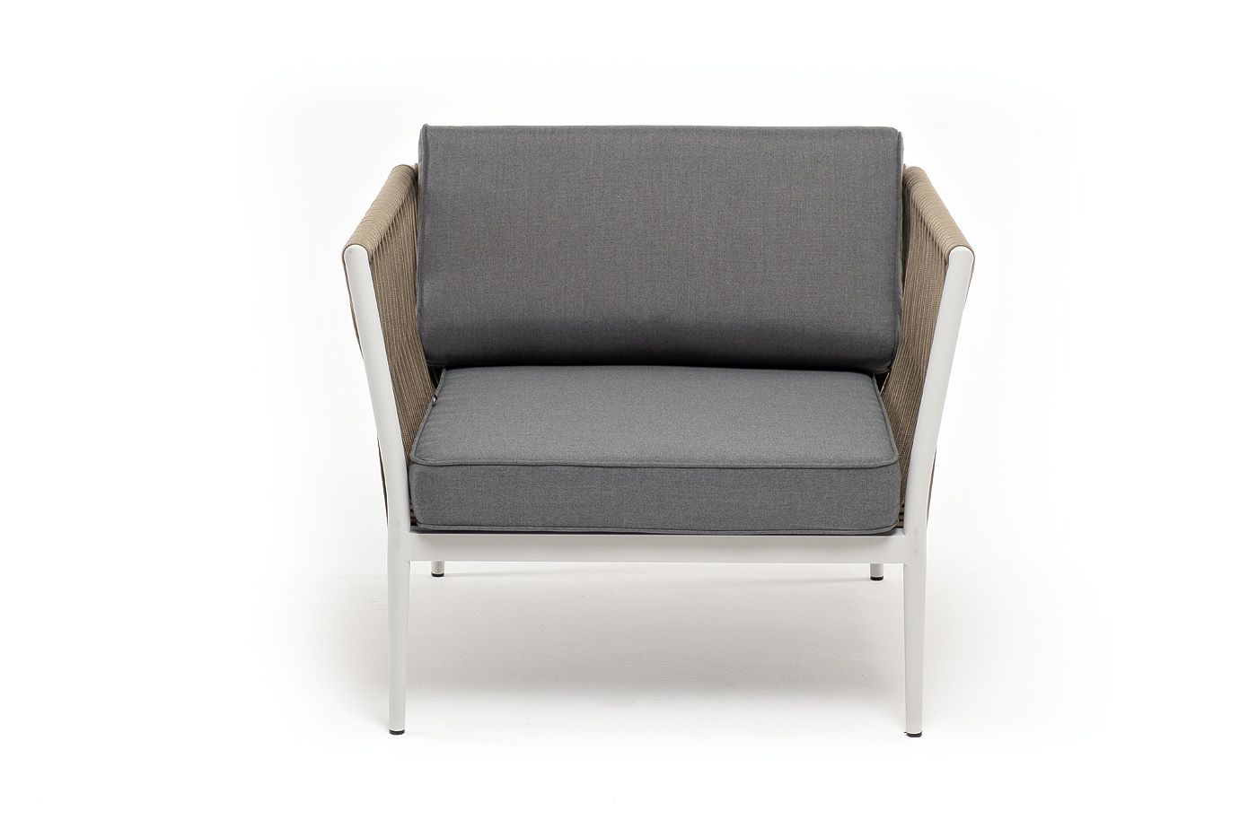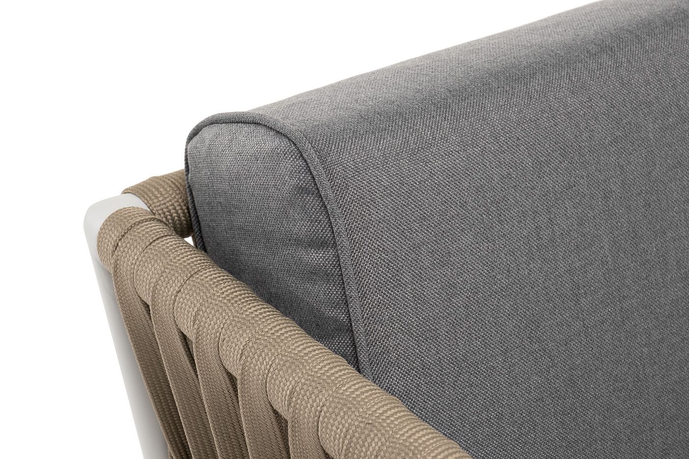Кресло имеет алюминиевый каркас, окрашенный порошковой краской в светло-серый (RAL7035) цвет. Боковины каркаса вручную оплетены роупом - эластичными синтетическими лентами, изготовленными из высокопрочных полиэфирных волокон. Цвет оплетки - серо-коричневый.