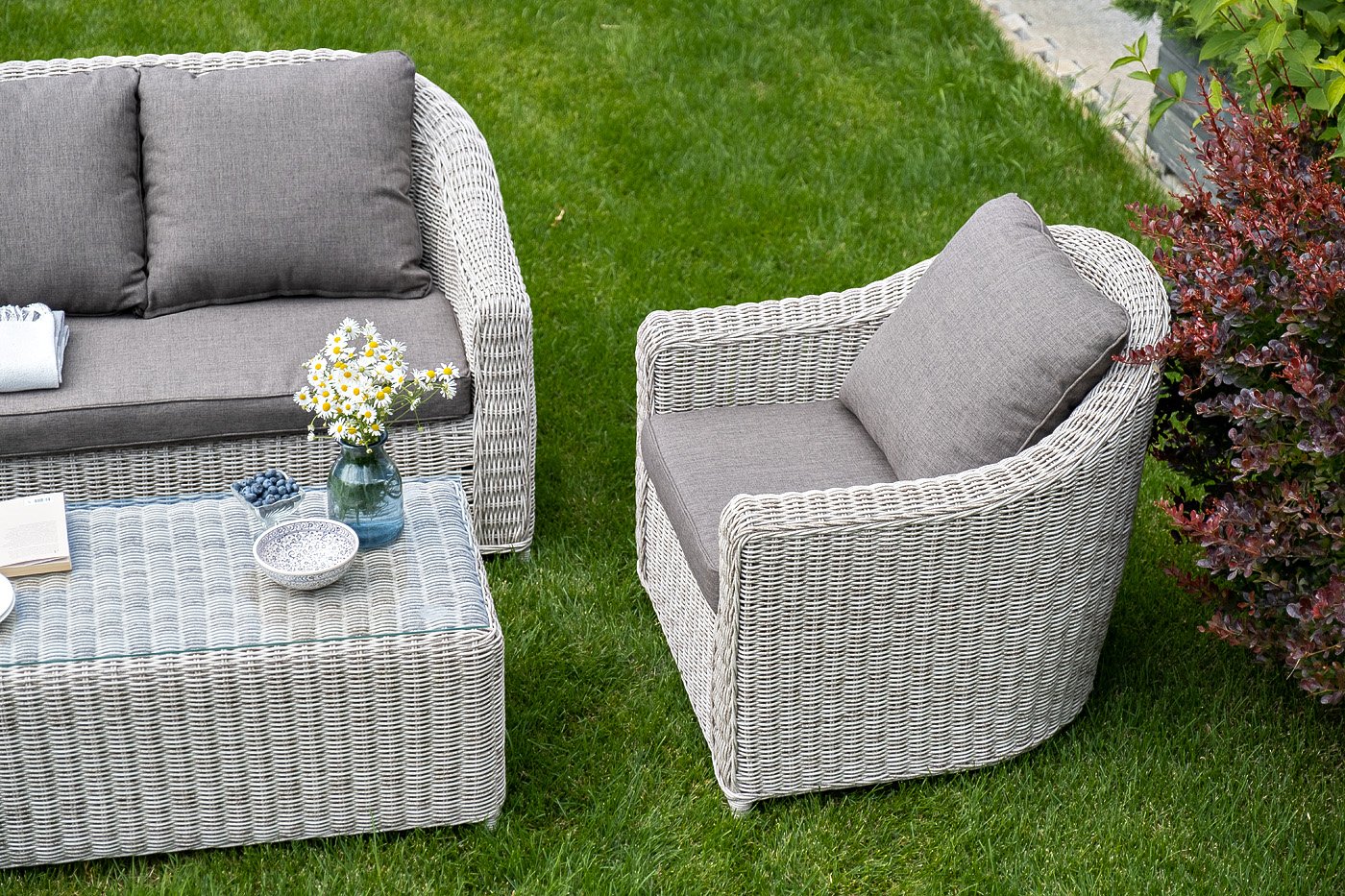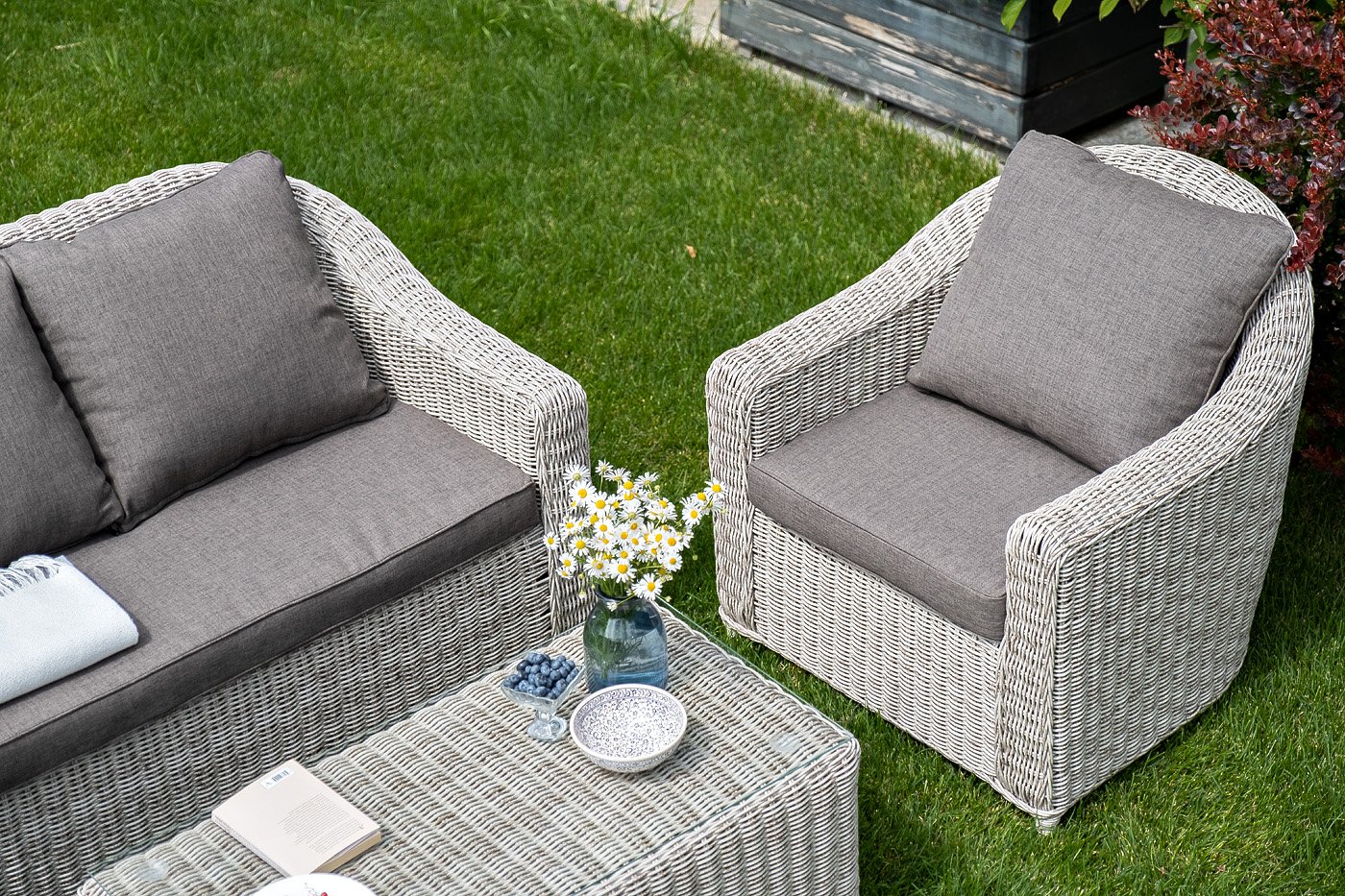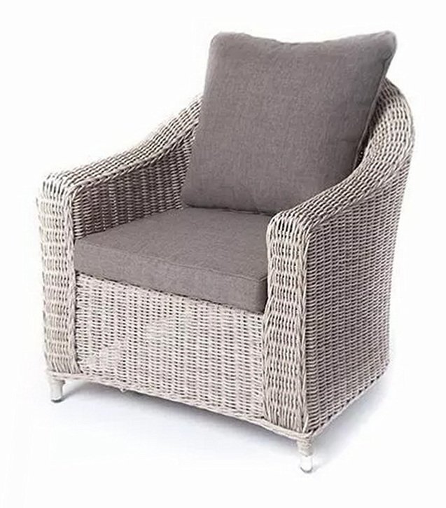 У кресла есть мягкие подушки, выполненые в серо-коричневом цвете. Они сделаны из прочного полиэстера с плотностью 230гр/м2. Ткань имеет влагоотталкивающую пропитку, которая защищает ее от сильного намокания.