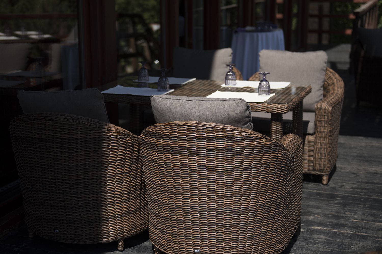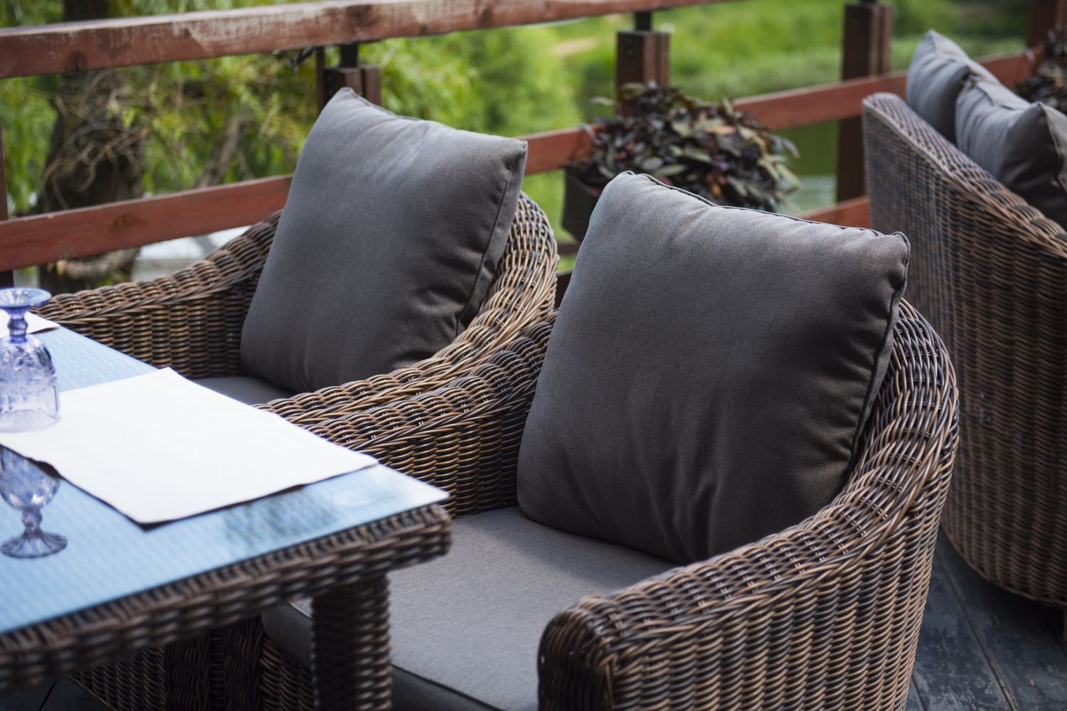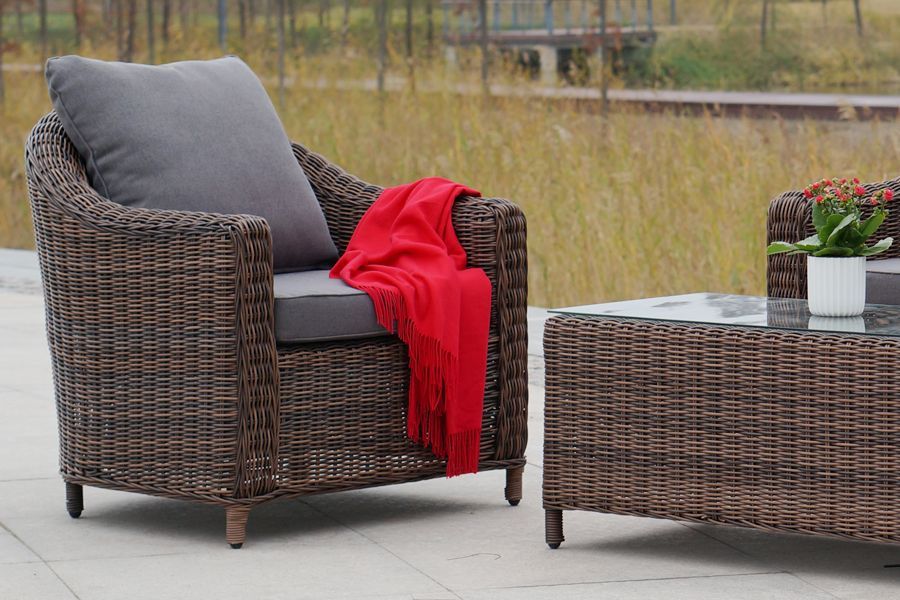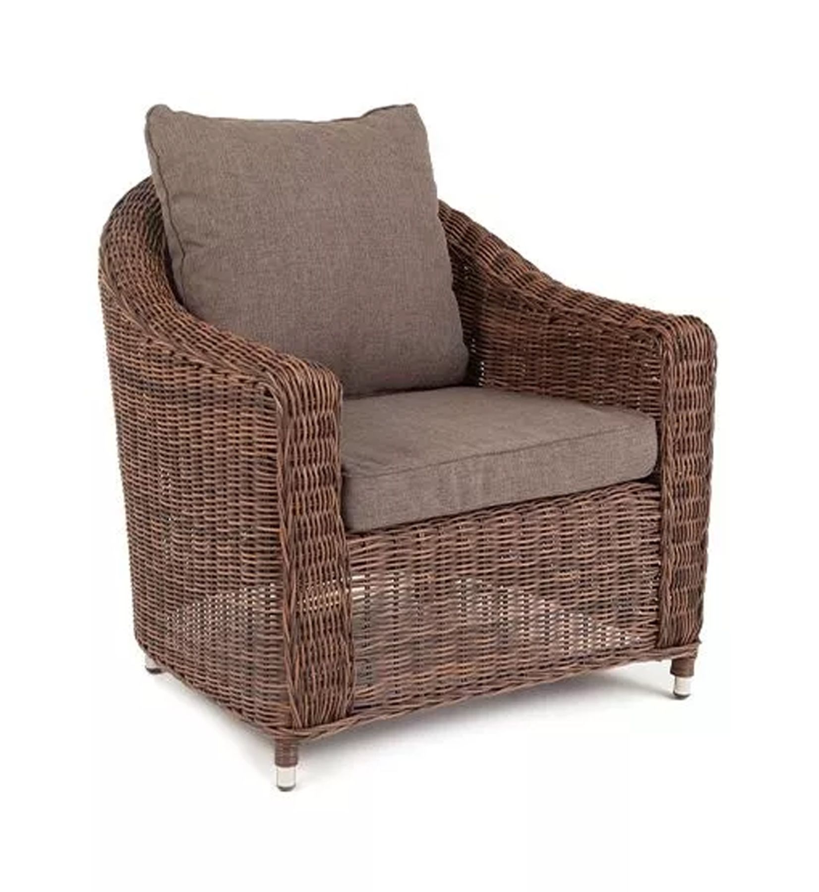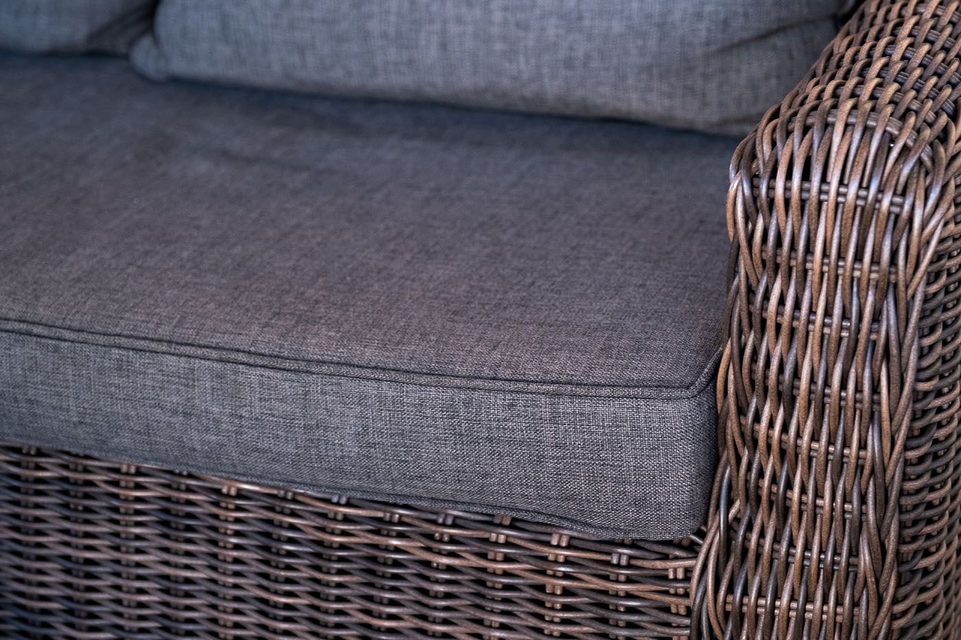 У кресла есть мягкие подушки, выполненые в серо-коричневом цвете. Они сделаны из прочного полиэстера с плотностью 230гр/м2. Ткань имеет влагоотталкивающую пропитку, которая защищает ее от сильного намокания.