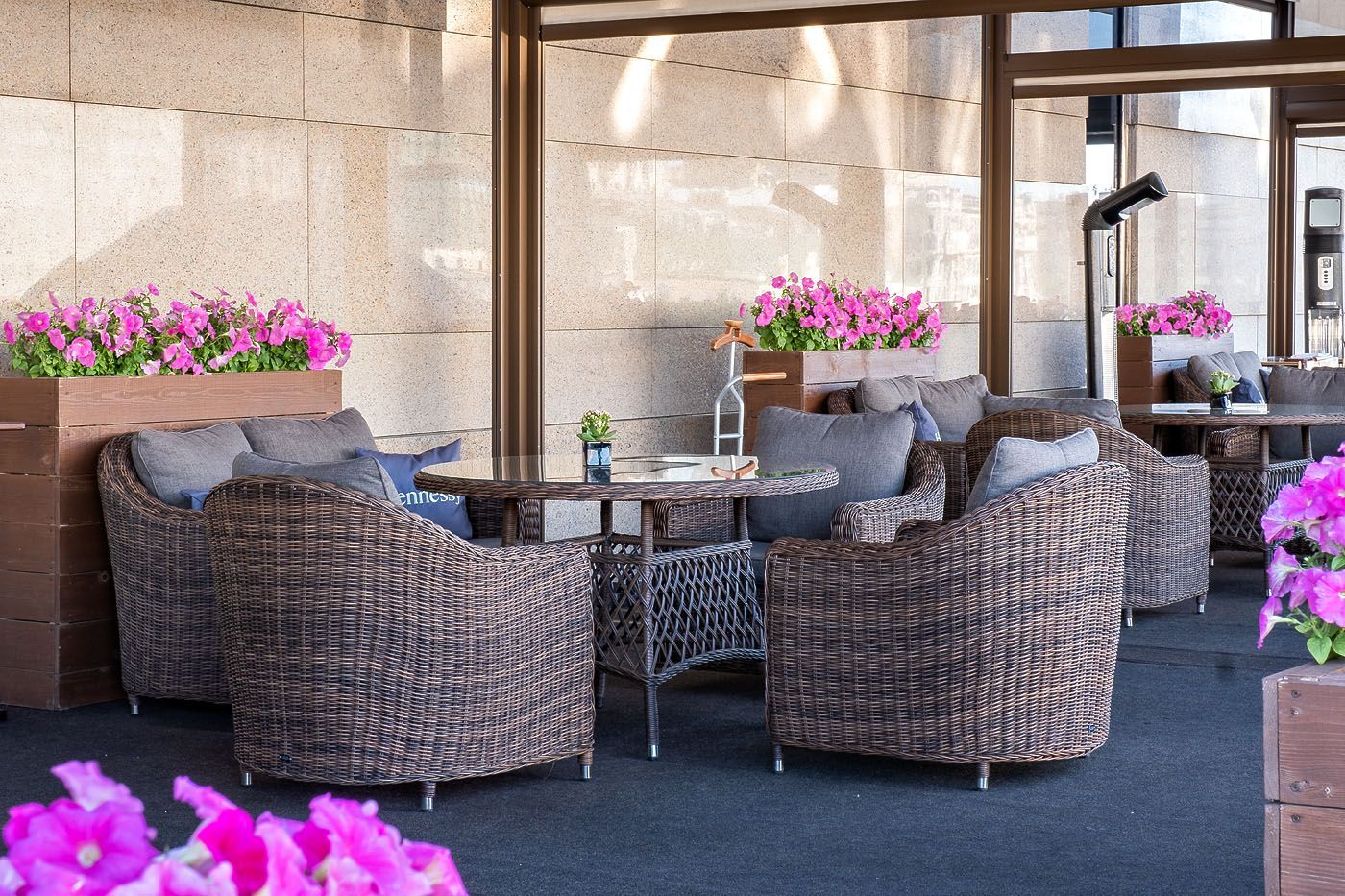 Размер модели – 800×800×800 мм. В качестве основы служит алюминиевый каркас, который оплетен круглым искусственным ротангом коричневого оттенка.