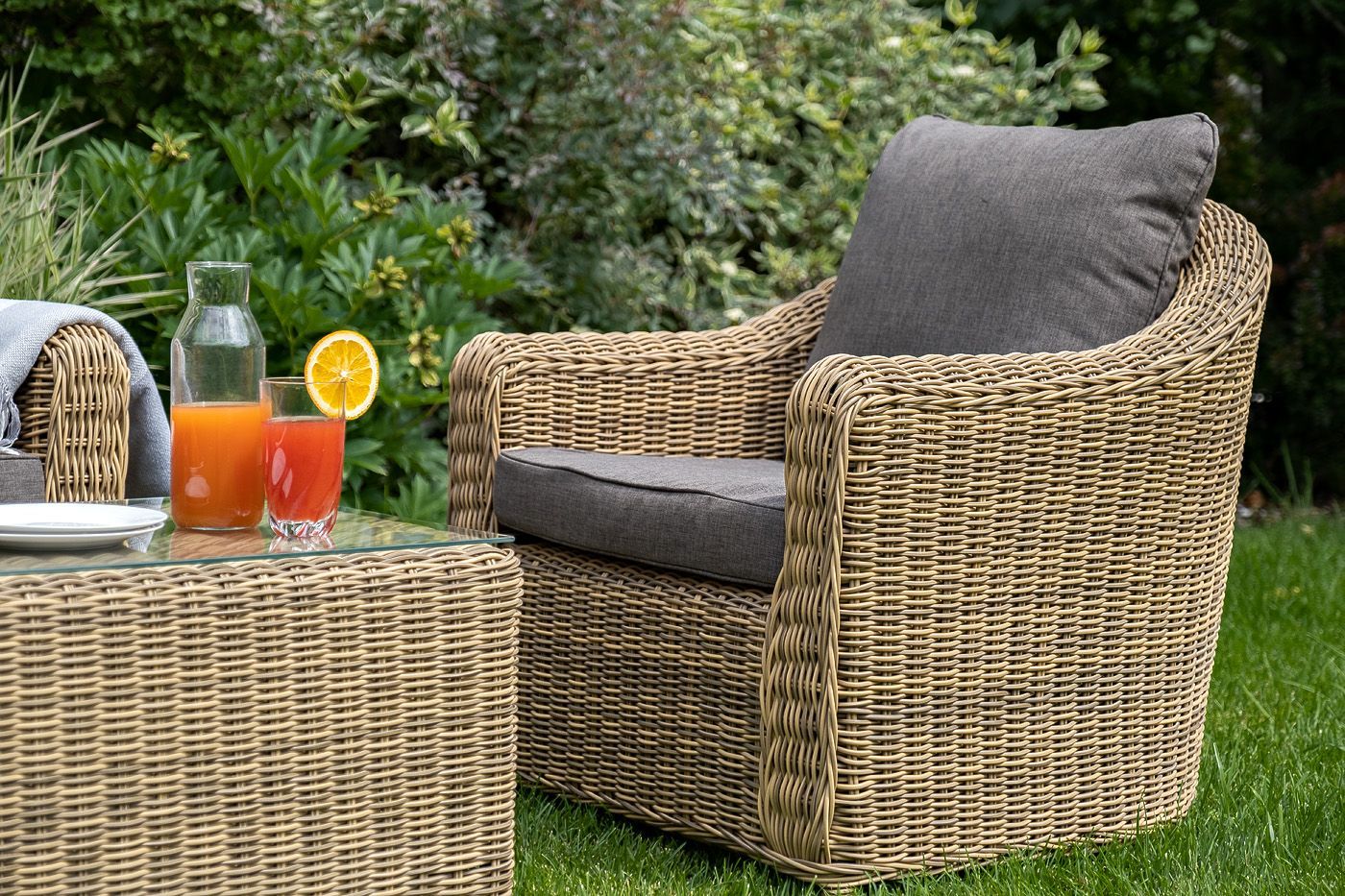 У кресла есть мягкие подушки, выполненые в серо-коричневом цвете. Они сделаны из прочного полиэстера с плотностью 230гр/м2. Ткань имеет влагоотталкивающую пропитку, которая защищает ее от сильного намокания.
