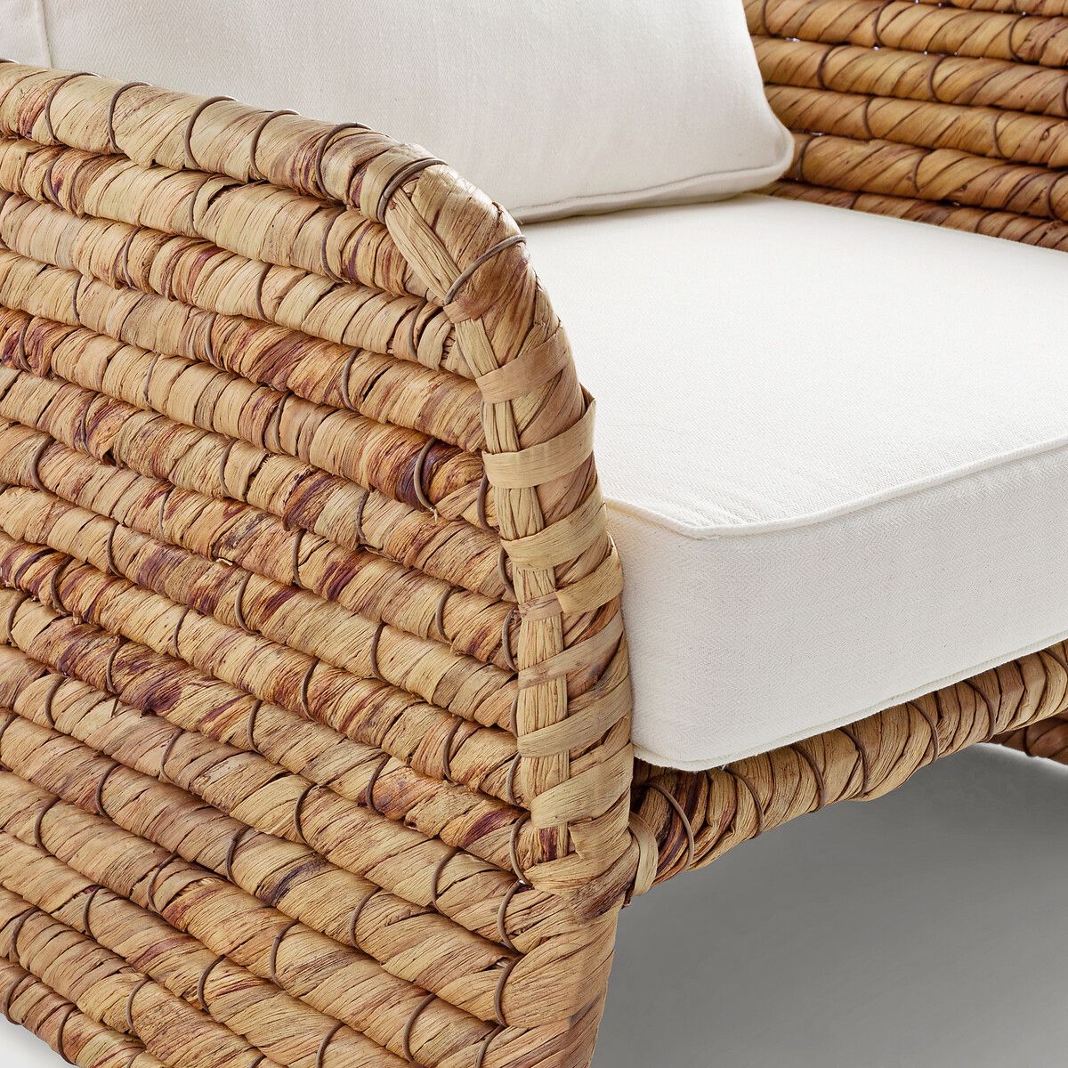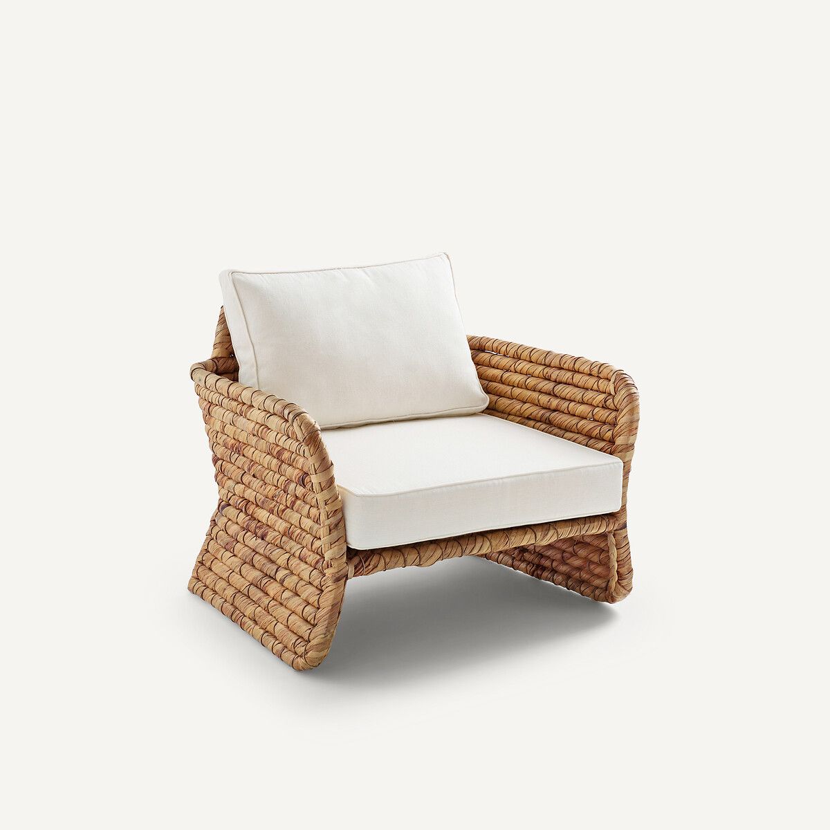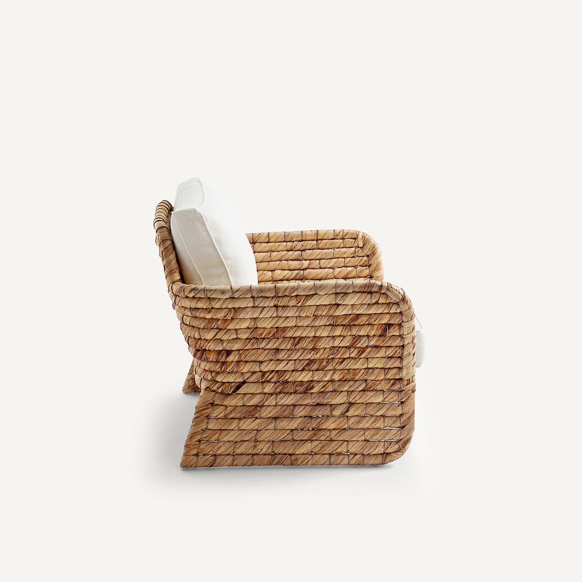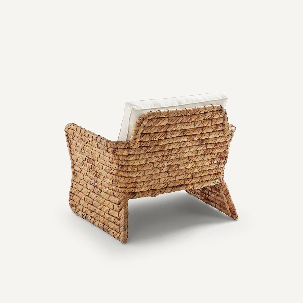 Пышные подушки сочетаются с каркасом, обшитым полностью плетеным водным гиацинтом. Комфортное кресло Galbo наполнено духом природы.