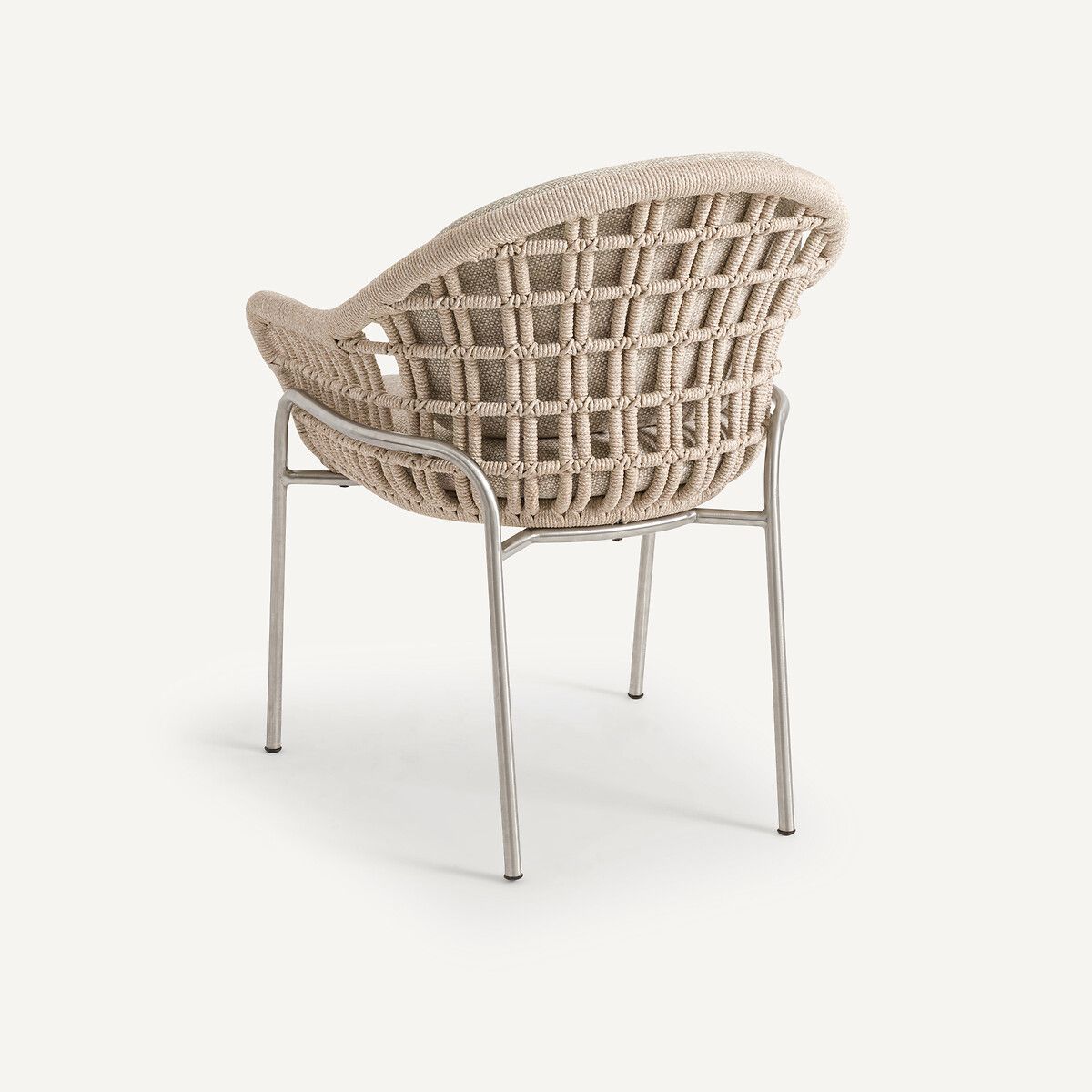 Обивка подушек выполнена из олефина (100% полипропилена), что делает её идеальной для использования на открытом воздухе. Каркас изготовлен из алюминия и оцинкованной стали, что обеспечивает долговечность и устойчивость к погодным условиям. Ножки из алюминия легче и прочнее традиционного металла, а также обладают естественным антикоррозийным покрытием. Плетение ручной работы из синтетической веревки (полиэстер) придает креслу особый шарм.