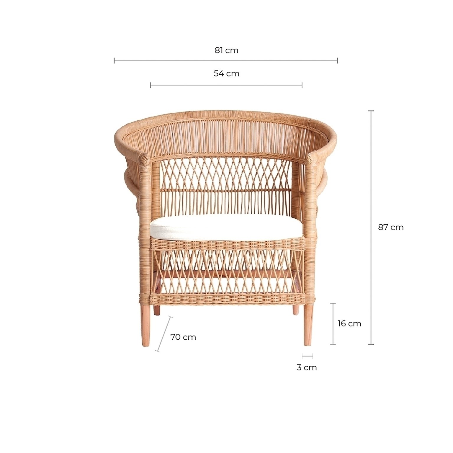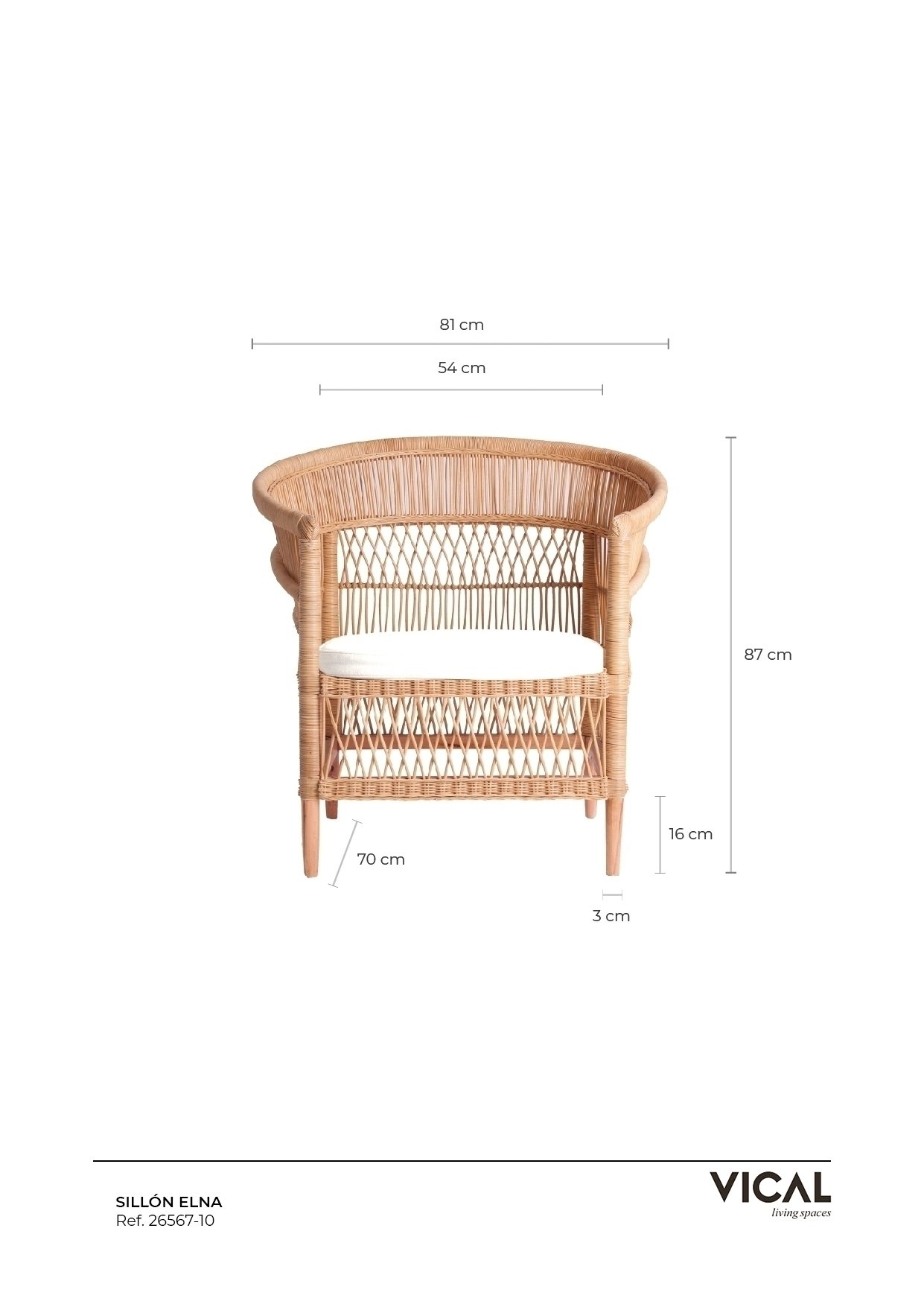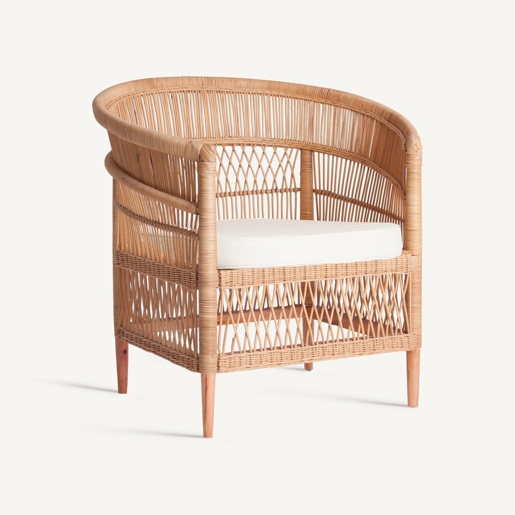 Кресло Elna, натурального цвета, современный стиль. Изготовлен из ротанга в сочетании с хлопком и поролоном. Съемное изделие.