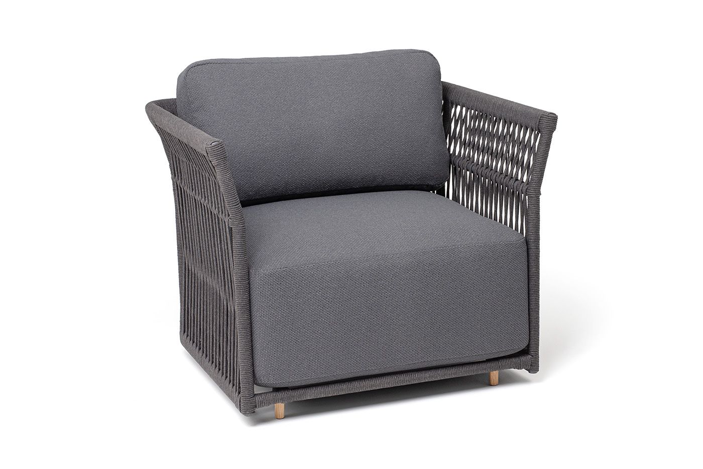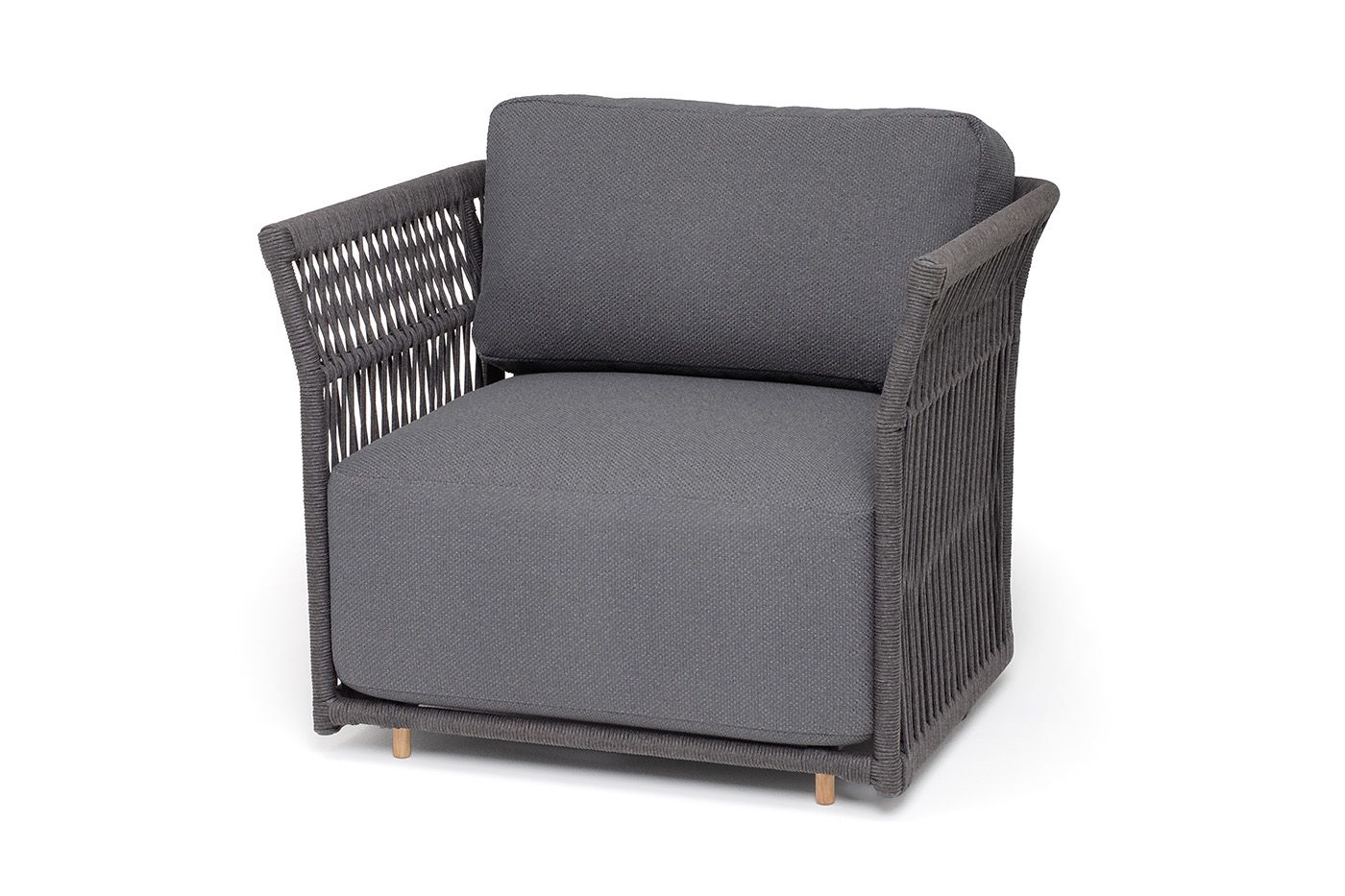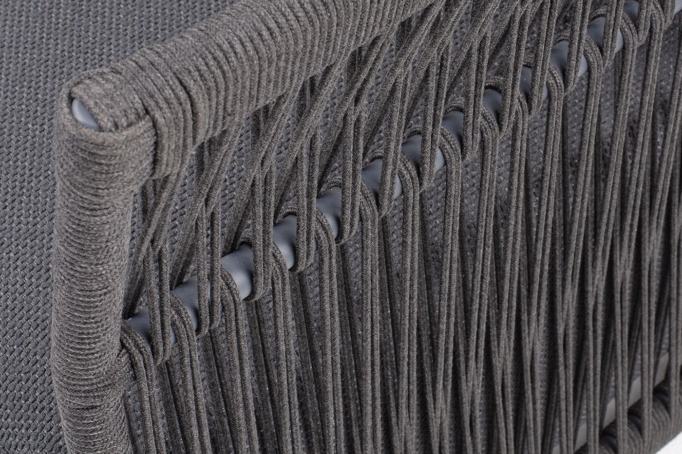 Кресло имеет алюминиевый каркас, окрашенный порошковой краской в темно-серый (RAL7024) цвет. Боковины каркаса и спинка вручную оплетены роупом - эластичными синтетическими лентами, изготовленными из высокопрочных полиэфирных волокон. Цвет оплетки в тон каркасу - темно-серый.