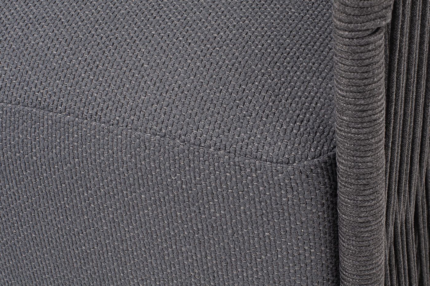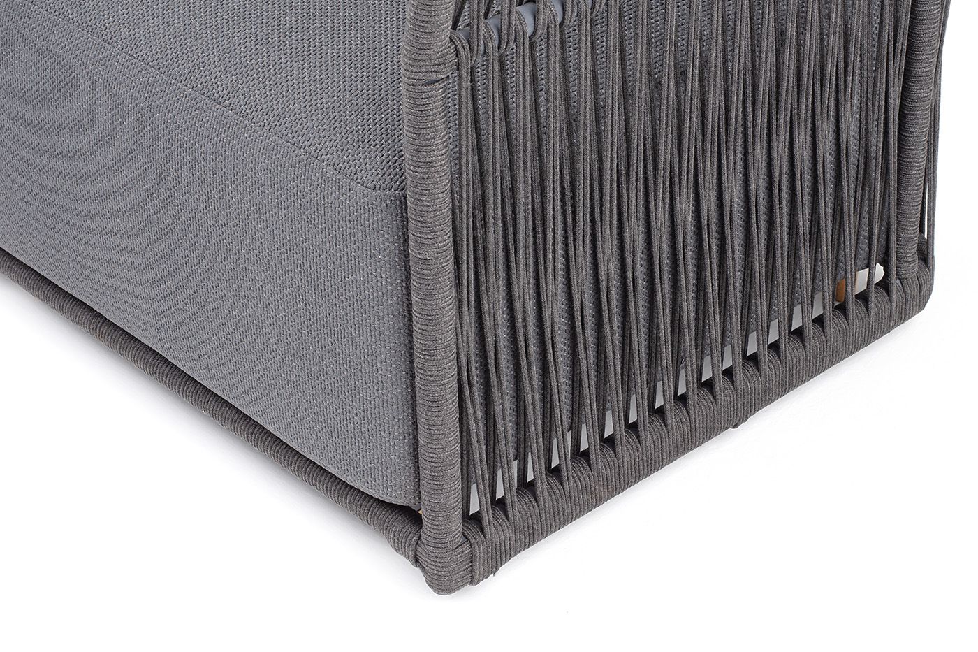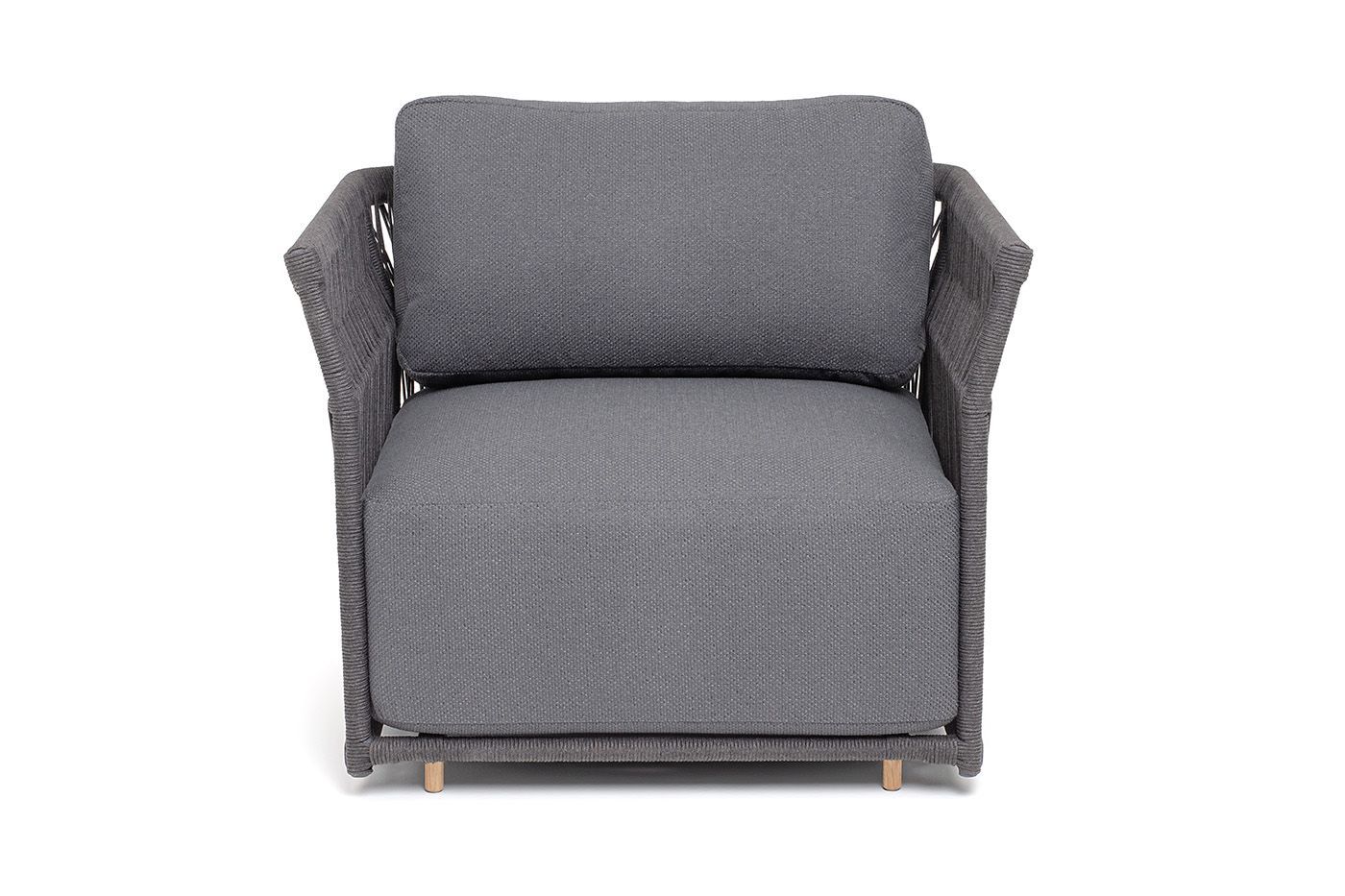 Кресло имеет алюминиевый каркас, окрашенный порошковой краской в темно-серый (RAL7024) цвет. Боковины каркаса и спинка вручную оплетены роупом - эластичными синтетическими лентами, изготовленными из высокопрочных полиэфирных волокон. Цвет оплетки в тон каркасу - темно-серый.