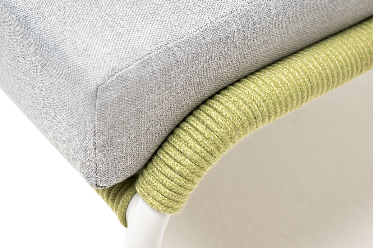 Изготовлен из алюминиевого каркаса, оплетенного вручную эластичными синтетическими лентами из высокопрочных полиэфирных волокон. Цвет каркаса - светло-серый (RAL7035), оплетки – салатовый меланж.