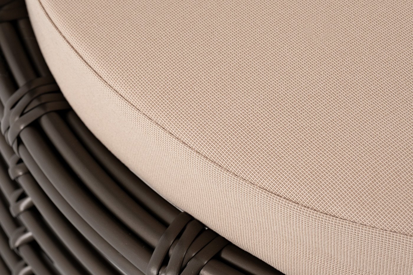 Кресло оснащено каркасом из прочного алюминия, ручное круглое плетение является основным декоративным элементом мебели. Оно выполнено из искусственного ротанга в бронзовом цвете.