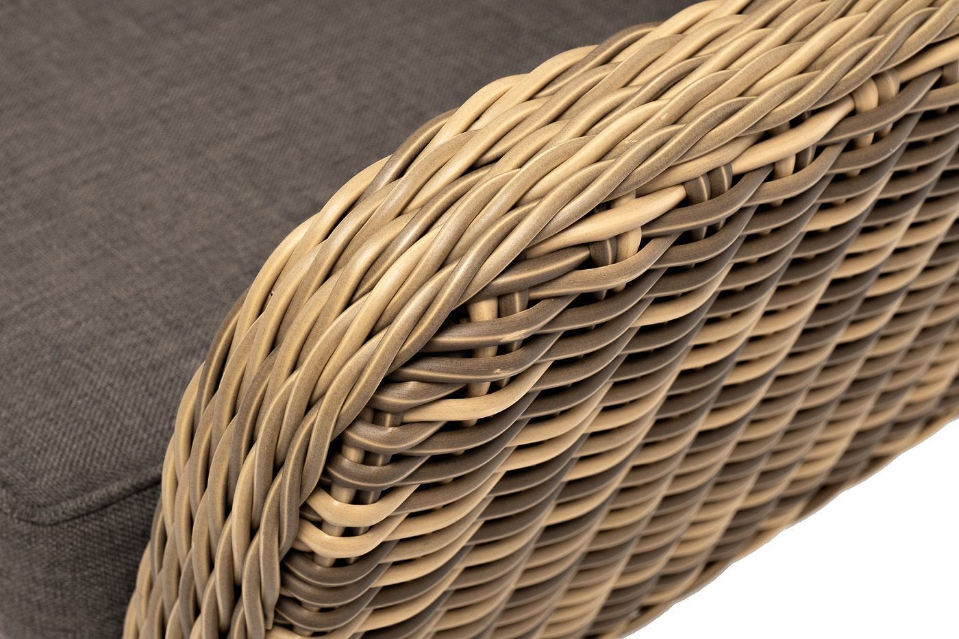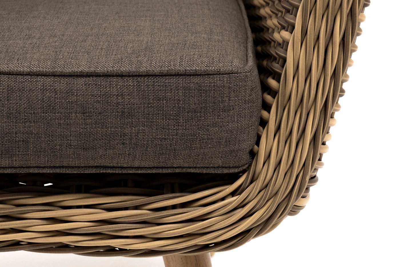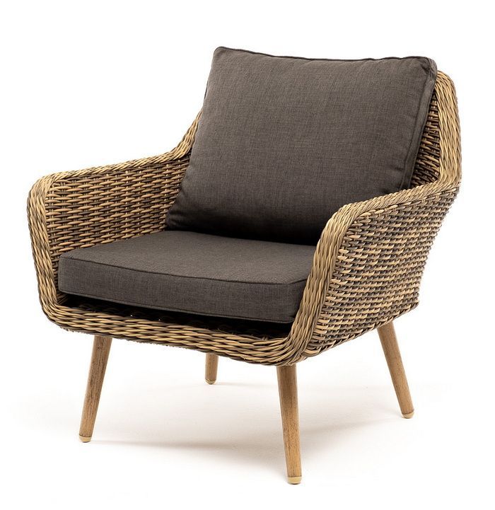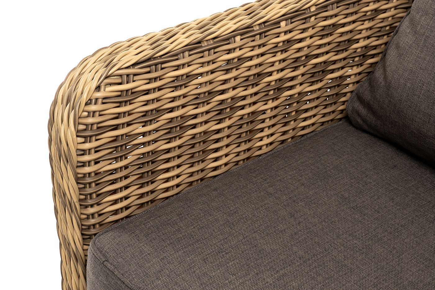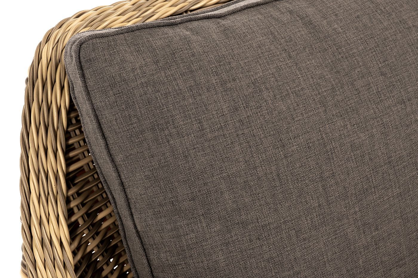В комплекте с уличным ротанговым креслом идут мягкие подушки со съёмными чехлами серо-коричневого оттенка. Они пошиты из полиэстера, который не боится повышенной влажности благодаря наличию влагоотталкивающей пропитки. Плотность ткани составляет 230гр/м2.
