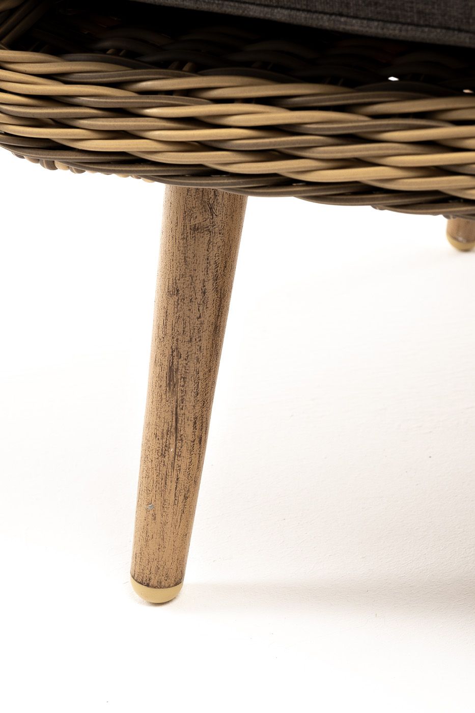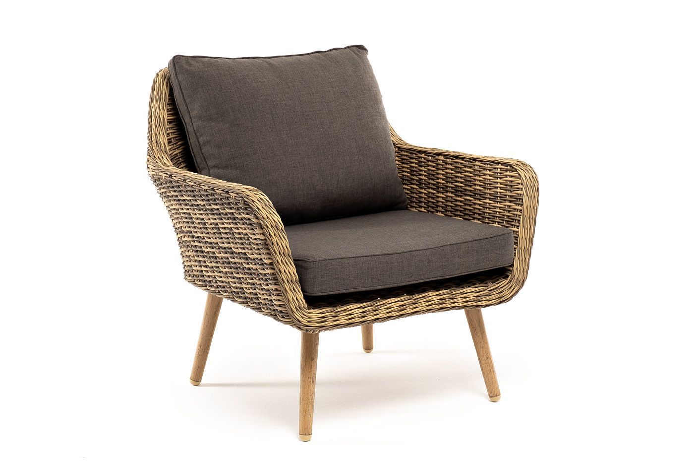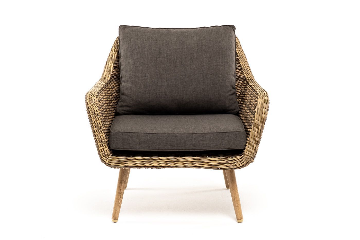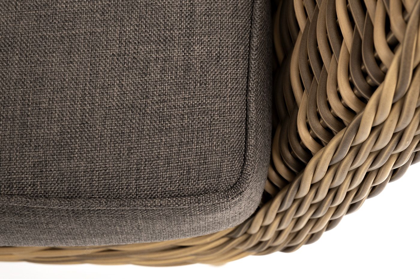 В комплекте с уличным ротанговым креслом идут мягкие подушки со съёмными чехлами серо-коричневого оттенка. Они пошиты из полиэстера, который не боится повышенной влажности благодаря наличию влагоотталкивающей пропитки. Плотность ткани составляет 230гр/м2.