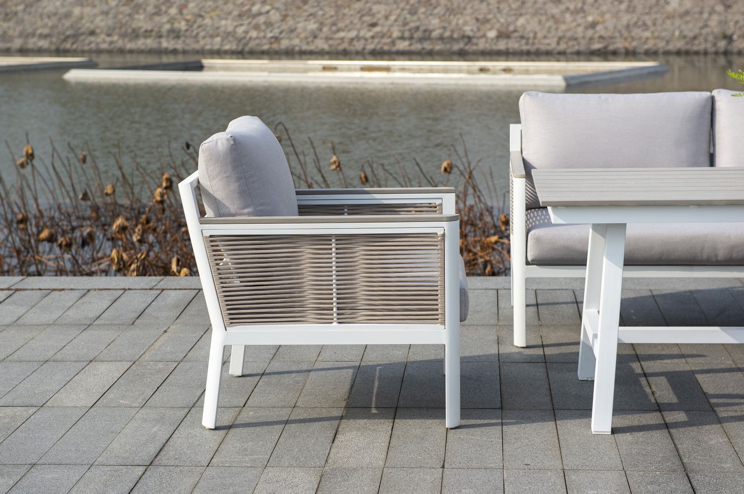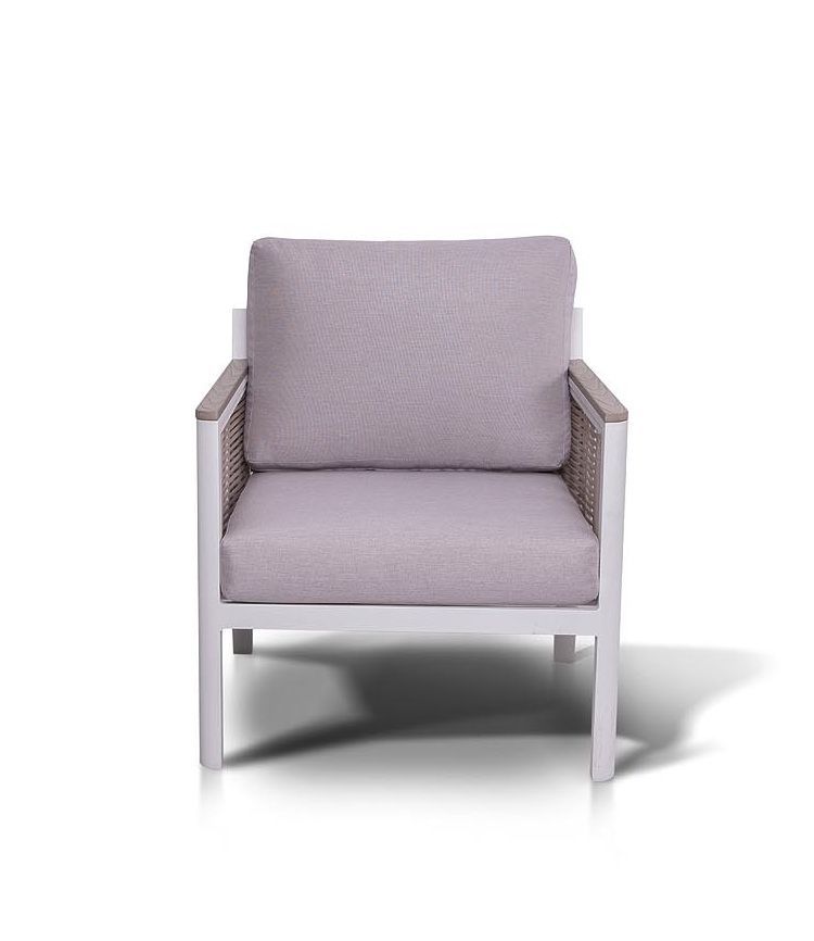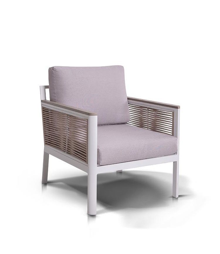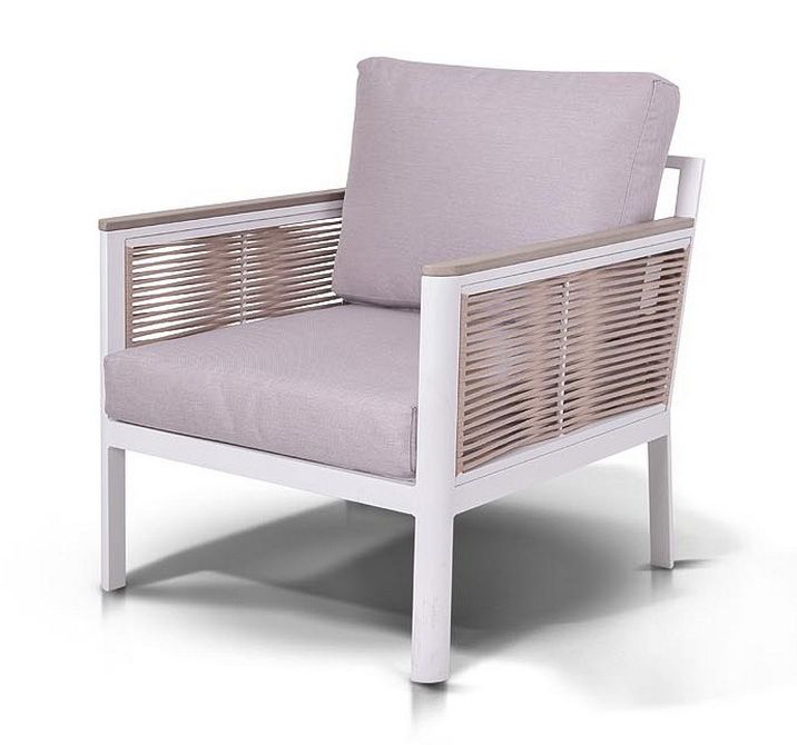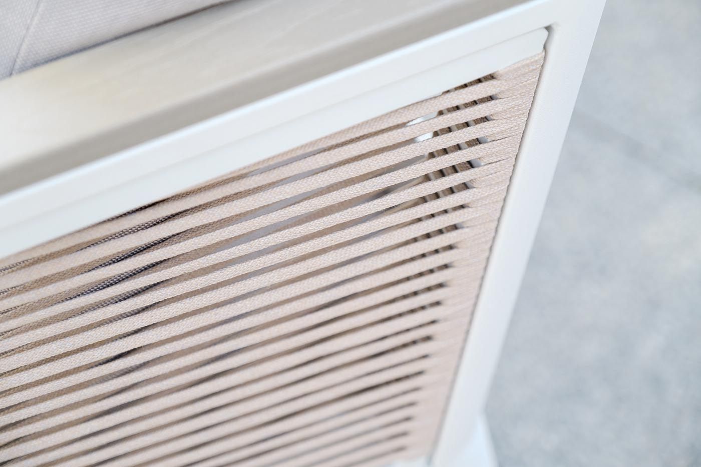 Размер модели – 680×780×700 мм. Ее каркас выполнен из высококачественного алюминия и окрашен порошковой краской в белый цвет. Боковые стороны подлокотников вручную оплетены эластичными синтетическими лентами серо-коричневого оттенка, состоящие из высокопрочных полиэфирных волокон.