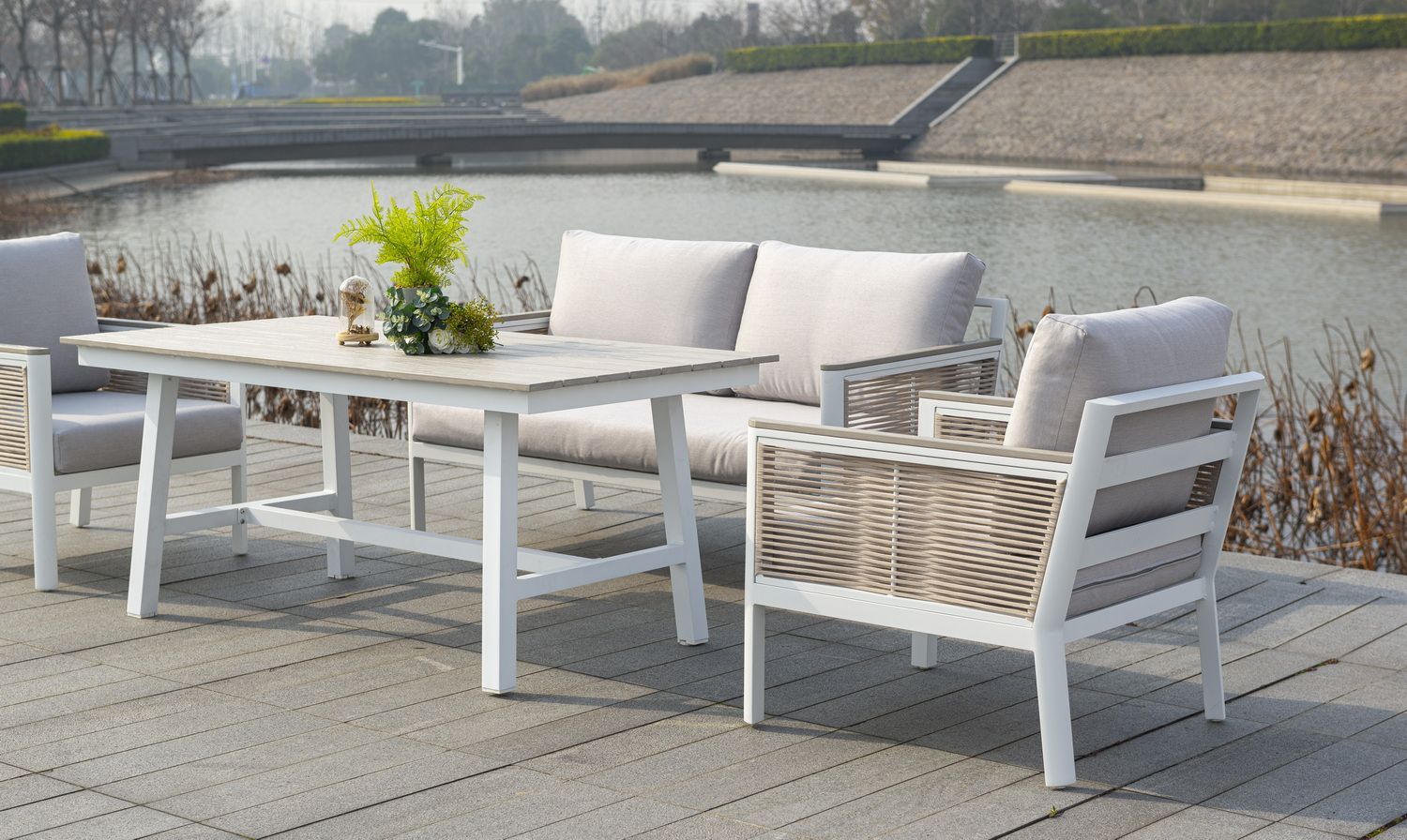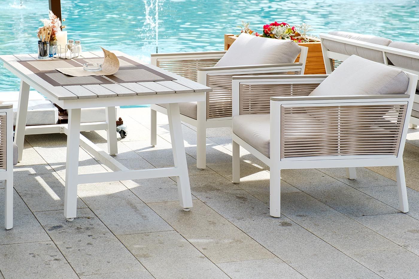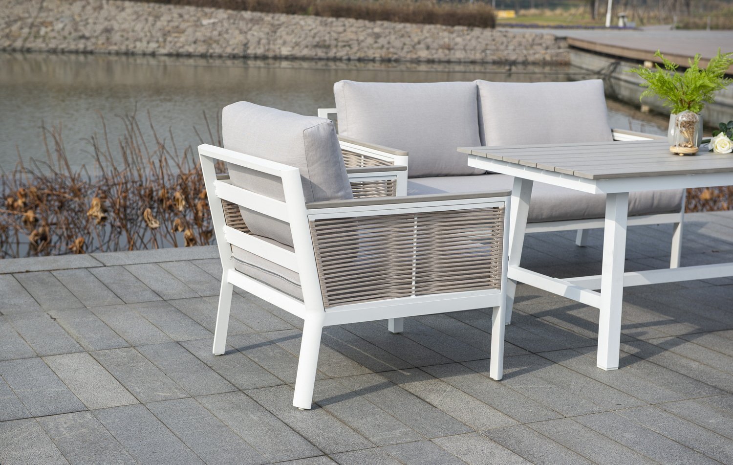 Размер модели – 680×780×700 мм. Ее каркас выполнен из высококачественного алюминия и окрашен порошковой краской в белый цвет. Боковые стороны подлокотников вручную оплетены эластичными синтетическими лентами серо-коричневого оттенка, состоящие из высокопрочных полиэфирных волокон.
