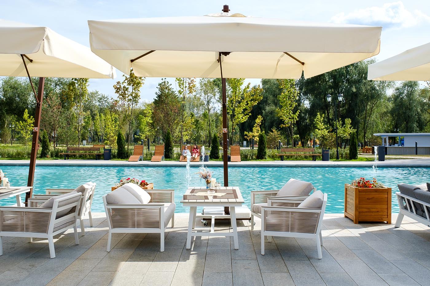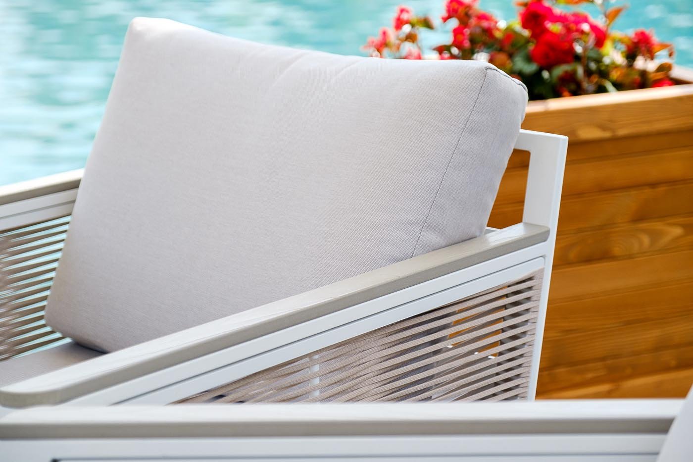 Садовое кресло идет в комплекте с двумя подушками со съёмными чехлами. Они выполнены в бежевом цвете. Изделия изготовлены из прочного полиэстера, плотностью 300гр/м2. Ткань имеет влагоотталкивающую пропитку.