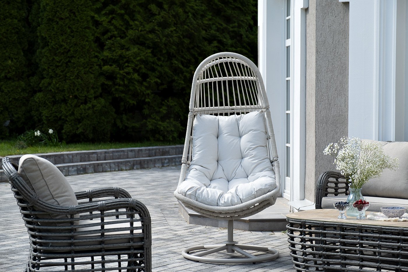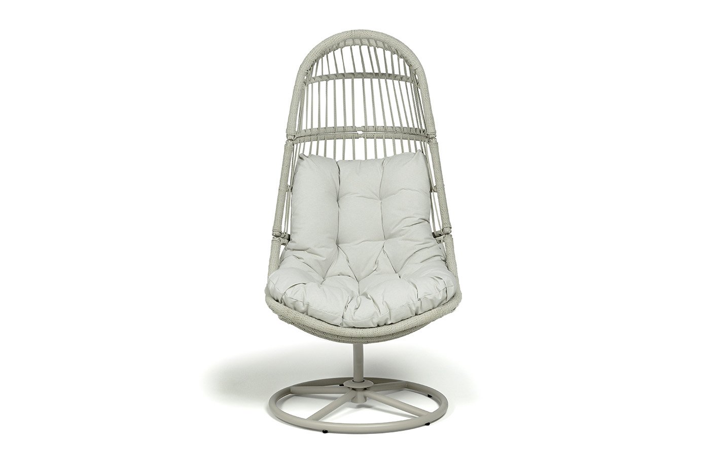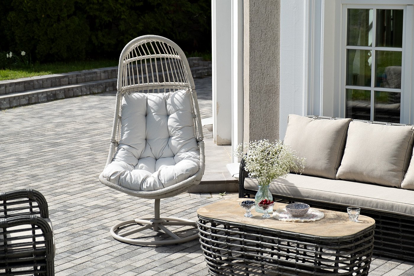 Каркас изготовлен из стали, окрашенного порошковой износостойкой краской белого цвета. Оплетка – плоский искусственный ротанг бежевого оттенка. Материал устойчив к перепадам погоды и подходит для использования на открытых пространствах.