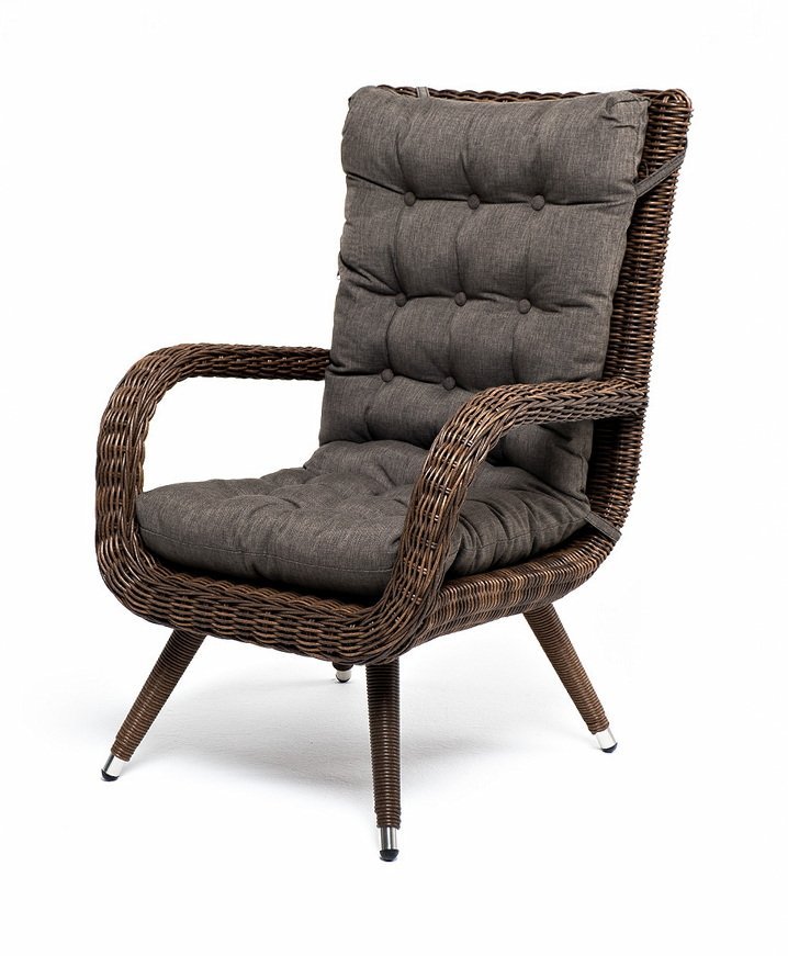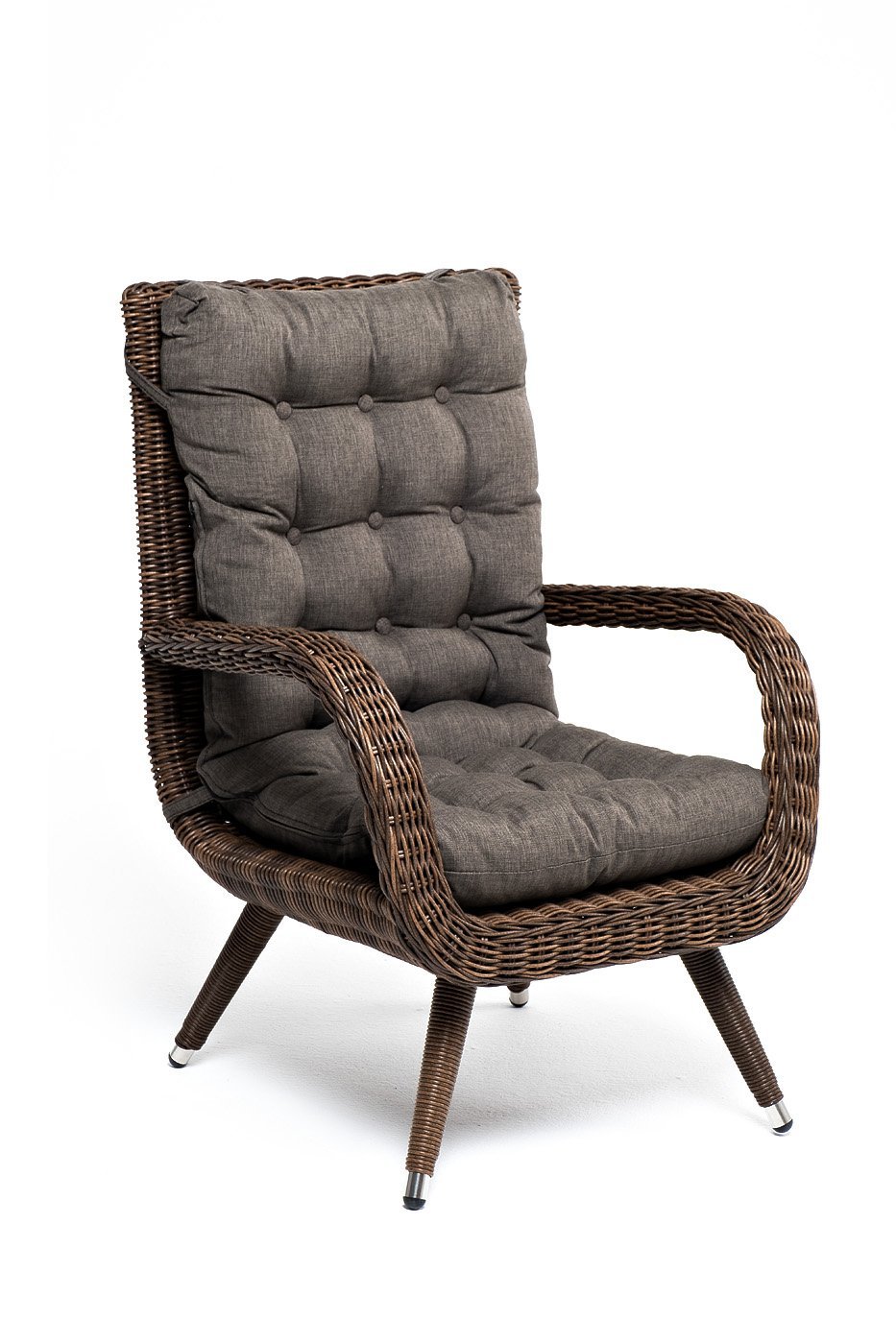 Садовое кресло дополнено мягкими подушками для комфортного размещения. Они выполнены в серо-коричневом цвете. При их пошиве используется полиэстер с плотностью 230гр/м2. Влагоотталкивающая пропитка усиливает защитные свойства материала.