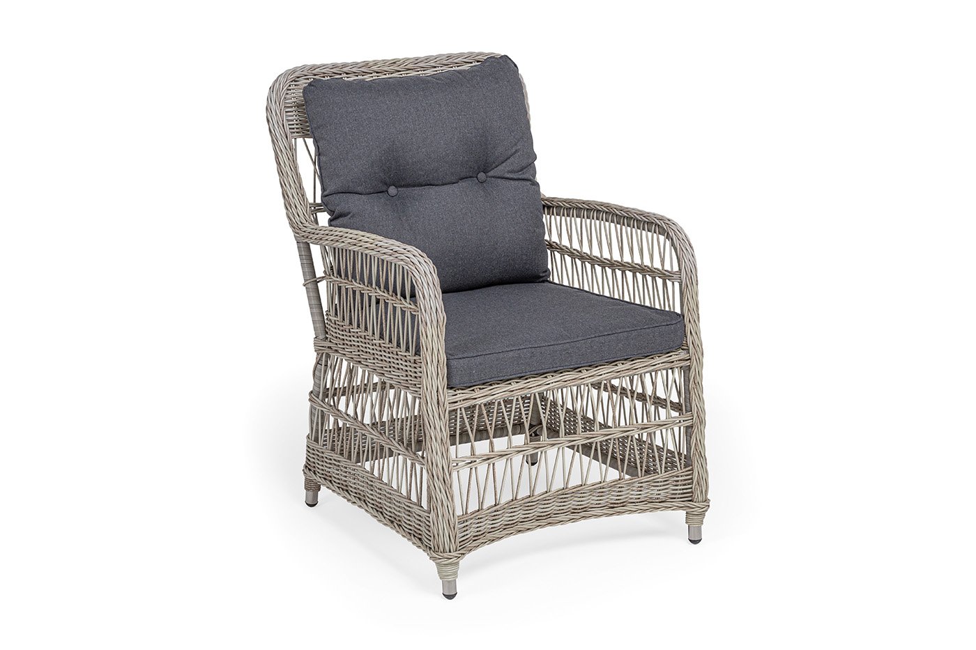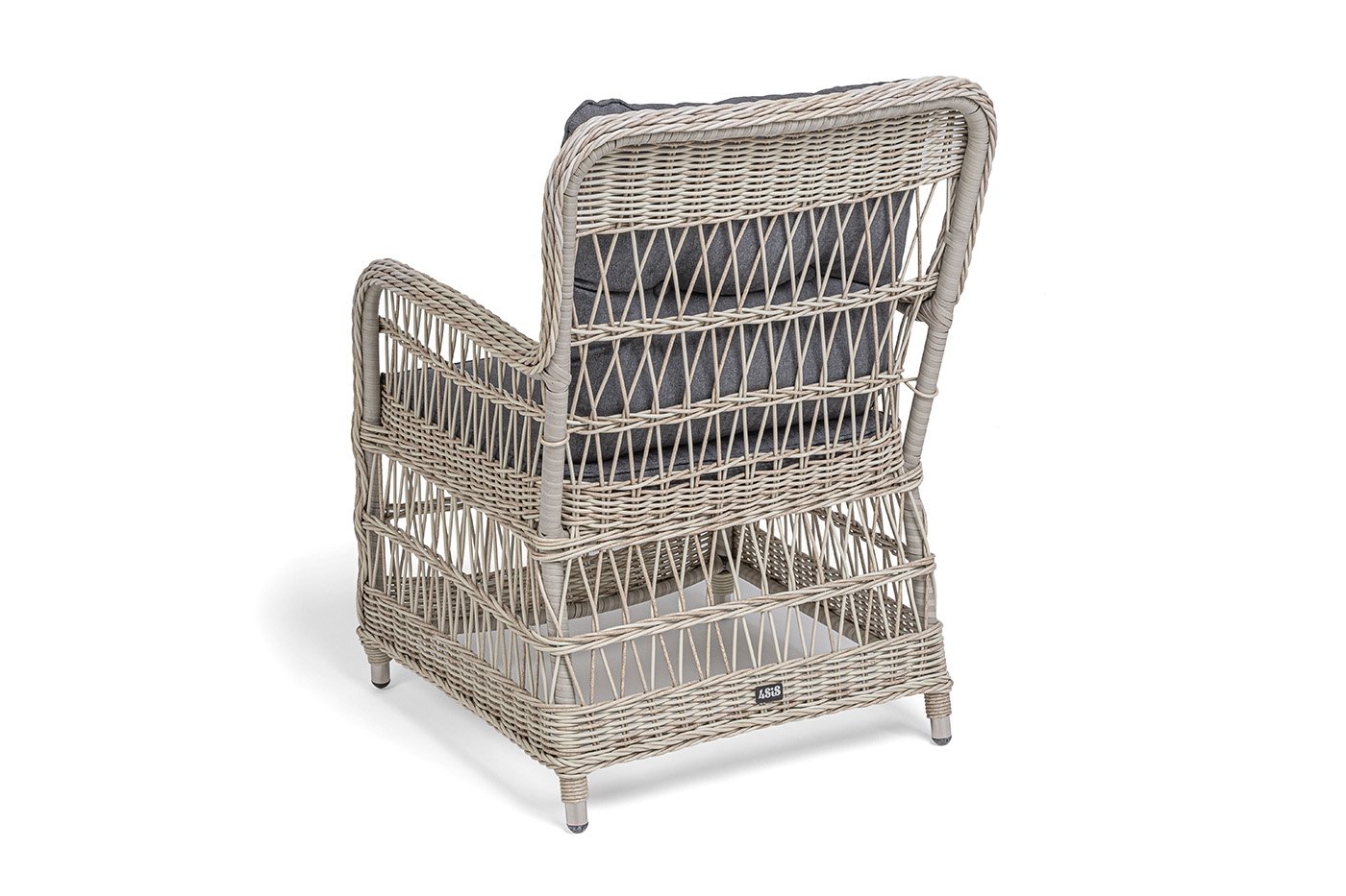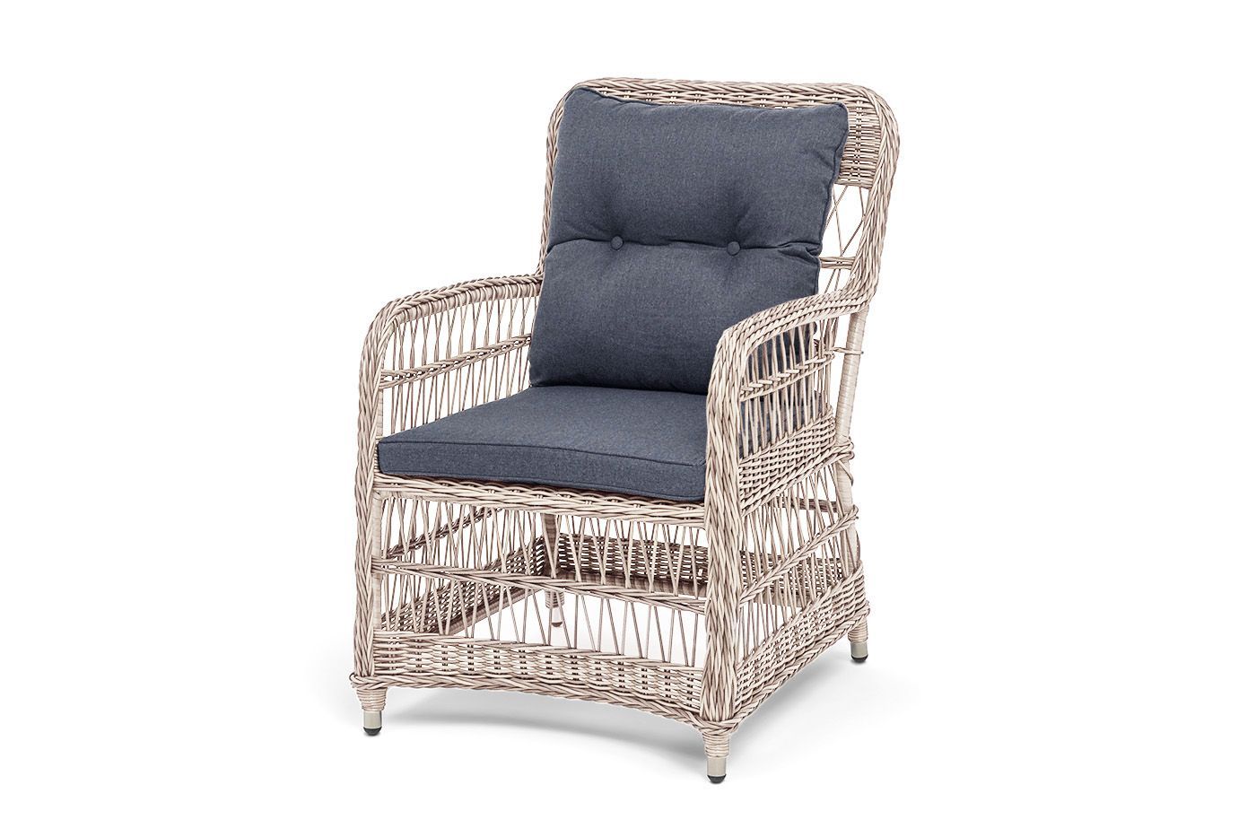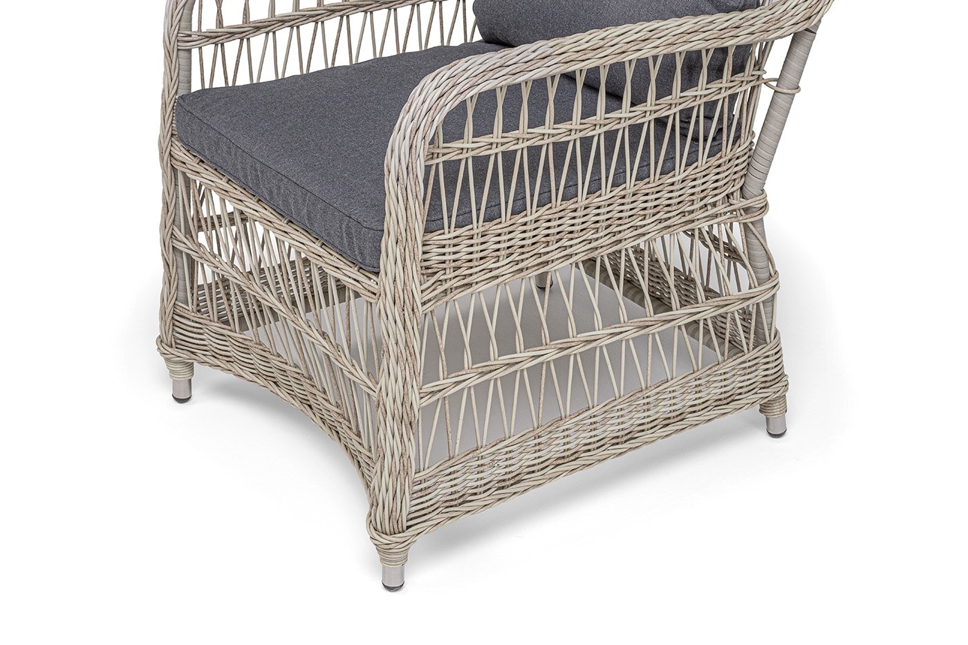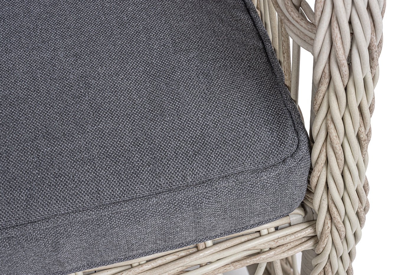 Садовое кресло располагает двумя мягкими подушками, которые идут в комплекте. Они выполнены в сером цвете. Полиэстер высокого качества используется при пошиве тканевых изделий. Его плотность 300гр/м2. Ткань обрабатывается влагоотталкивающей пропиткой.