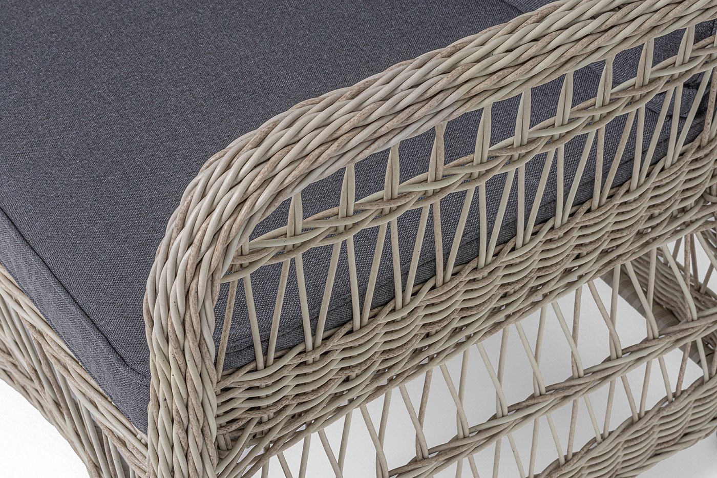 Алюминиевый каркас находится в основе мебели. Он характеризуется устойчивостью и высокой прочностью. Задекорирован ручной круглой оплеткой, которая сделана из искусственного ротанга. Представлена в бежевом оттенке.