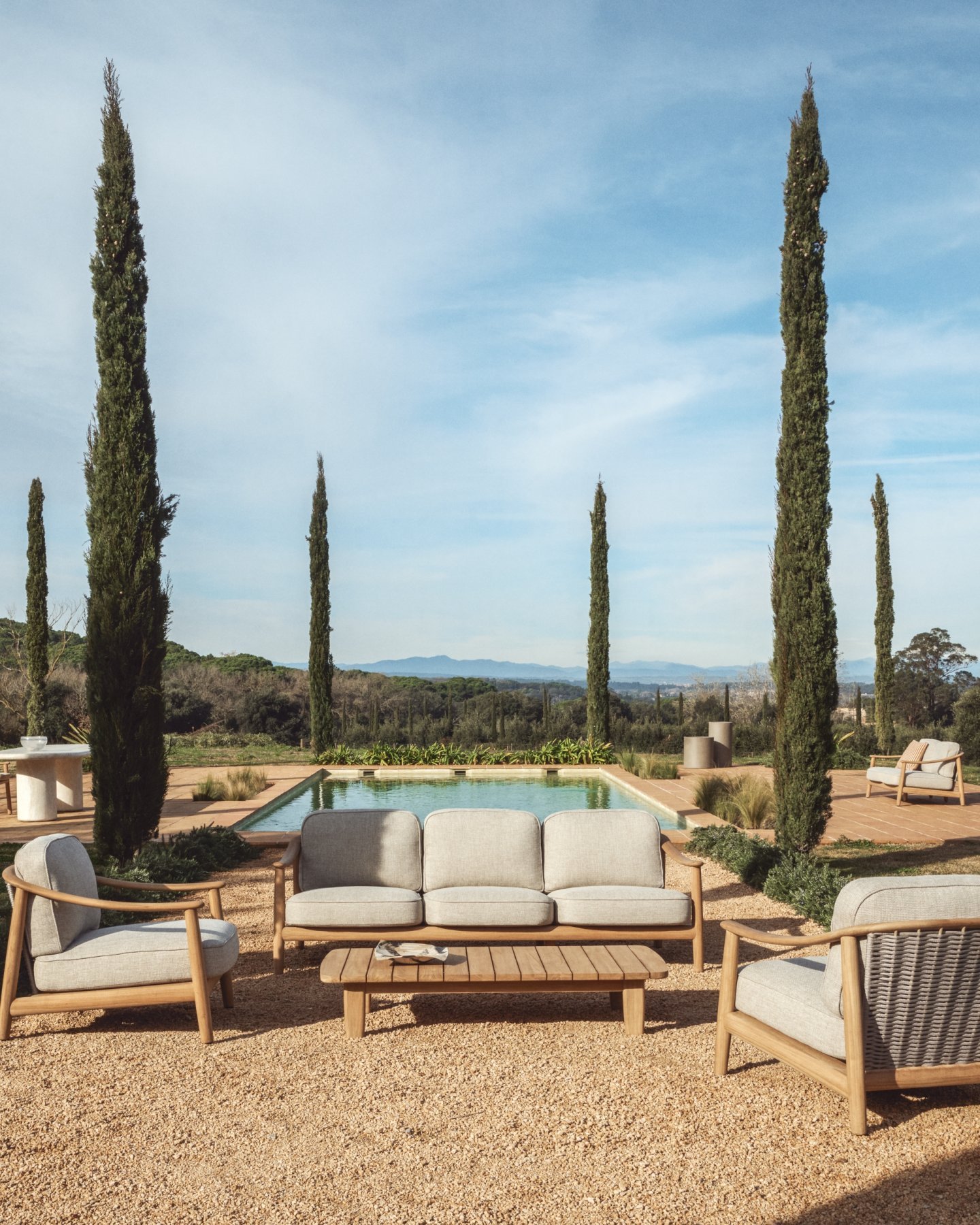 Коллекция Elunda включает в себя предметы мебели из массива тикового дерева, подходящие для использования на открытом воздухе и предназначенные для создания уютных пространств. Ее конструкция сочетает в себе плавные линии и спинку из плетеного вручную, устойчивого к УФ-излучению шнура, обеспечивающего комфортную поддержку. Подушки имеют съемные чехлы и изготовлены из сетчатого пеноматериала, который пропускает воду и способствует быстрому высыханию, что позволяет использовать их на открытом воздухе в течение длительного времени. Коллекция изготовлена из древесины, сертифицированной по стандарту FSC™ 100%, полученной из ответственно управляемых лесов.