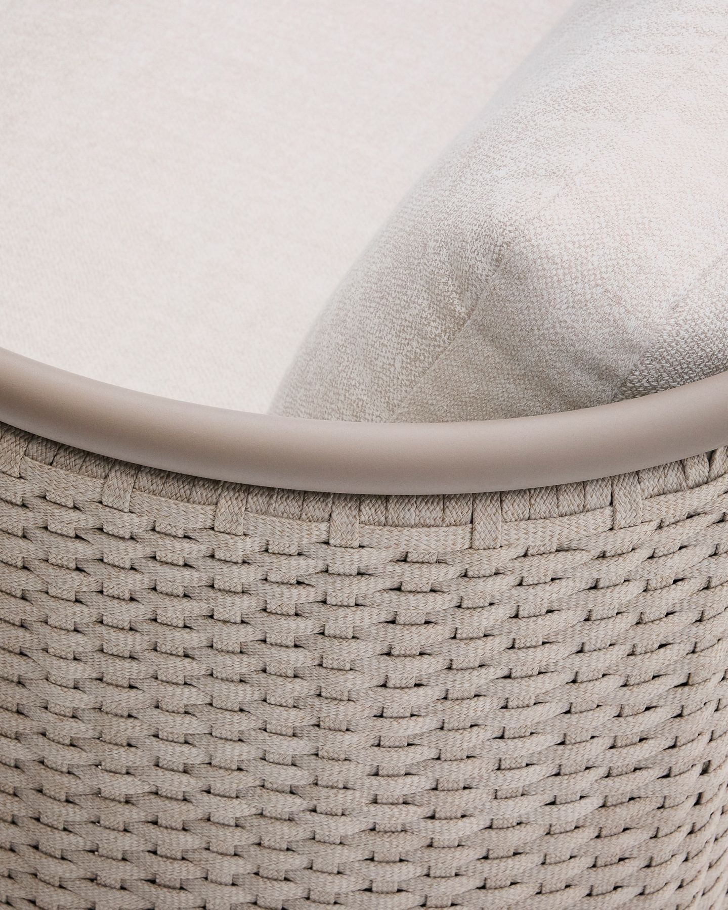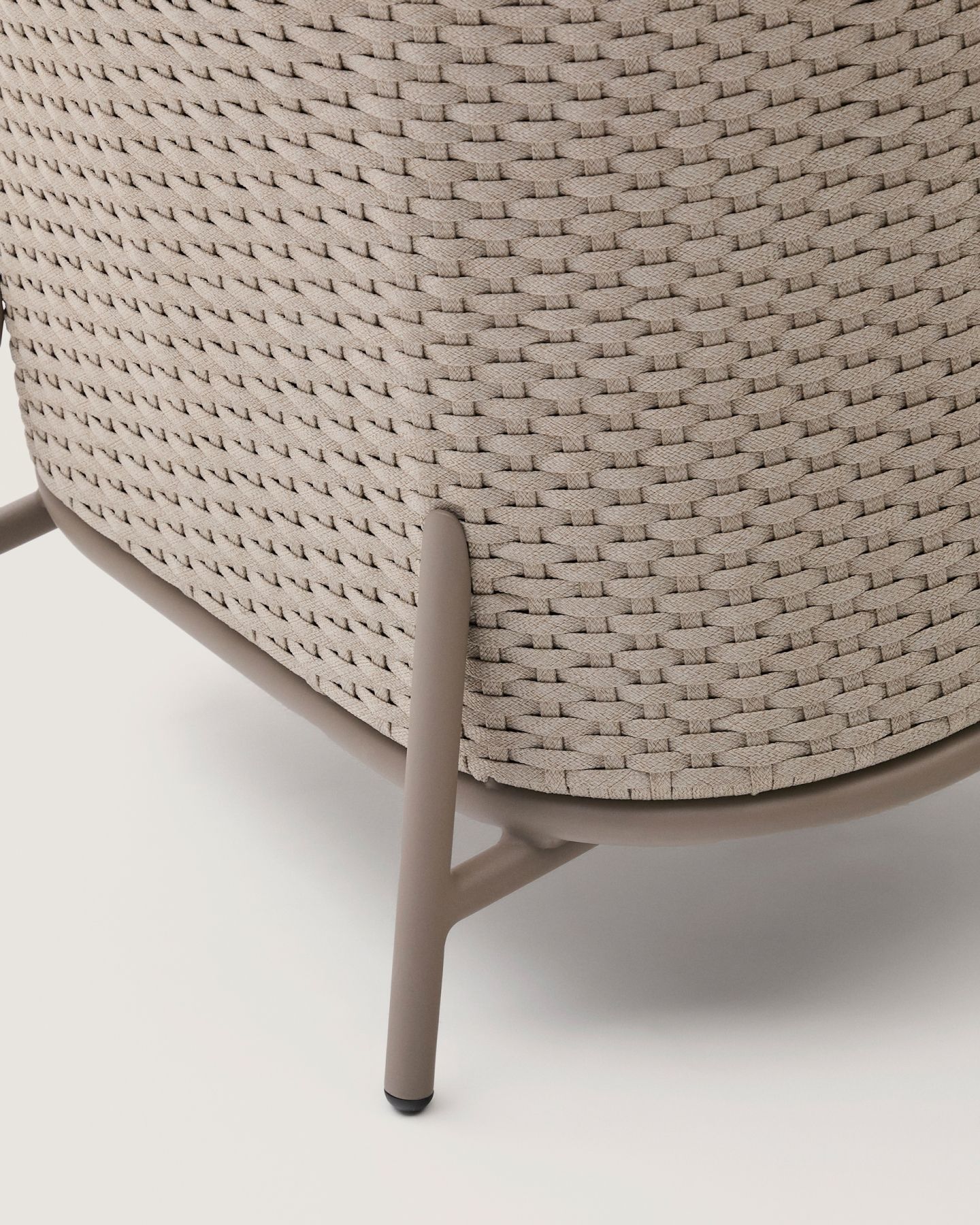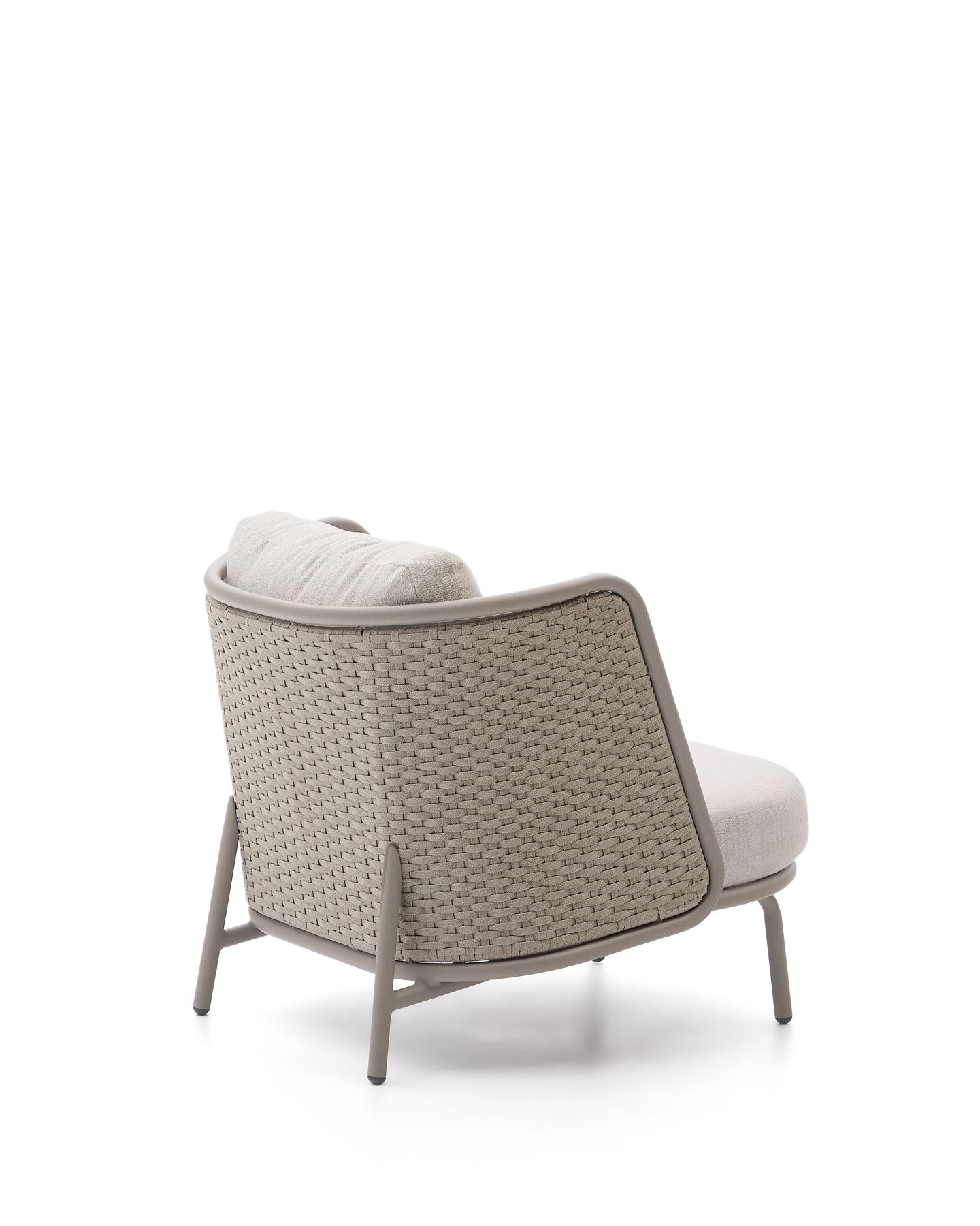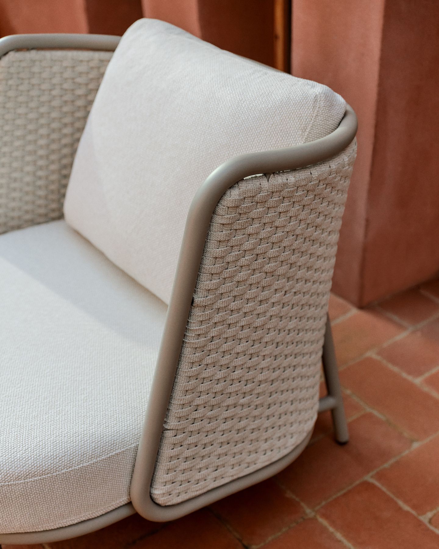 С алюминиевой конструкцией и сиденьем и спинкой из веревочного шнура, устойчивыми к УФ-излучению, сплетенного вручную, он выделяется своим легким и современным дизайном. Инновационный процесс E-Coating обеспечивает максимальную устойчивость к ржавчине и коррозии, что делает его идеальным для использования в помещении и на улице. Подушки съемные, водоотталкивающие и устойчивы к УФ-излучению. Кроме того, они изготовлены на 95% из переработанного материала и получены от сертифицированного поставщика Global Recycled Standard, что гарантирует снижение повреждений при производстве первичного материала. Для дополнительной заботы мы рекомендуем убирать их в дождливые дни.