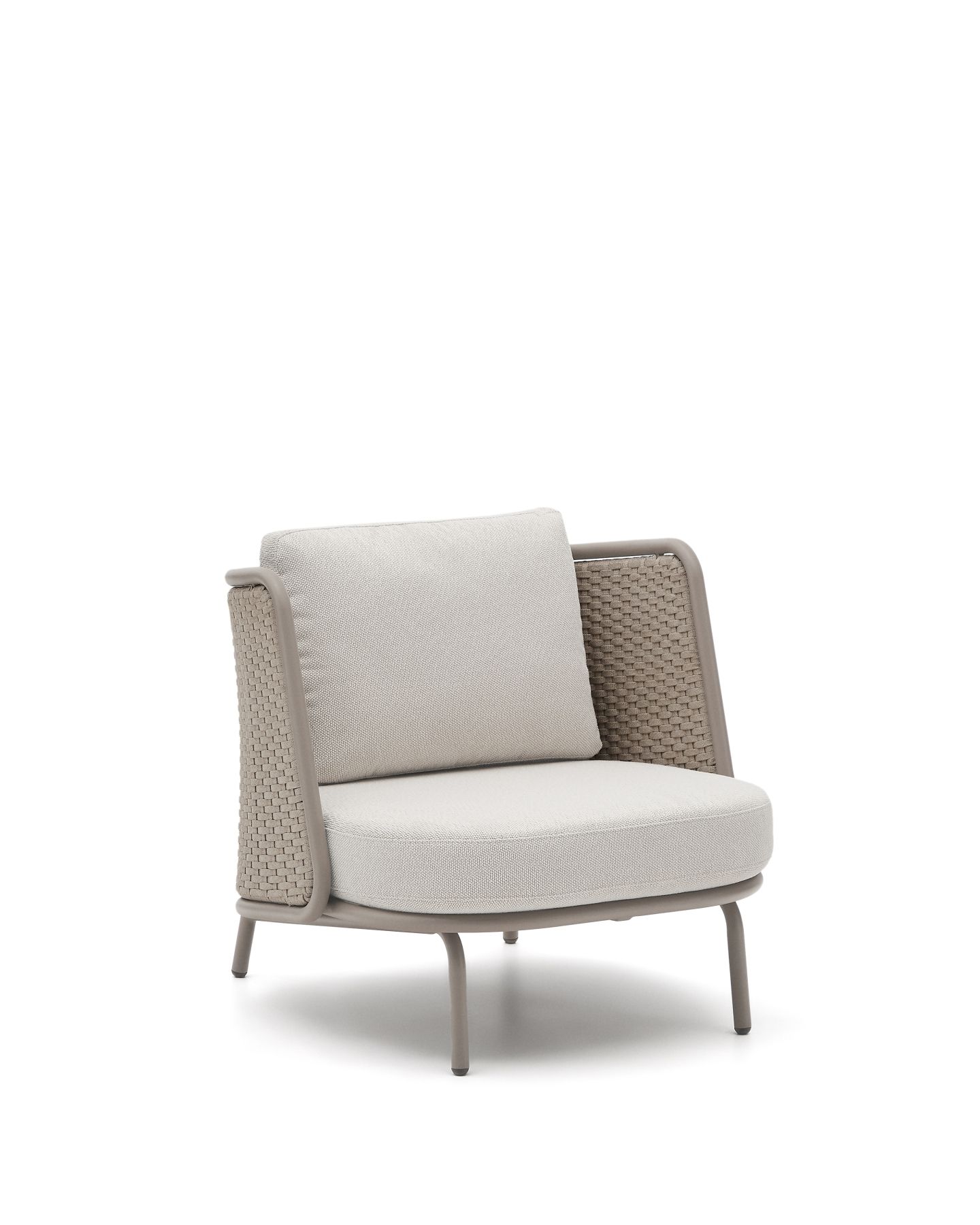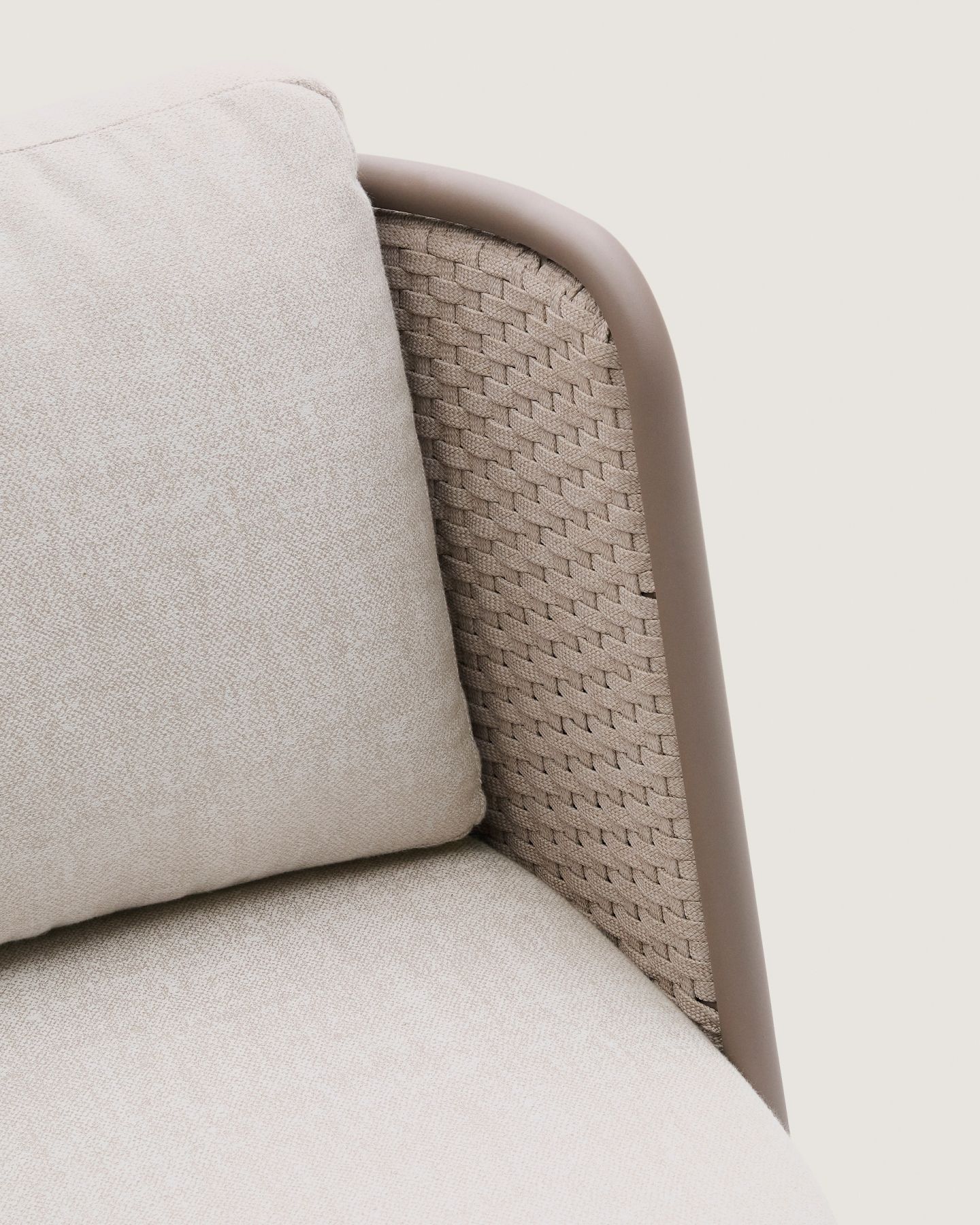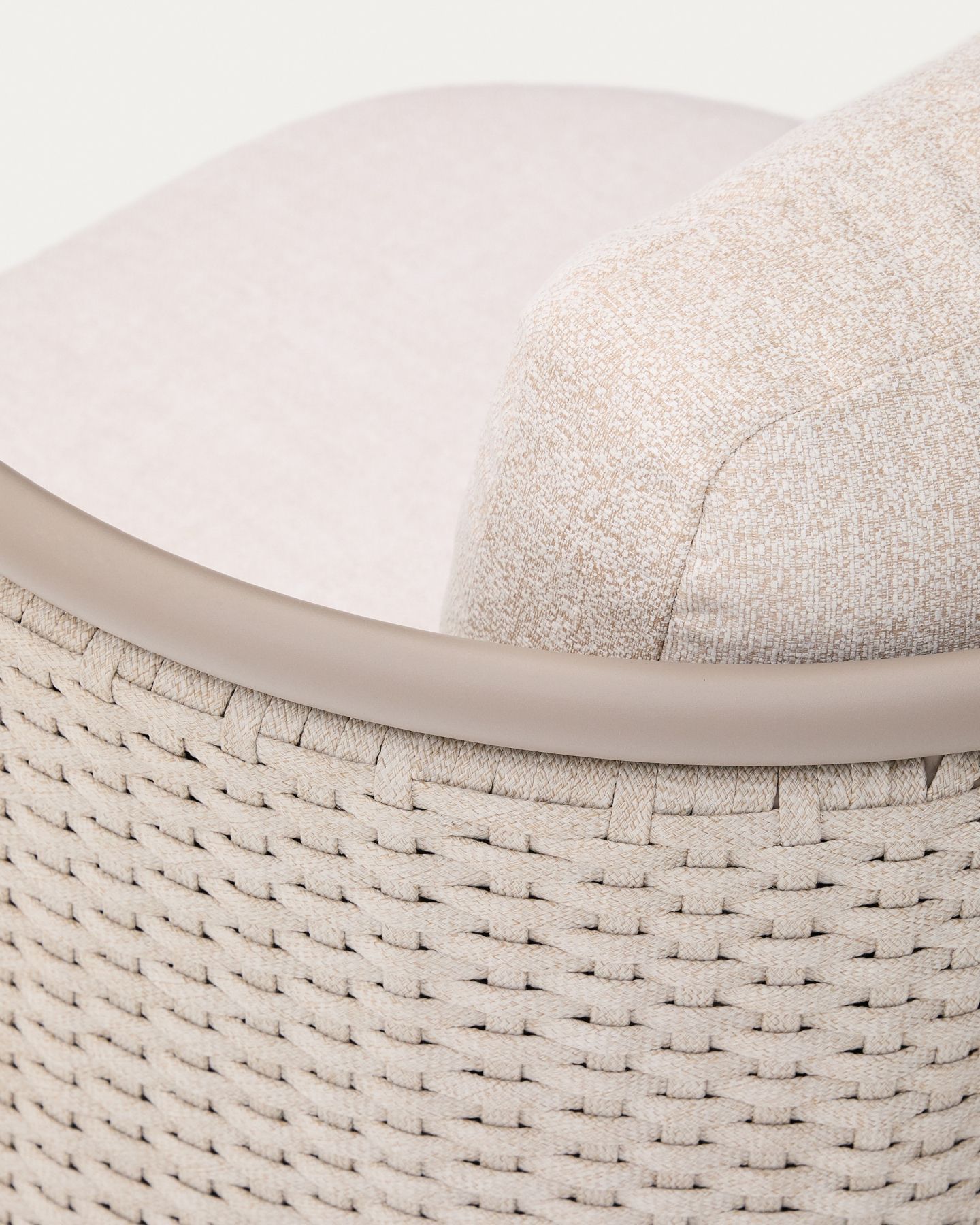 С алюминиевой конструкцией и сиденьем и спинкой из веревочного шнура, устойчивыми к УФ-излучению, сплетенного вручную, он выделяется своим легким и современным дизайном. Инновационный процесс E-Coating обеспечивает максимальную устойчивость к ржавчине и коррозии, что делает его идеальным для использования в помещении и на улице. Подушки съемные, водоотталкивающие и устойчивы к УФ-излучению. Кроме того, они изготовлены на 95% из переработанного материала и получены от сертифицированного поставщика Global Recycled Standard, что гарантирует снижение повреждений при производстве первичного материала. Для дополнительной заботы мы рекомендуем убирать их в дождливые дни.