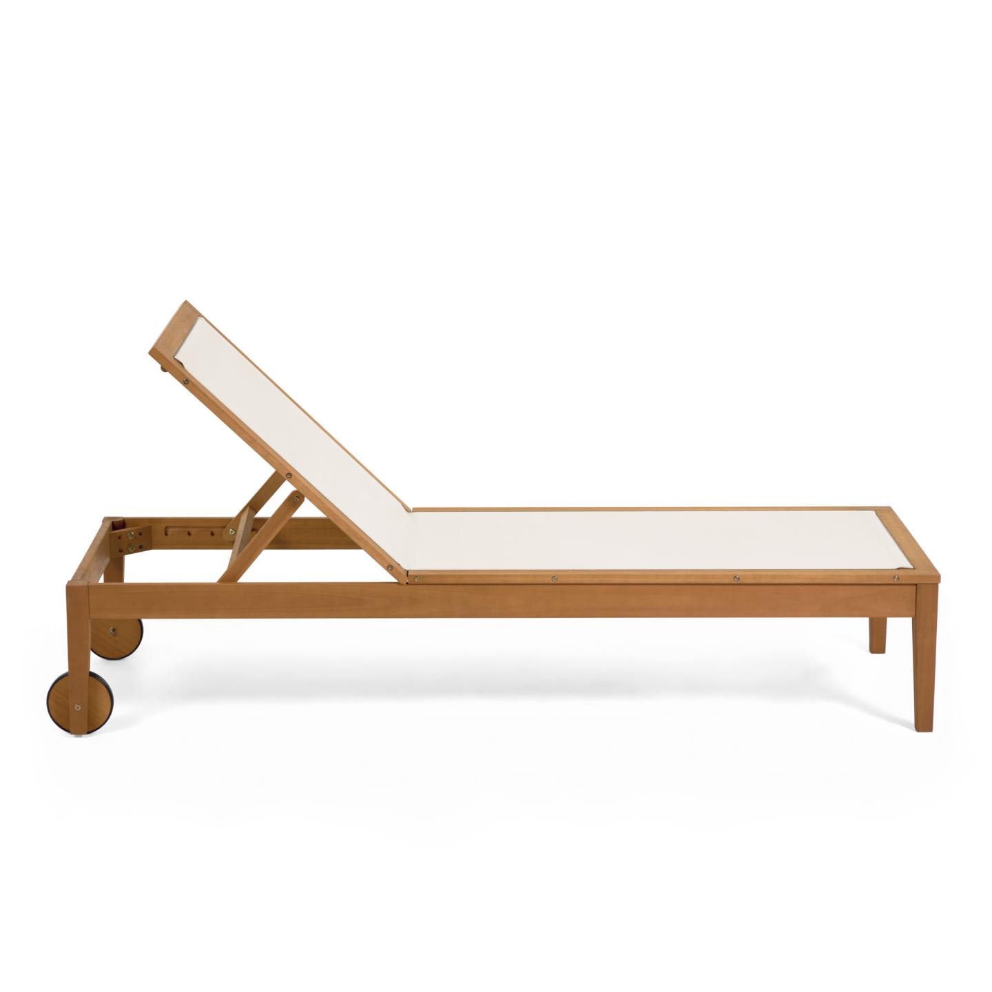 Шезлонг Caterin из эвкалипта от фабрики La Forma (ex Julia Grup) – позвольте себе красивый отдых у бассейна. Шезлонг Caterin сочетает в себе два важных свойства – это уникальную красоту эвкалипта и практичность верхнего покрытия. Такое изделие не смутят прямые солнечные лучи и брызги из бассейна. Поэтому наслаждайтесь уикендом возле дома в полном комфорте, в любом положении тела. Шезлонг полностью выполнен из массива эвкалипта. Древесина покрыта лаком цвета тикового дерева, который защищает ее от негативного воздействия влаги и солнца. Конструкция включает задние колеса диаметром 15 см, которые окантованы пластичными шинами для защиты древесины от деформации и улучшения динамики. Благодаря им, вы сможете легко перекатывать шезлонг, почти не прилагая физических усилий. Передние ножки сделаны в виде квадратных брусков с шириной грани 5 см. Спинка регулируется по высоте. Верхнее покрытие представляет собой синтетическую плотную сетку темно-зеленого или молочного цвета (зависит от выбранной модели). Она не портится от влаги, не теряет цвет от воздействия солнечных лучей, простая в уходе. Допустимая весовая нагрузка на шезлонг – 130 кг. Размеры: ширина – 70 см, высота – от 70 до 94 см (зависит от положения спинки), глубина – 200 см, глубина сиденья – 120 см. Вес изделия – 14 кг. Потребуется самостоятельная сборка. Инструкция и крепеж включены в комплектацию.