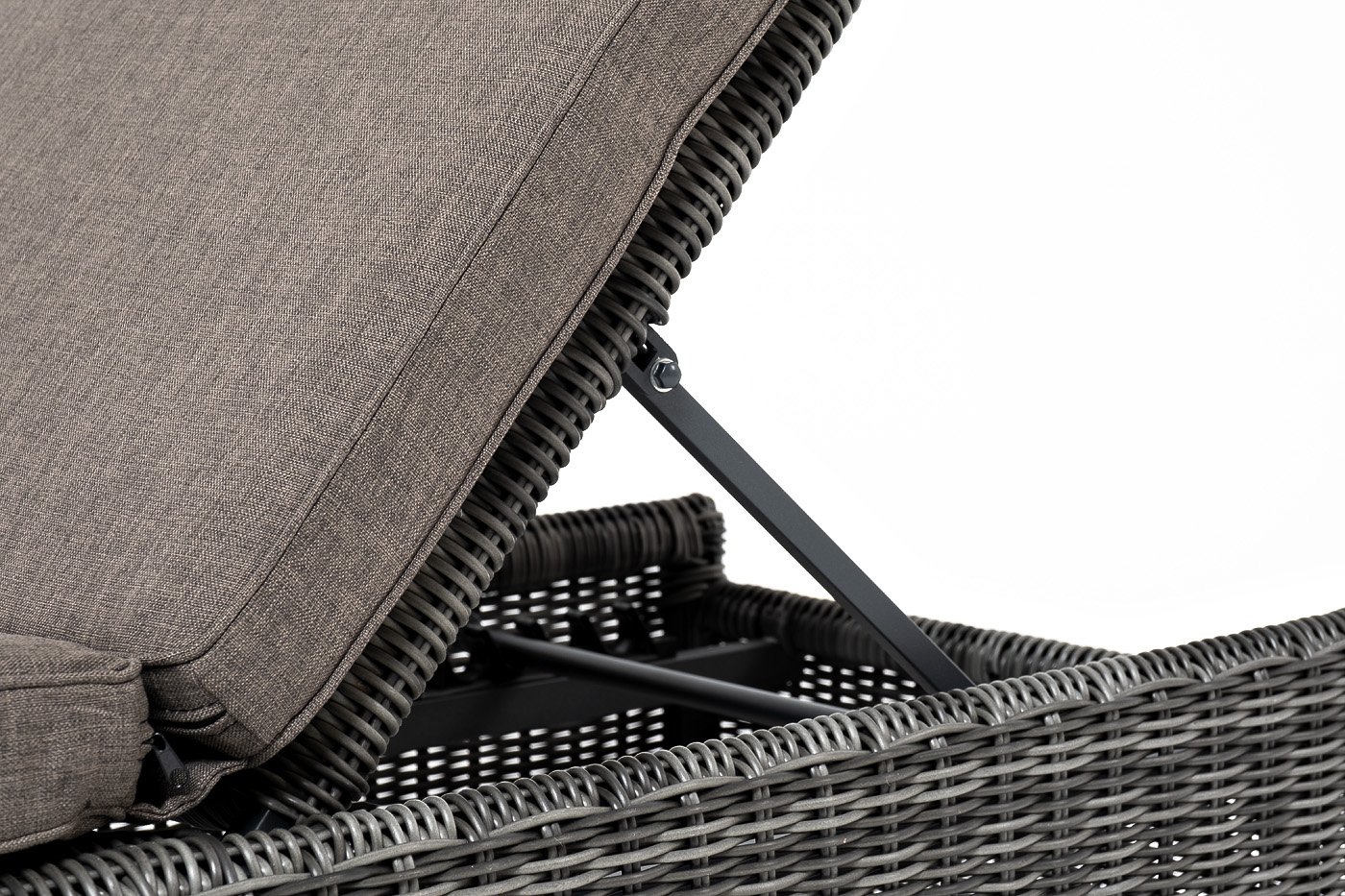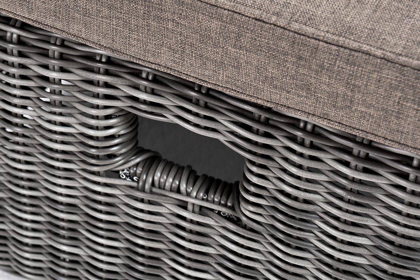 Мебельные изделия выполнены из круглого искусственного ротанга графитового цвета. Легкость и прочность обеспечивает каркас из алюминия, который способен выдержать до 150 кг.