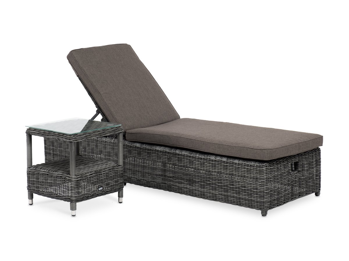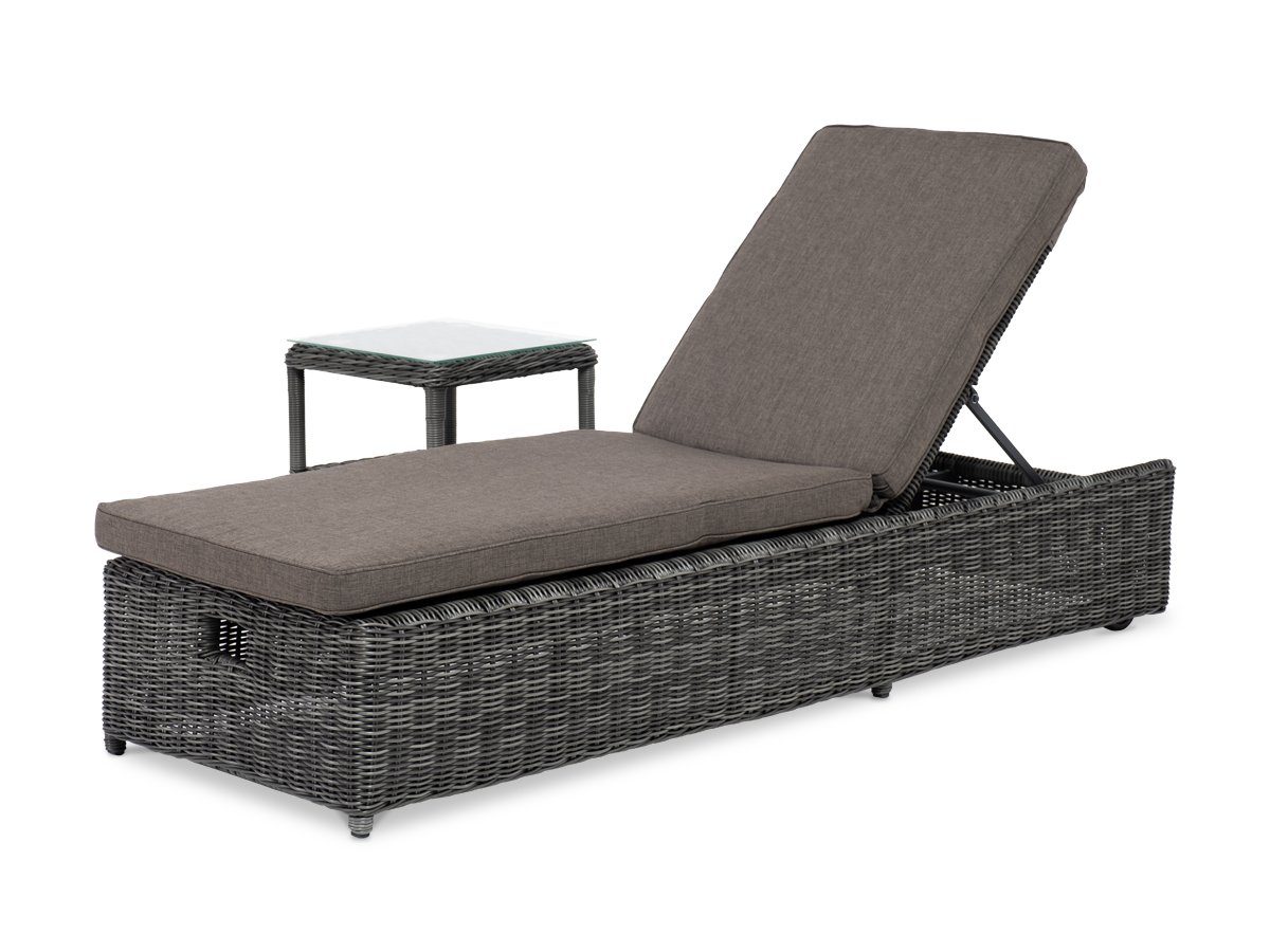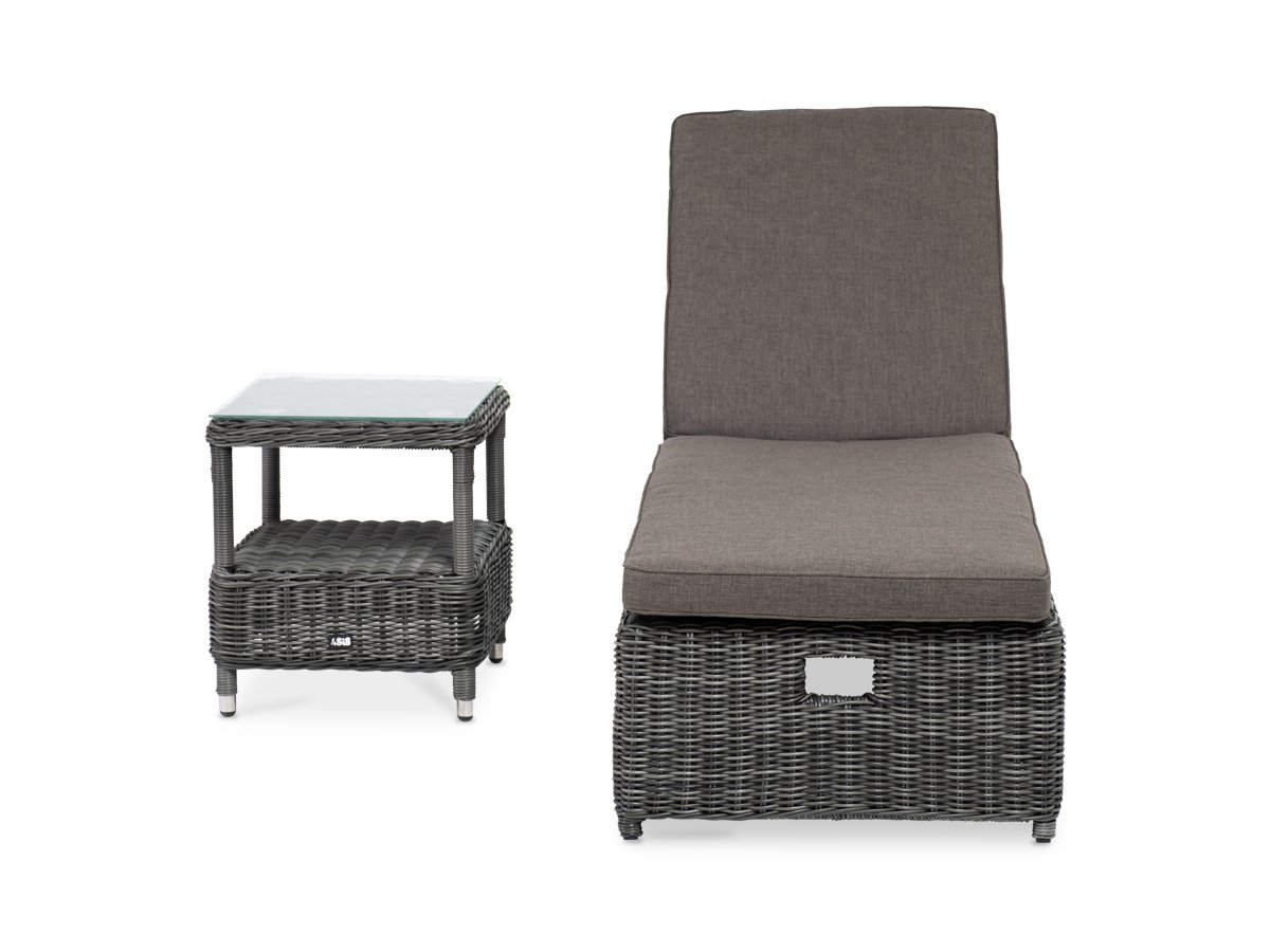 Дополнительно к шезлонгу прилагаютс "Рим" шезлонг с подушкой, цвет графит 1шт. 1 990Х660Х310, "Форио" столик кофейный из искусственного ротанга, цвет графит 1шт. 450Х450Х520,