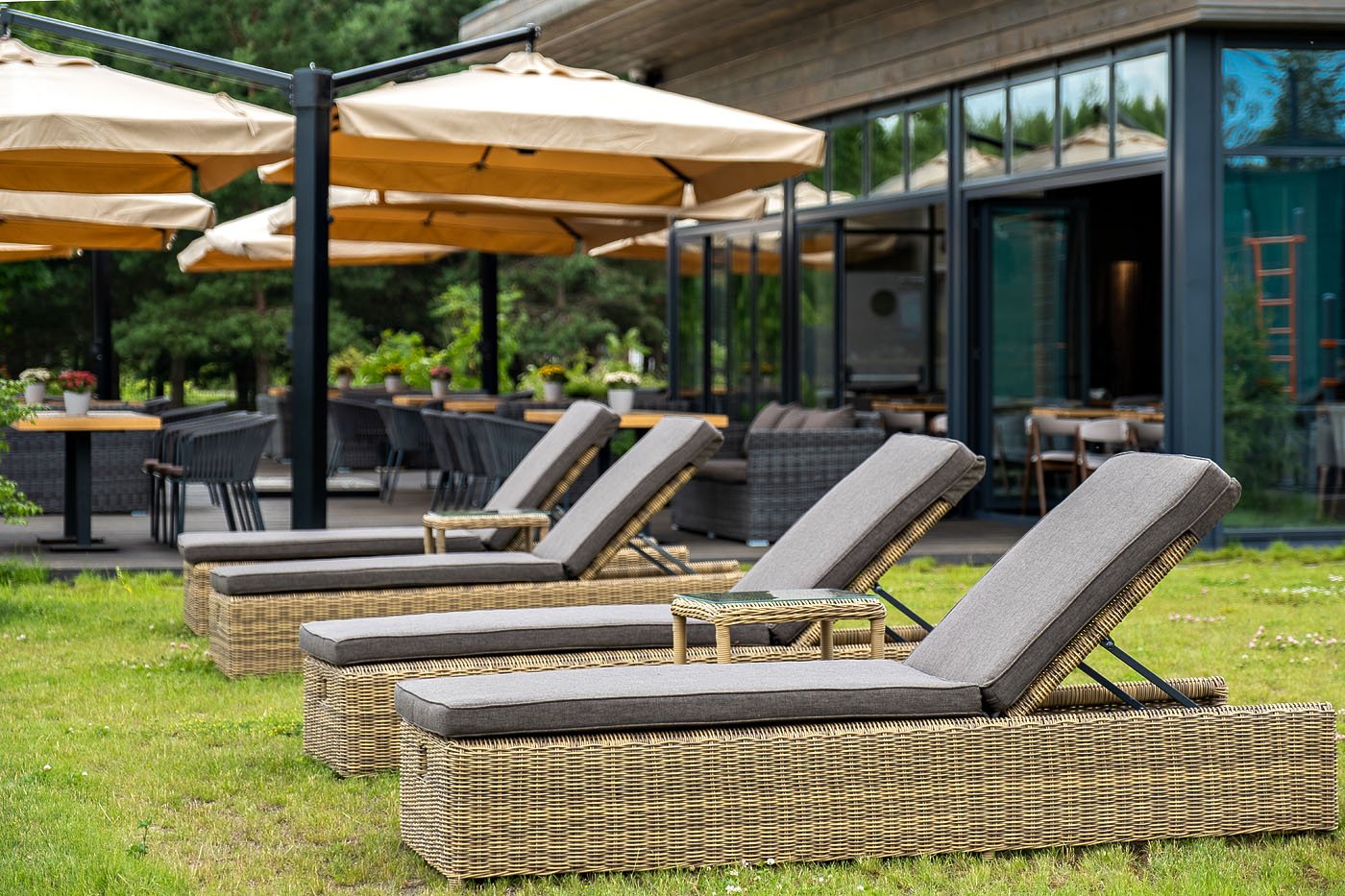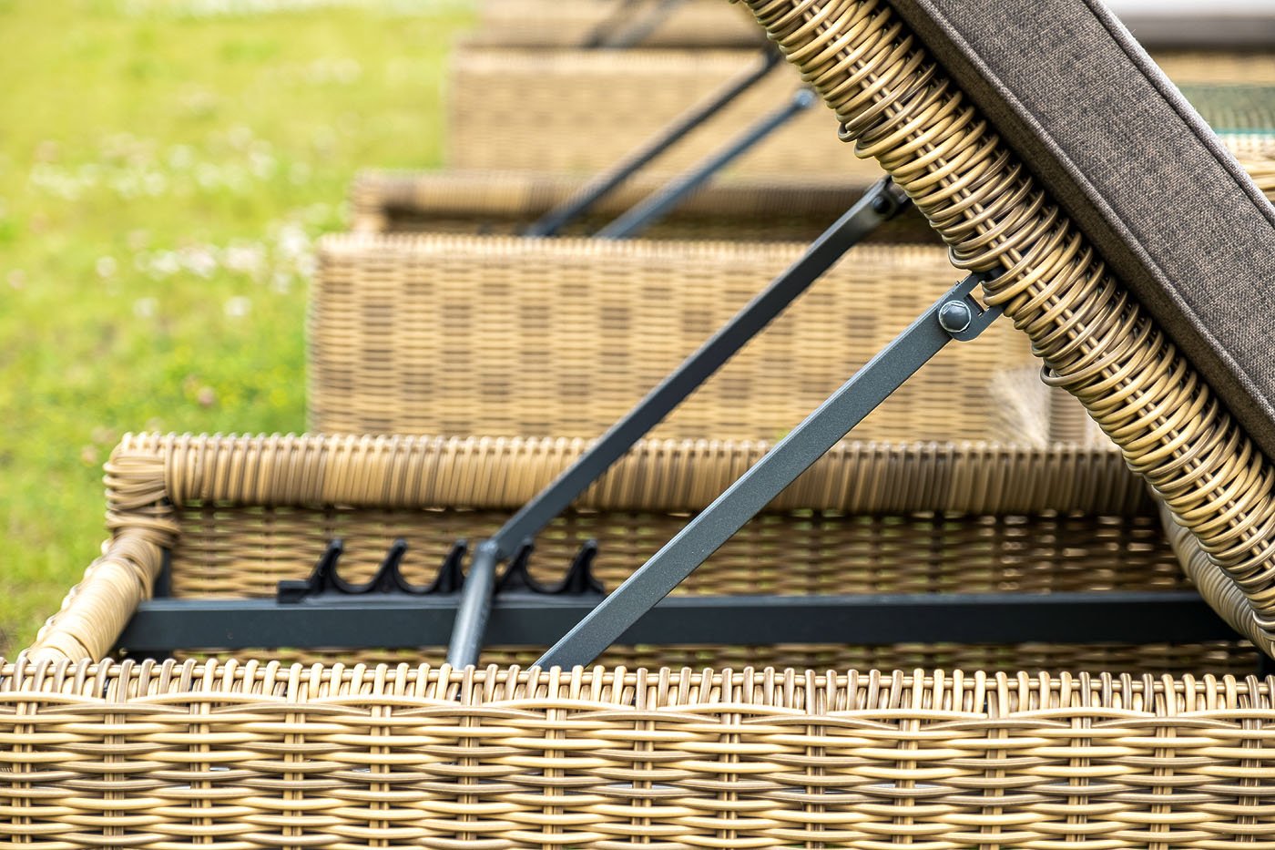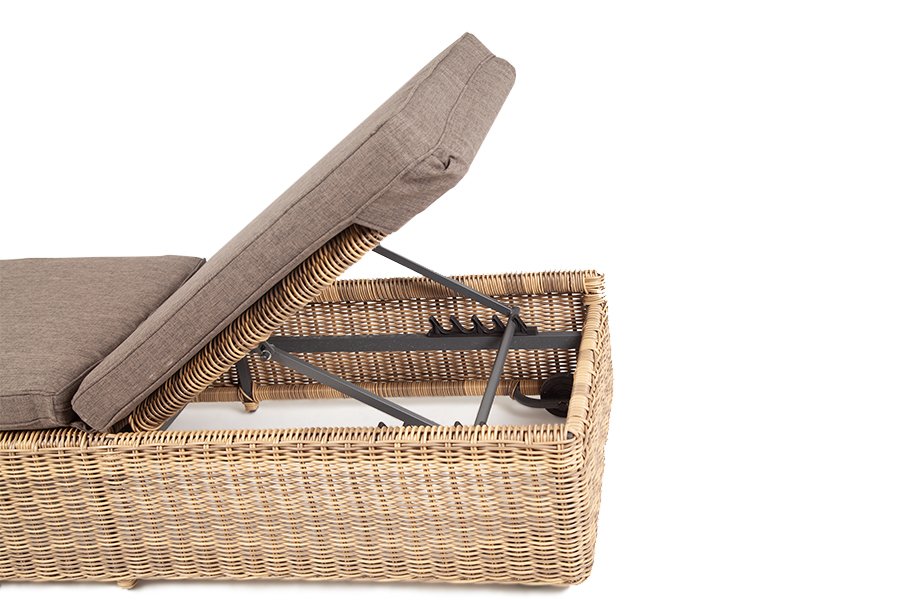 Есть несколько пазов, благодаря которым можно поднимать или опускать спинку. Также комфорт обеспечивает мягкий матрас. Съемный чехол серо-коричневого цвета изготовлен из 100%-го полиэстера с водоотталкивающим эффектом. Мебель оплетена вручную.